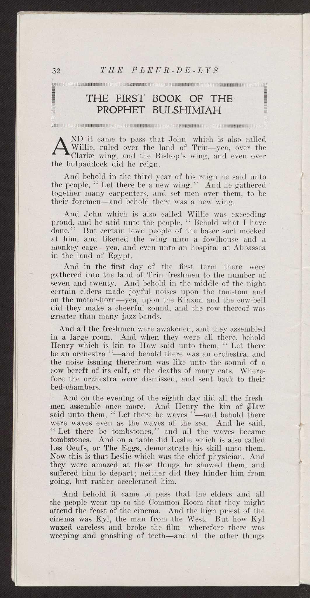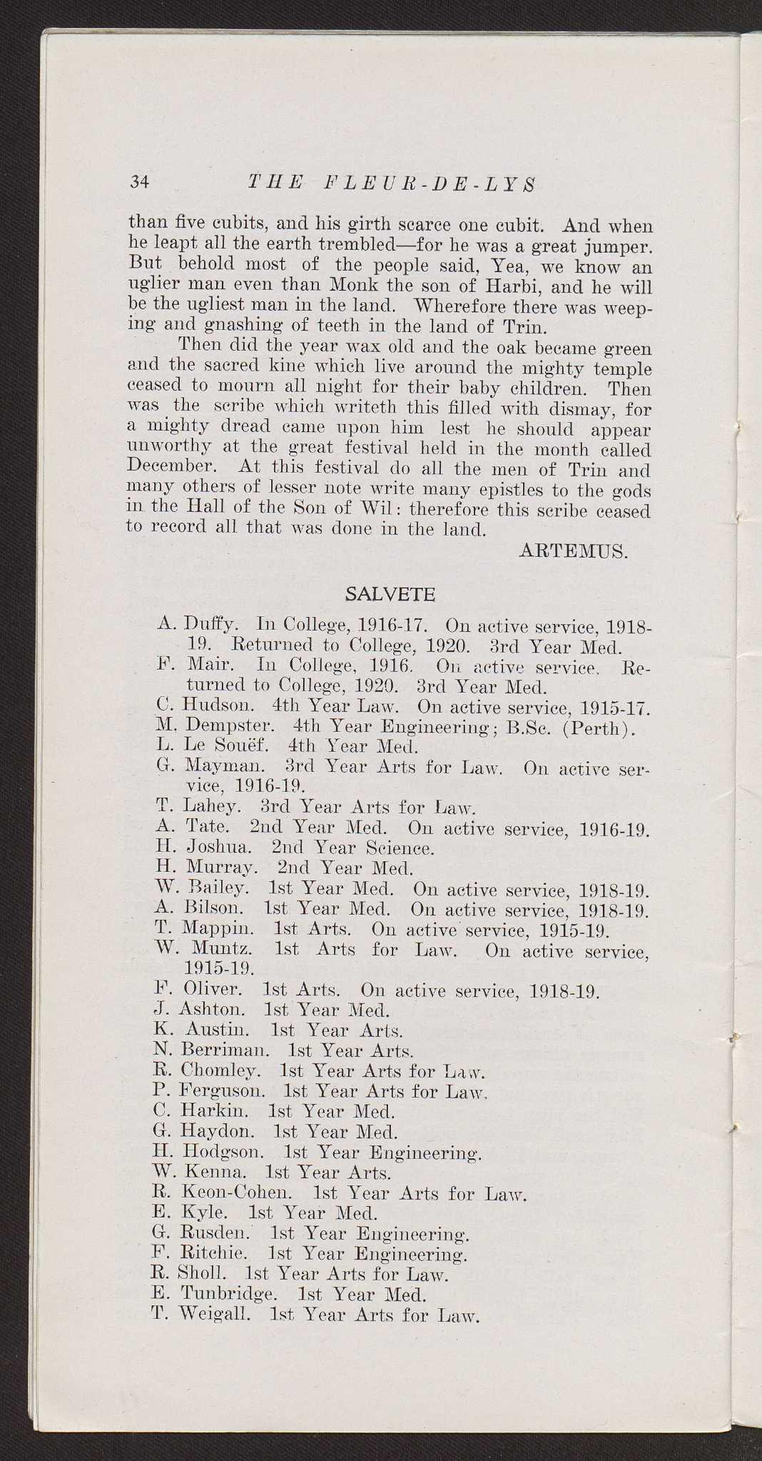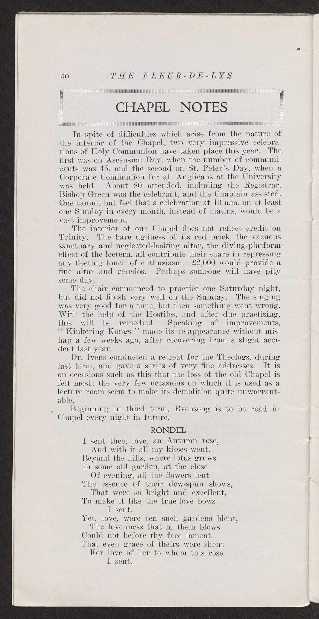 The Editors offer this, the latest issue of the Fleur-deLys, to those who read it without apology. The supply of material has been plentiful, owing, no doubt, to the fusion of the two issues which were to have been printed. One feature of the number is worthy of note ; for the first time a black-and-white drawing has been published. We hope that the supply for next year's issues will be forthcoming when required, without undue pressure from our successors in office. There is no need to let unimportant matters like grammar, spelling or punctuation deter you. The Editors have a dictionary and a copy of the " King's English."