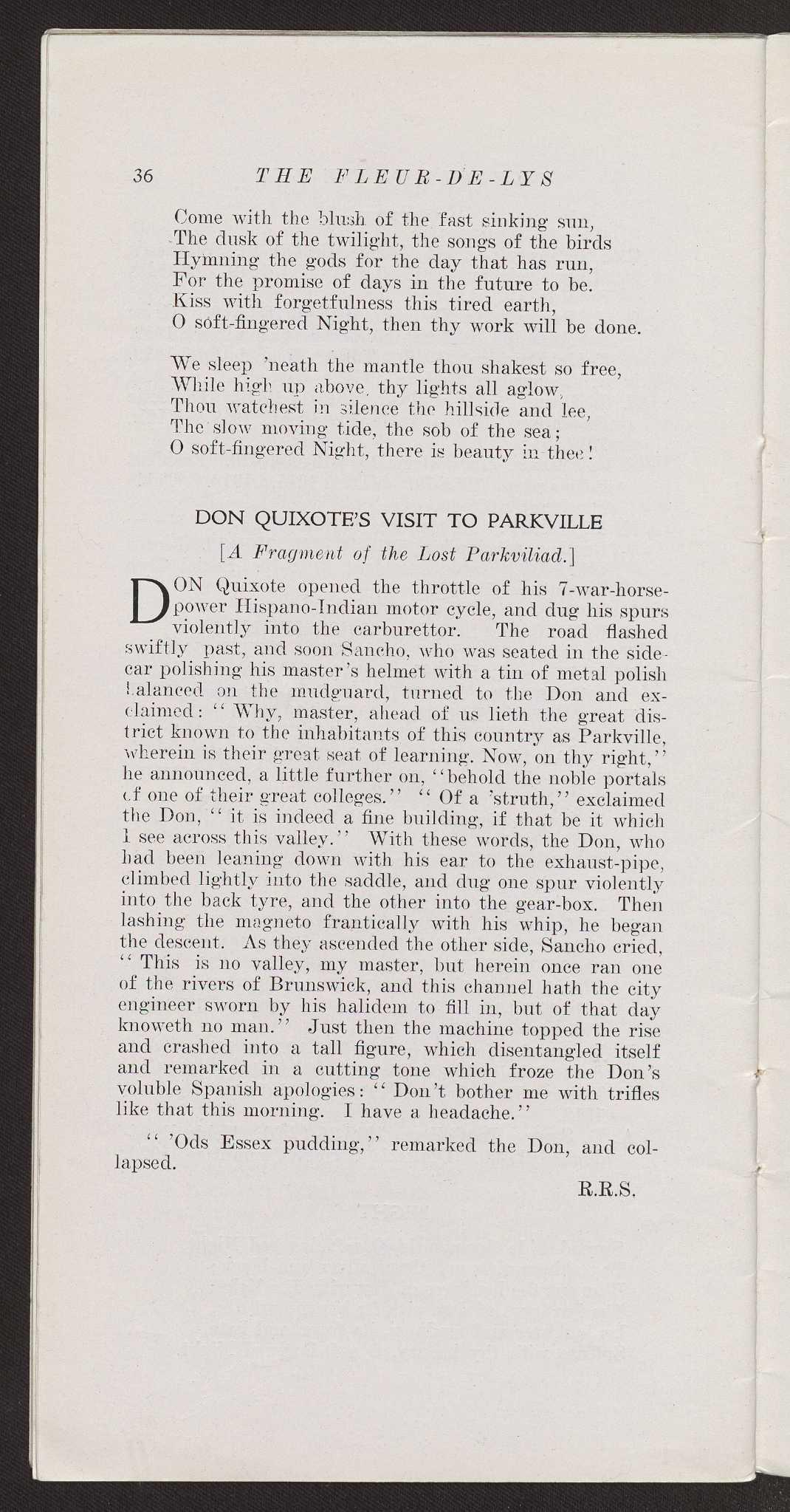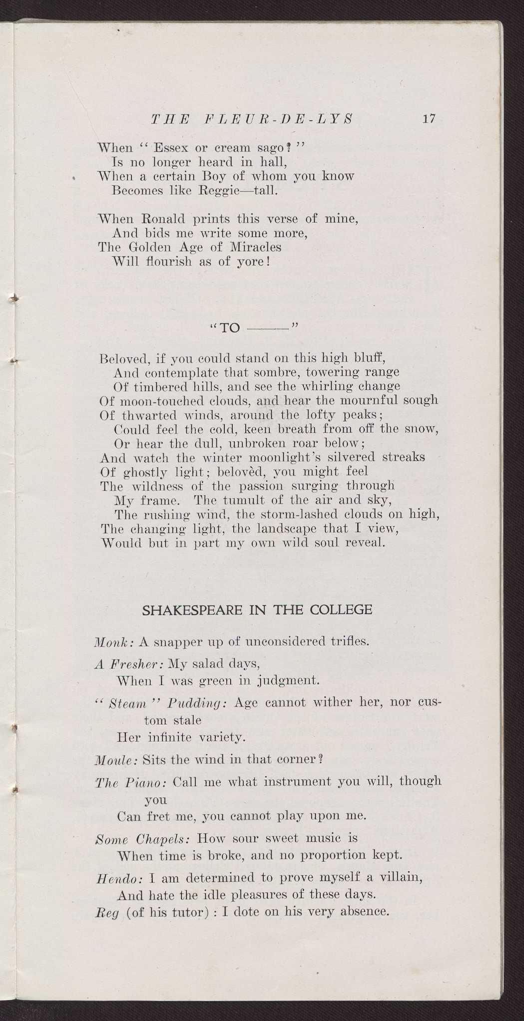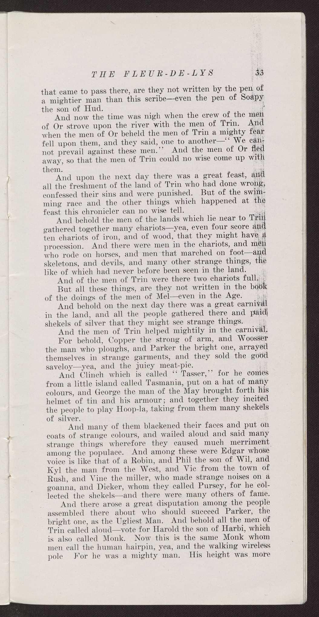 The Editors offer this, the latest issue of the Fleur-deLys, to those who read it without apology. The supply of material has been plentiful, owing, no doubt, to the fusion of the two issues which were to have been printed. One feature of the number is worthy of note ; for the first time a black-and-white drawing has been published. We hope that the supply for next year's issues will be forthcoming when required, without undue pressure from our successors in office. There is no need to let unimportant matters like grammar, spelling or punctuation deter you. The Editors have a dictionary and a copy of the " King's English."