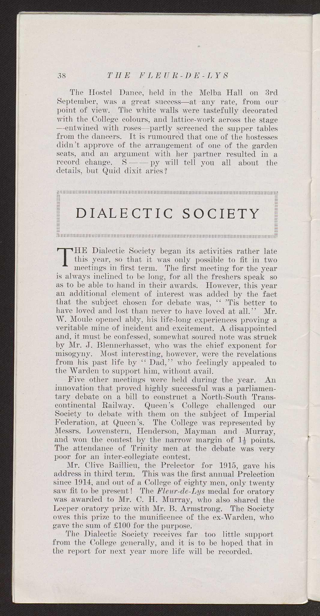 The Dialectic Society held regular meetings through the term. A team from Trinity met the representatives of the William Quick Club, Queen's College, in a challenge debate, and defeated them. A ladies' night was held shortly before the vacation, and proved a great success. The President's medal for oratory has been won this year by Mr. C. H. Murray, and the Leeper Prize was divided between Messrs. Murray and Armstrong.