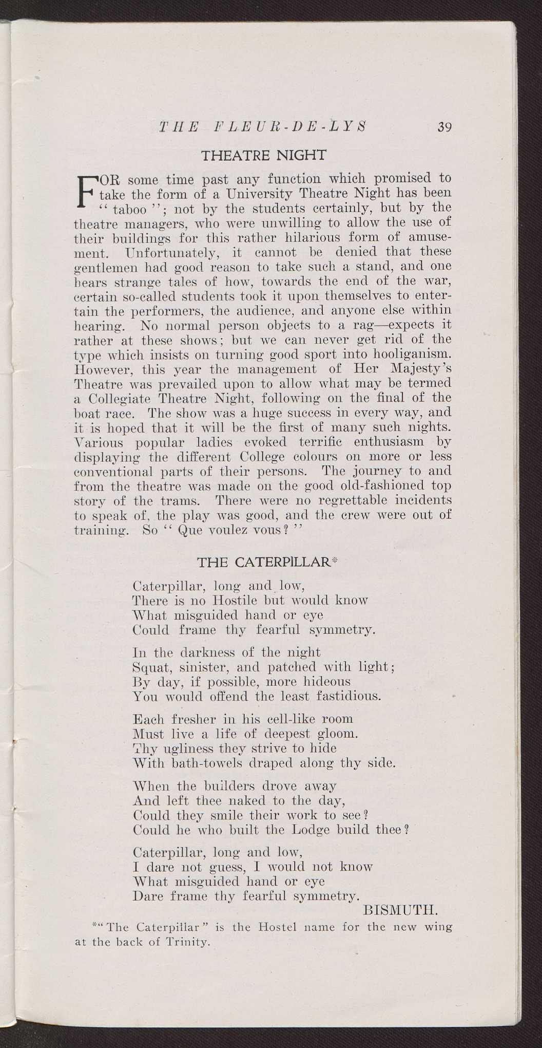 Under yonder oak tree, single on the greensward, Couched with their arms beneath their heavy heads, Watching there and waiting to see the Hostiles passing Lie all Trinity—Science, Arts and Meds. Has but one the pluck to hail a passing maiden, Lead her to the turnstile and whisper in her ear, Shouts and yells and whistlings and other horrid noises Echo round the Bulpaddock for all the world to hear.