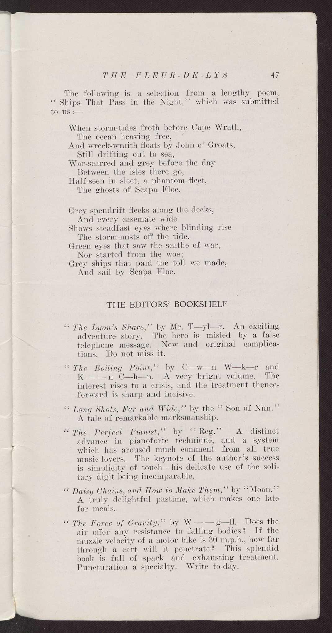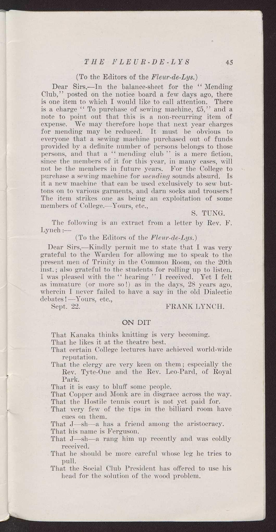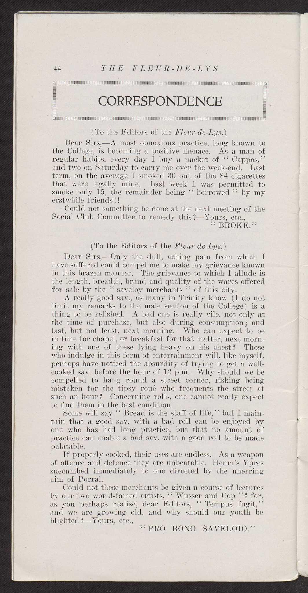 the Editors to the Editors which they answer at the same time finishes a good evening's work. Thus in one evening you are no less than four persons, which certainly entitles you to the title " We." All this is merely to emphasise the point that everyone in College should attempt to make the Fleur de Lys a true reflection of the College mind, and not the creation of the Editors, assisted by some seven or eight people.