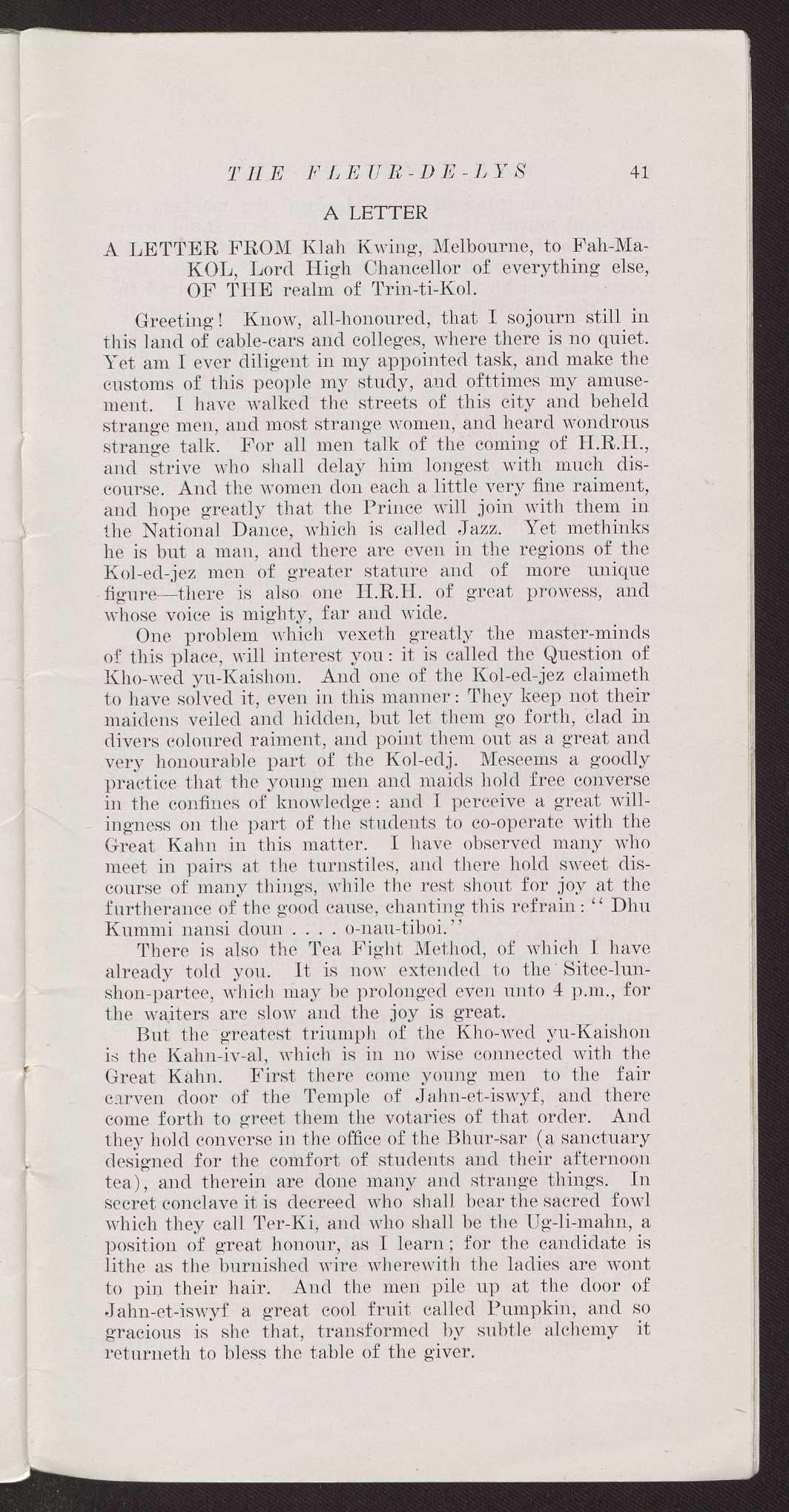 A LETTER FROM Klah Kwing, Melbourne, to Fah-MaKOL, Lord High Chancellor of everything else, OF THE realm of Trin-ti-Kol.