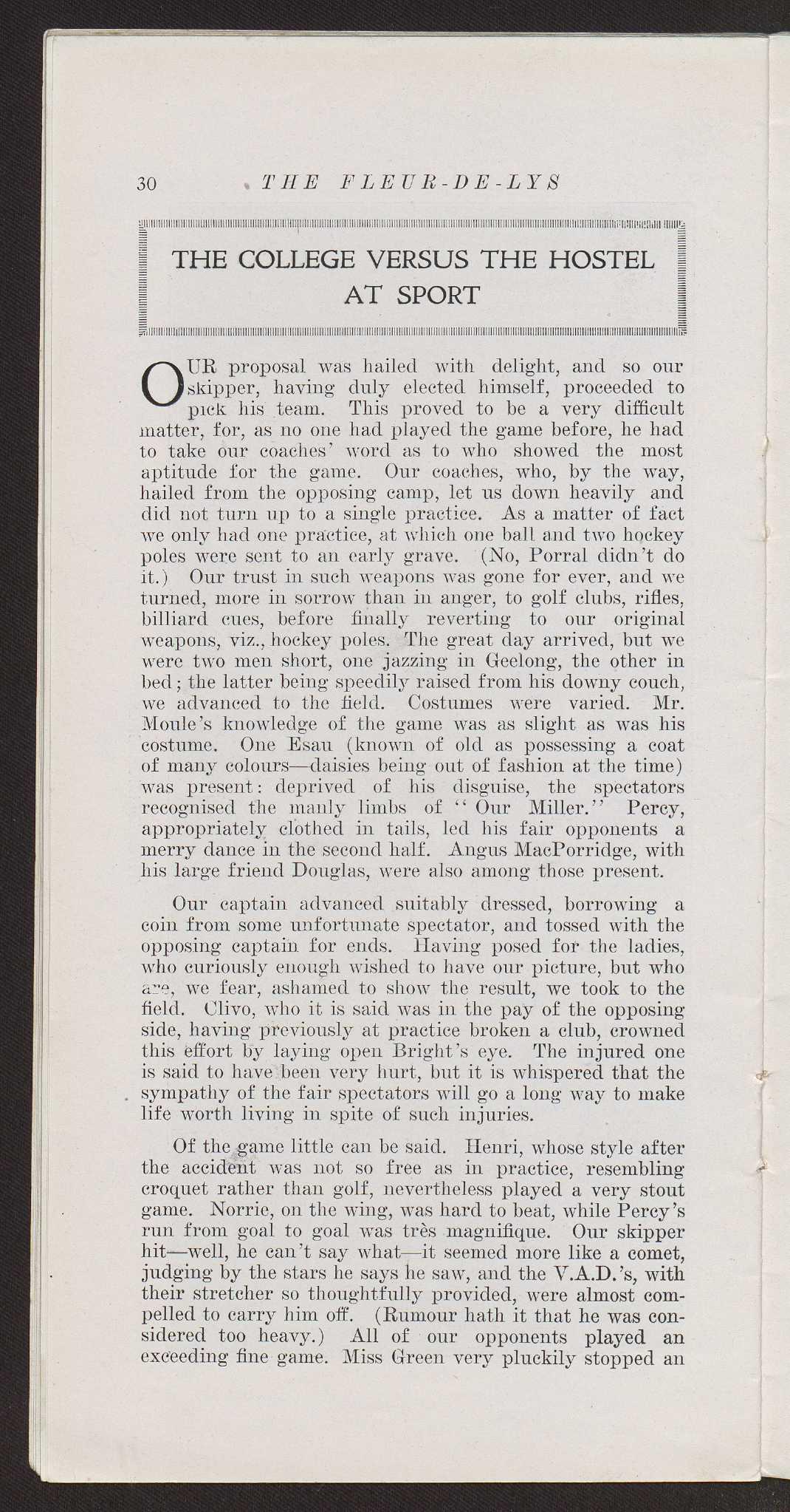 The only inter-collegiate sporting fixture falling within the limits of our report was the football match. The College - was drawn to play Ormond. Ormond won, but not without a fight that will live long in the minds of those who witnessed it. A word of praise is due to S. Plowman, who, in the absence of J. Hasker, very efficiently captained the team; and to E. J. Robin, whose enthusiasm and perseverance went far towards the making of the Trinity side.