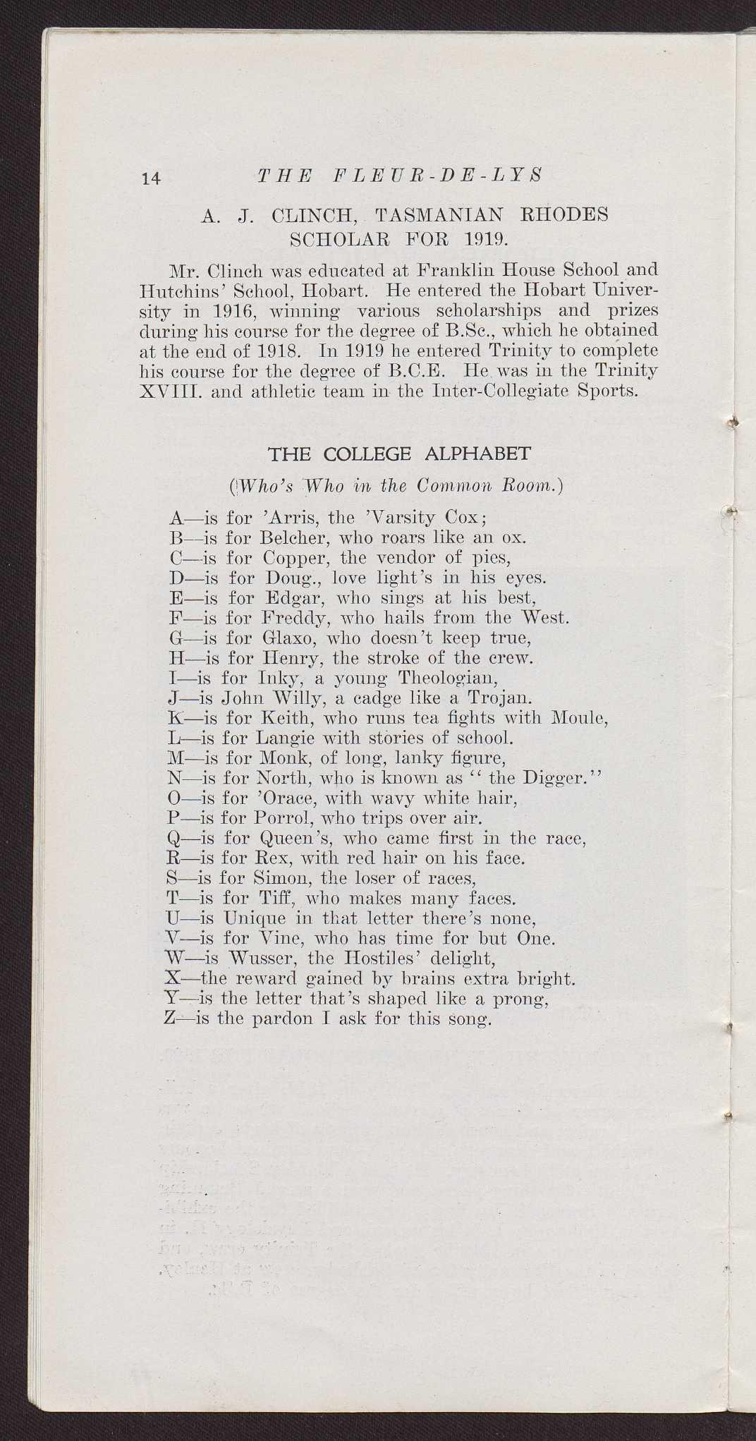 Mr. Clinch was educated at Franklin House School and Hutchins' School, Hobart. He entered the Hobart University in 1916, winning various scholarships and prizes during his course for the degree of B.Sc., which he obtained at the end of 1918. In 1919 he entered Trinity to complete his course for the degree of B.C.E. He was in the Trinity XVIII. and athletic team in the Inter-Collegiate Sports.