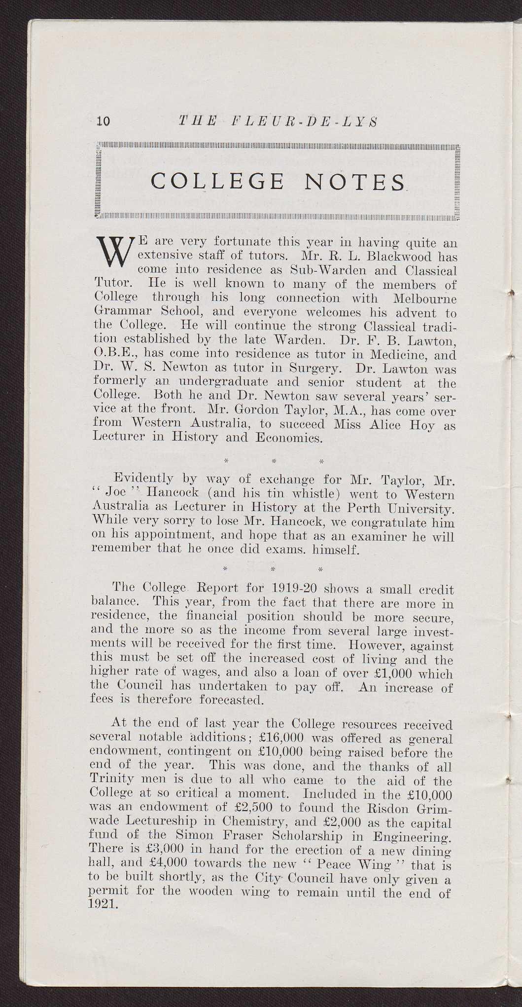 WE are very fortunate this year in having quite an extensive staff of tutors. Mr. R. L. Blackwood has come into residence as Sub-Warden and Classical Tutor. He is well known to many of the members of College through , his long connection with Melbourne Grammar School, and everyone welcomes his advent to the College. He will continue the strong Classical tradition established by the late Warden. Dr. F. B. Lawton, O.B.E., has come into residence as tutor in Medicine, and Dr. W. S. Newton as tutor in Surgery. Dr. Lawton was formerly an undergraduate and senior student at the College. Both he and Dr. Newton saw several years' service at the front. Mr. Gordon Taylor, M.A., has come over from Western Australia, to succeed Miss Alice Hoy as Lecturer. in History and Economics.