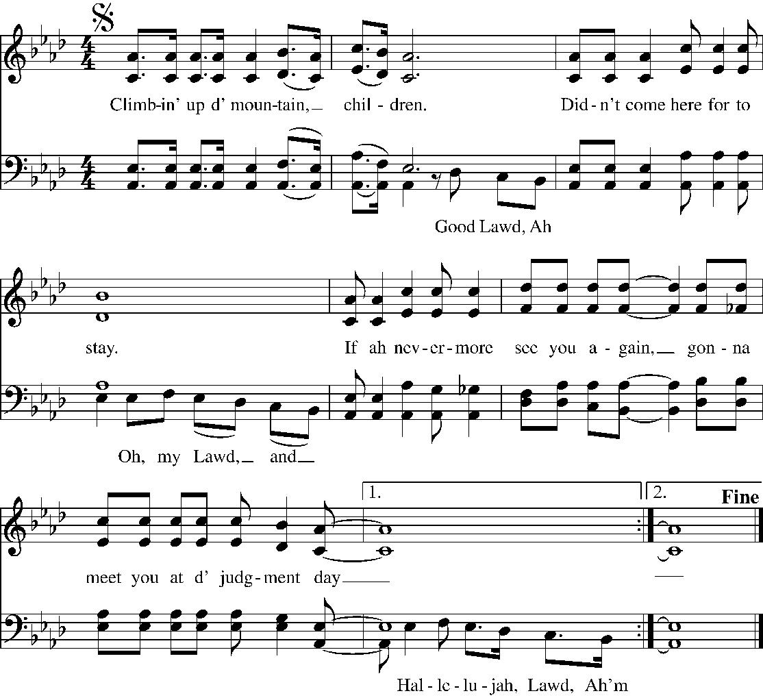 1. Hebrew Children in dey fiery furnace. And dey begin to pray, and de good Lawd smote dat fiyah out. Oh wasn’t dat a mighty day!