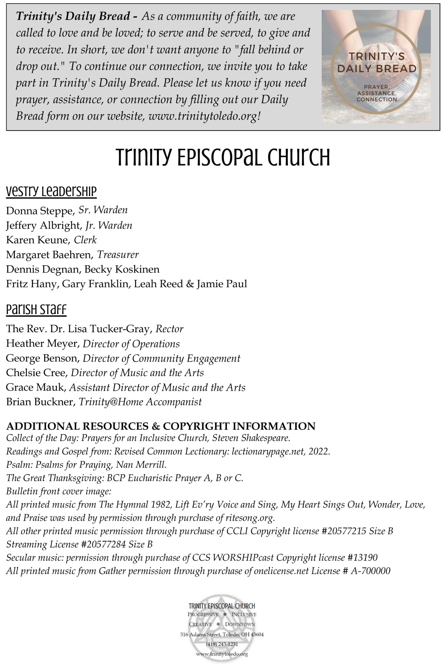 Loose offerings (cash or checks) can be placed in the Offertory Plate as it is passed during the Offertory or deposited in our Giving Box stationed at the back of the sanctuary. To give Online, use the attached QR code or visit www.trinitytoledo.org/online-giving/ choose GIVE NOW and today’s date. You can also text the word “Give” to 419-OMG-LOVE (419-664-5683) to make your weekly offering.