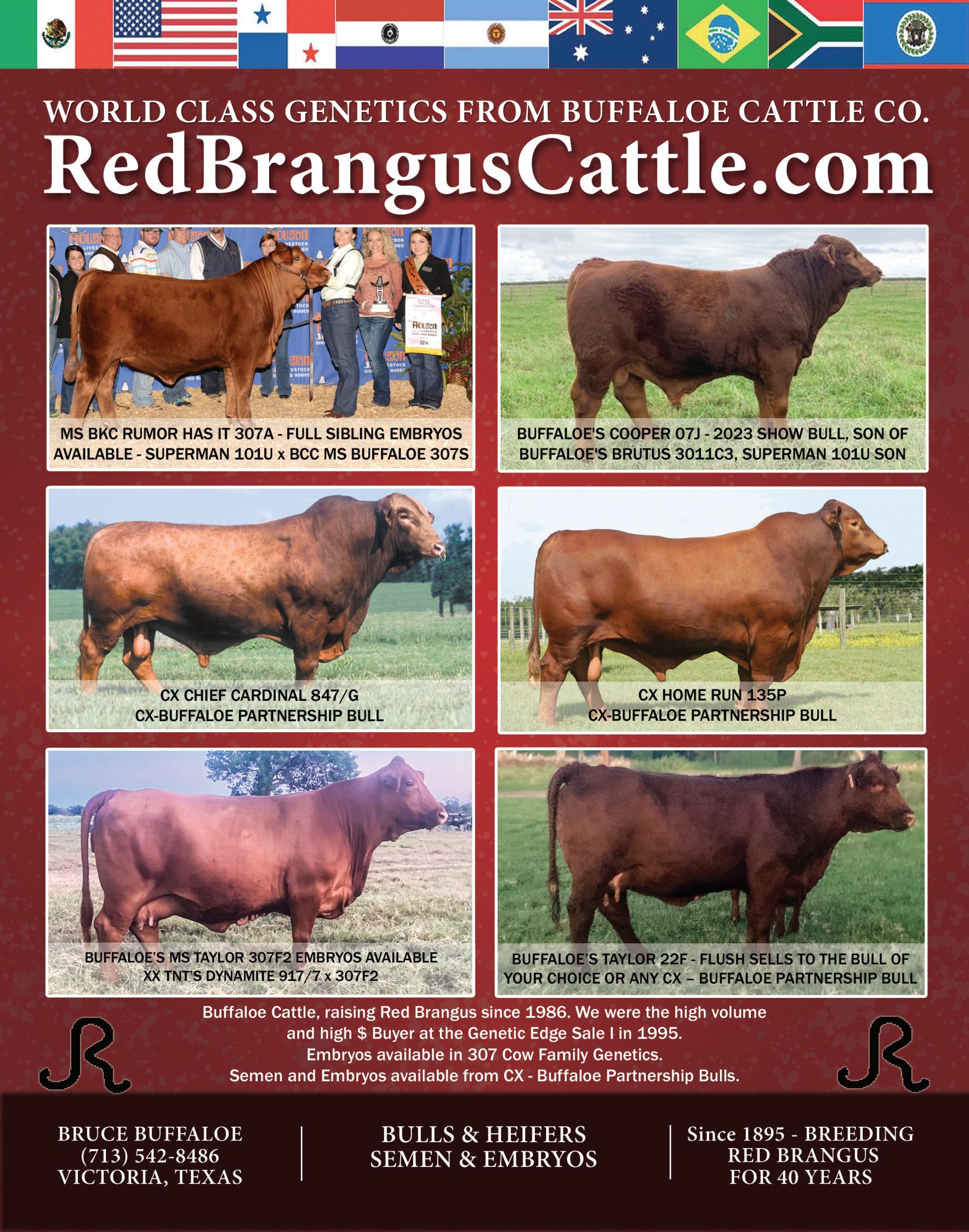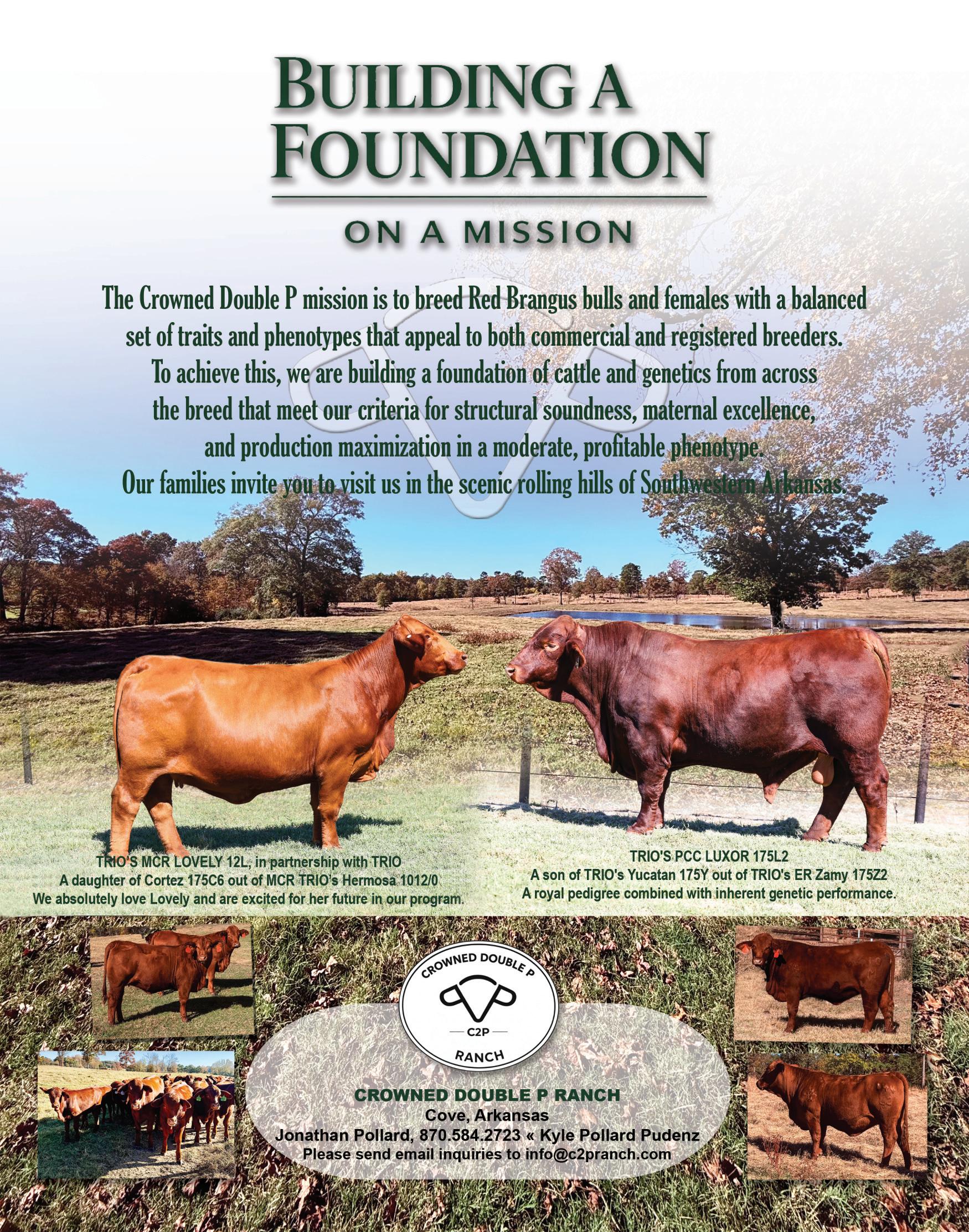 We are proud to present our next edition of the Red Brangus Journal. This publication is our biannual presentation that highlights the benefits and qualities of our great breed and showcases our Red Brangus breeders. Our Journal will travel across the U.S. and the Brangus World, reaching the hands of cattlemen everywhere. Thank you to our sponsoring advertisers for their commitment to advancing the promotion and awareness of Red Brangus worldwide.