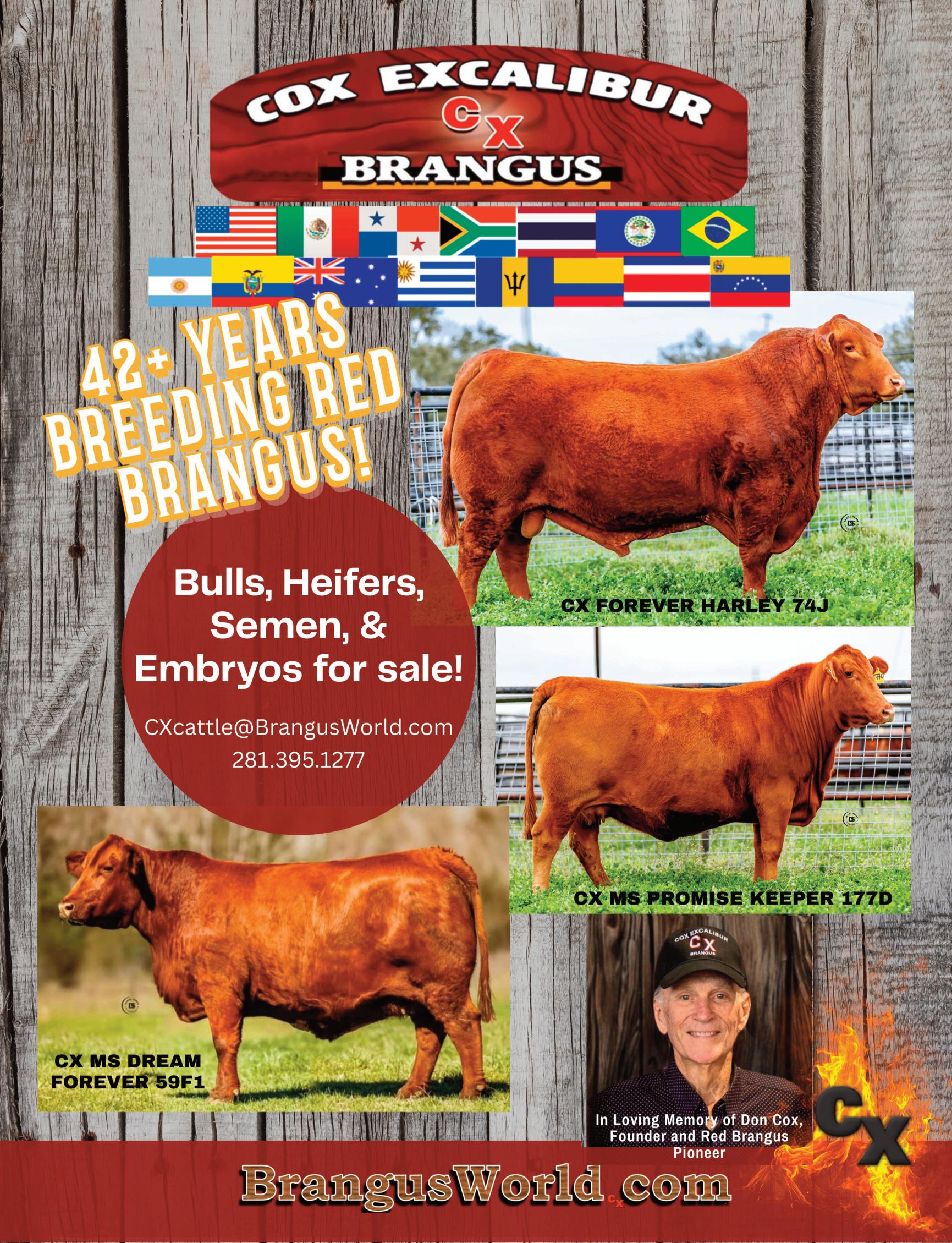 Don’s impact quickly grew beyond Texas. Cox Excalibur Brangus began introducing black Brangus genetics in the early 1990s, but Don’s focus on Red Brangus remained steadfast. By the late 1980s, he was already marketing cattle overseas, selling semen and embryos internationally and paving the way for Red Brangus genetics in regions where adaptability was essential.