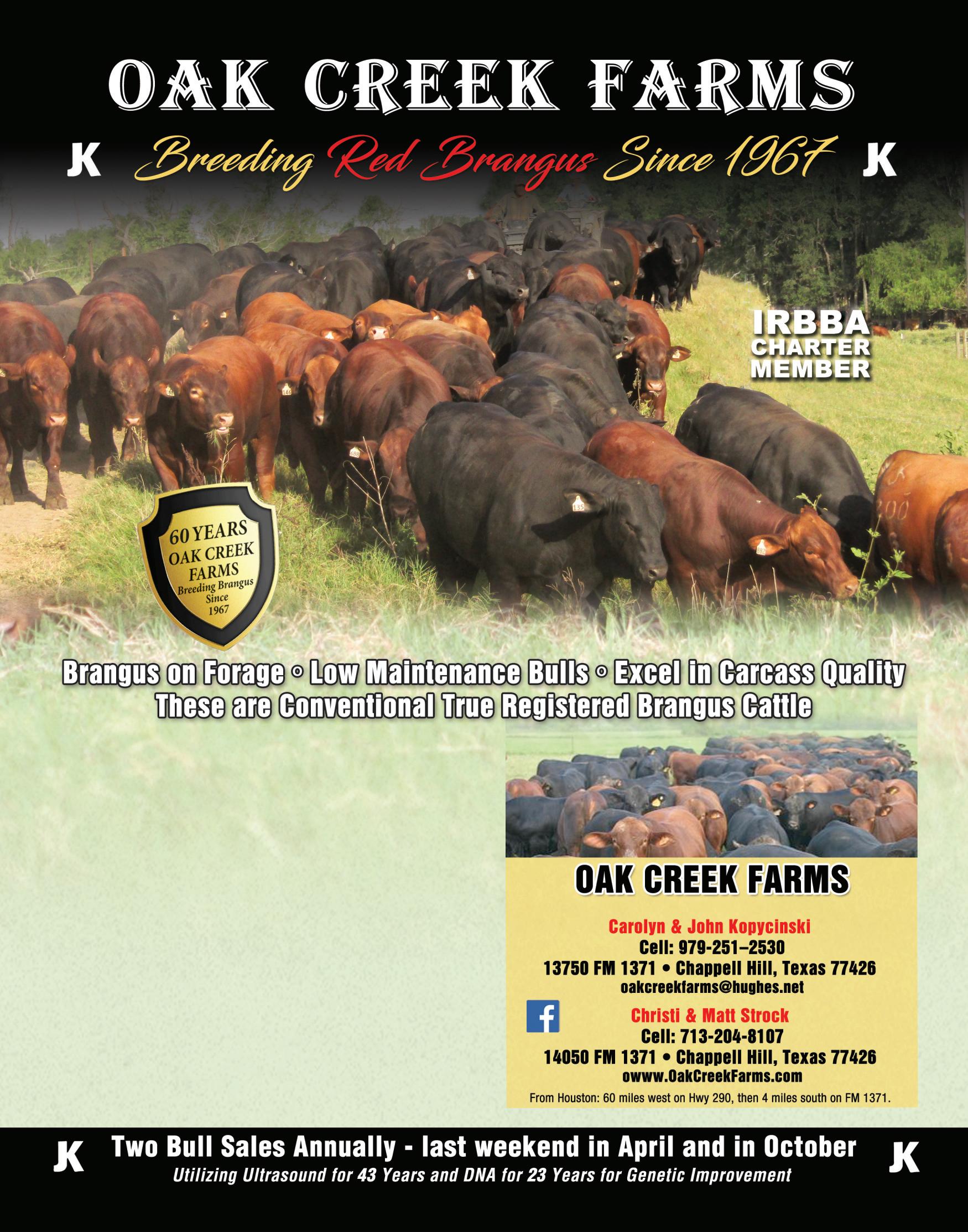 At Oak Creek Farms we believe in true 3/8th x 5/8th Brangus that were developed more than 75 years ago. They fit the environment better and thrive in the heat and still produce good, high-quality BEEF.
