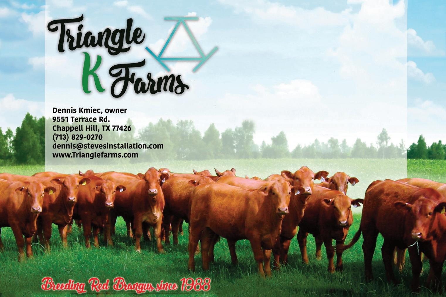 For 40 years, Triangle K Farms has specialized in registered Red Brangus cattle, maintaining a herd of over 100 breeding-age females. By leveraging DNA testing, EPDs, and ultrasound technology, we produce performance-driven genetics focused on superior carcass quality and maternal merit. Our rigorous selection process has resulted in a powerful, moderate-sized herd.
