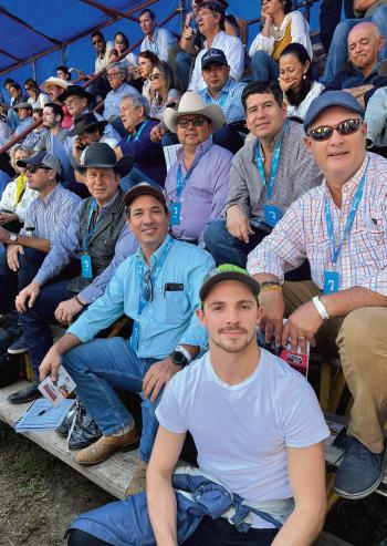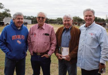 Sale day at Cox Excalibur Brangus. From top left, Leo Casas, Don Cox, Dr. Darrell Wilkes and bottom José Ramirez
