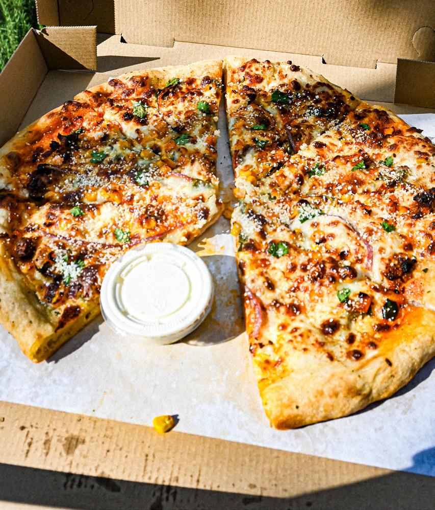 Facing page, ask Stephanie her favorite part of the job, and she’ll tell you that it’s the friendly faces and good conversations that come with every customer. Above, from top, whether it’s handling the rush or sharing a joke, Joe and Stephanie know how to keep things rolling together; every great pizza needs a great team and Marly, Christopher, and Maddox bring the heat, every shift; golden, messy, and utterly unforgettable, the street corn pizza lives up to the hype.
