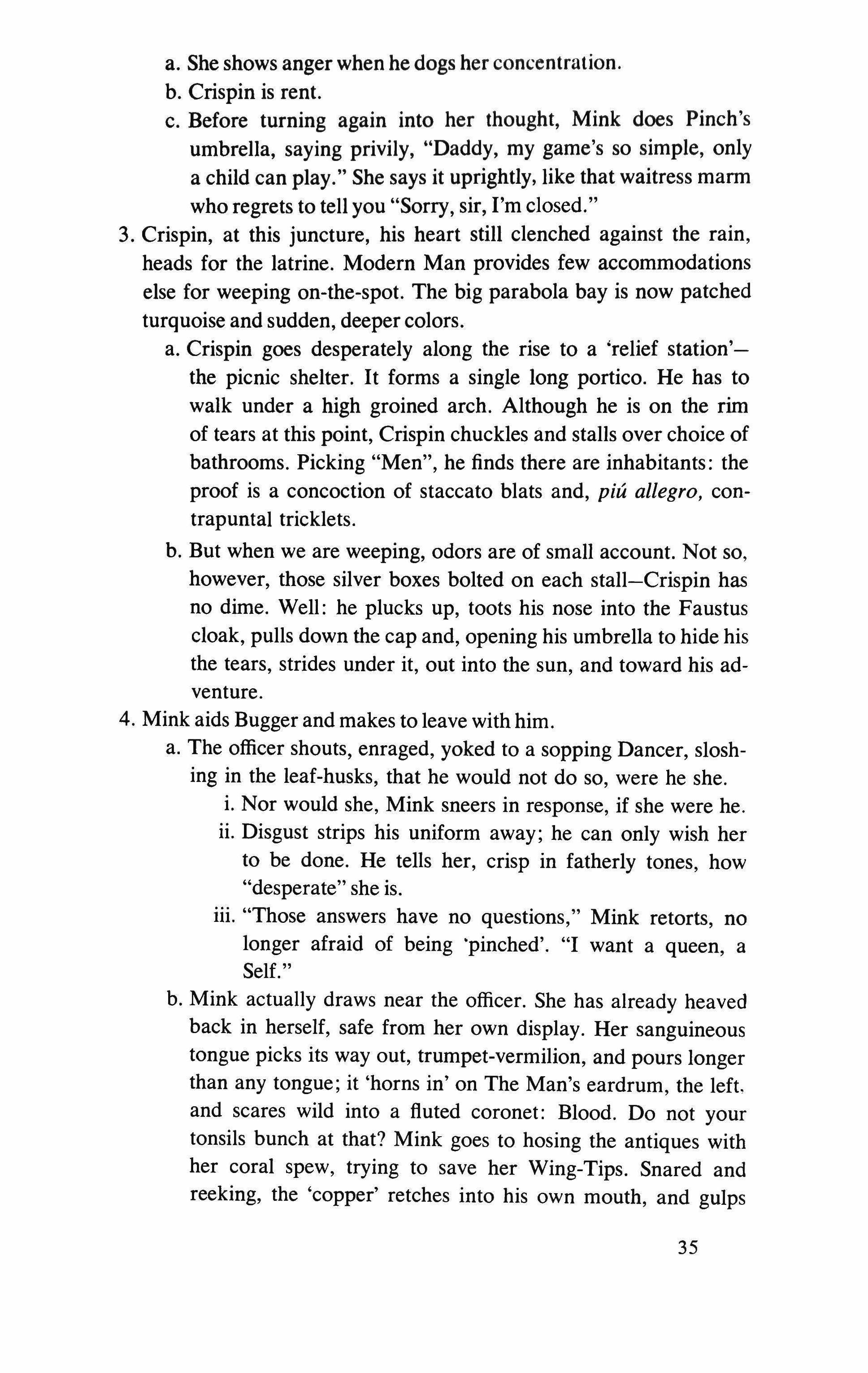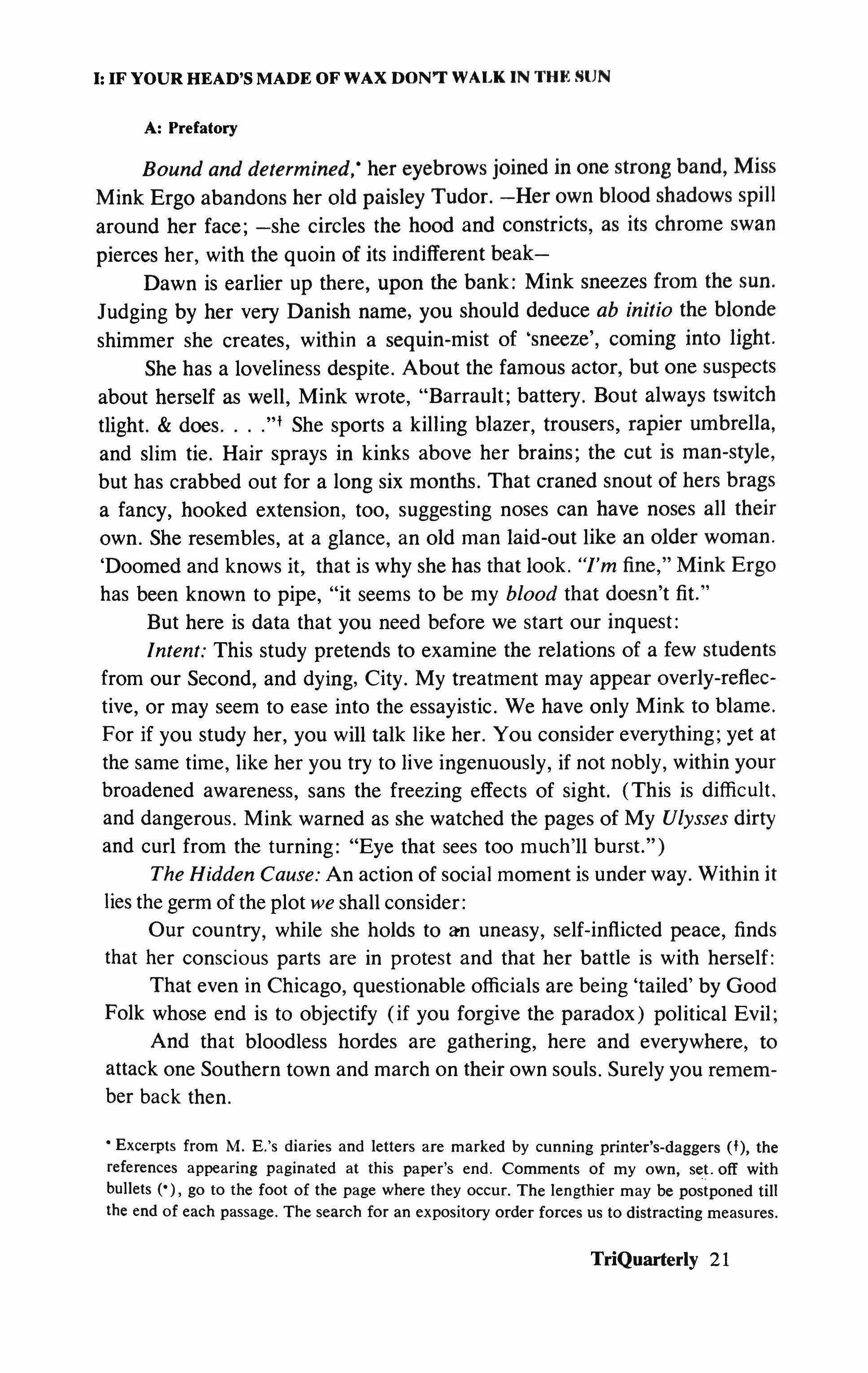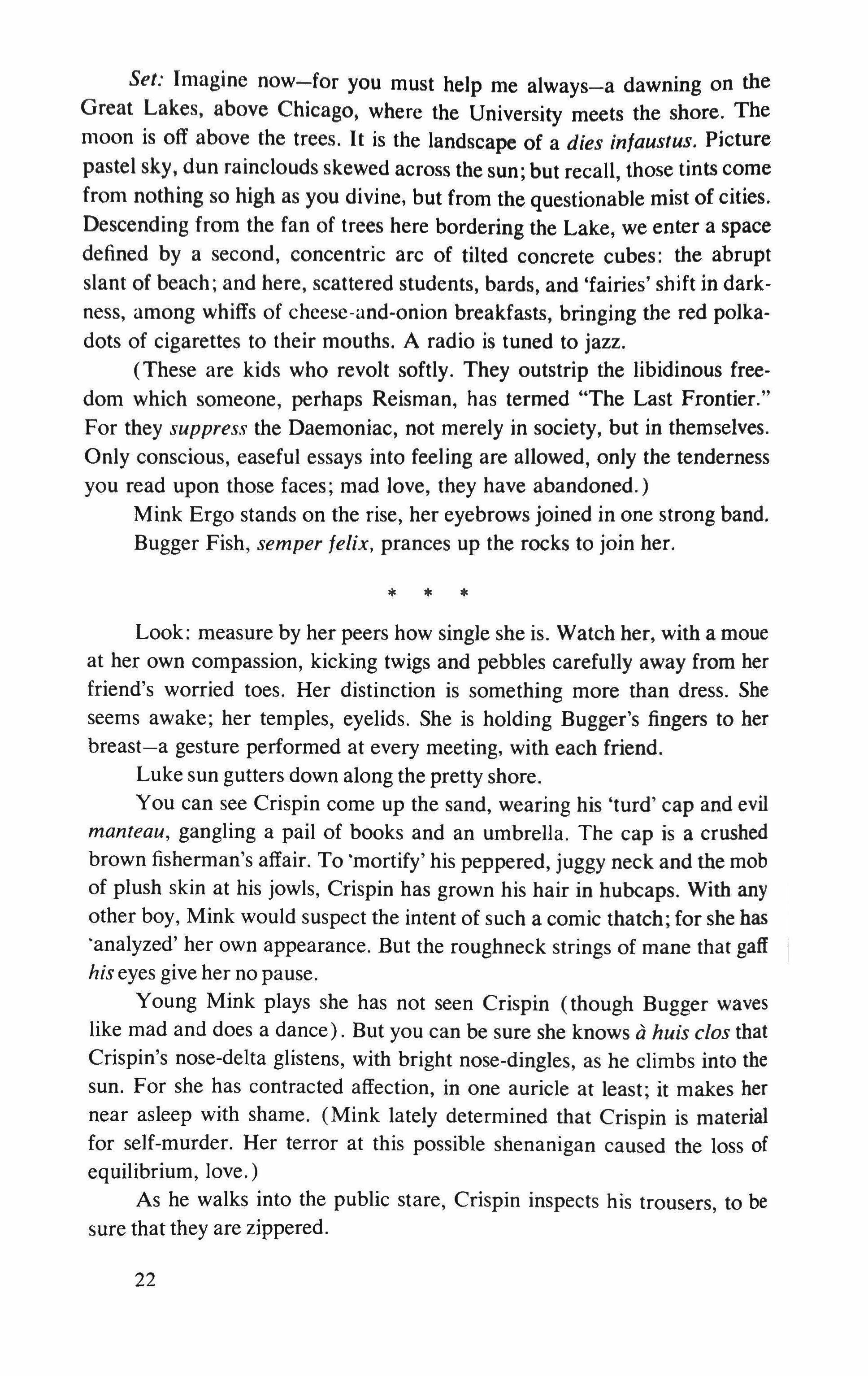 Intent: This study pretends to examine the relations of a few students from our Second, and dying, City. My treatment may appear overly-reflective, or may seem to ease into the essayistic. We have only Mink to blame. For if you study her, you will talk like her. You consider everything; yet at the same time, like her you try to live ingenuously, if not nobly, within your broadened awareness, sans the freezing effects of sight. (This is difficult, and dangerous. Mink warned as she watched the pages of My Ulysses dirty and curl from the turning: "Eye that sees too much'll burst.")