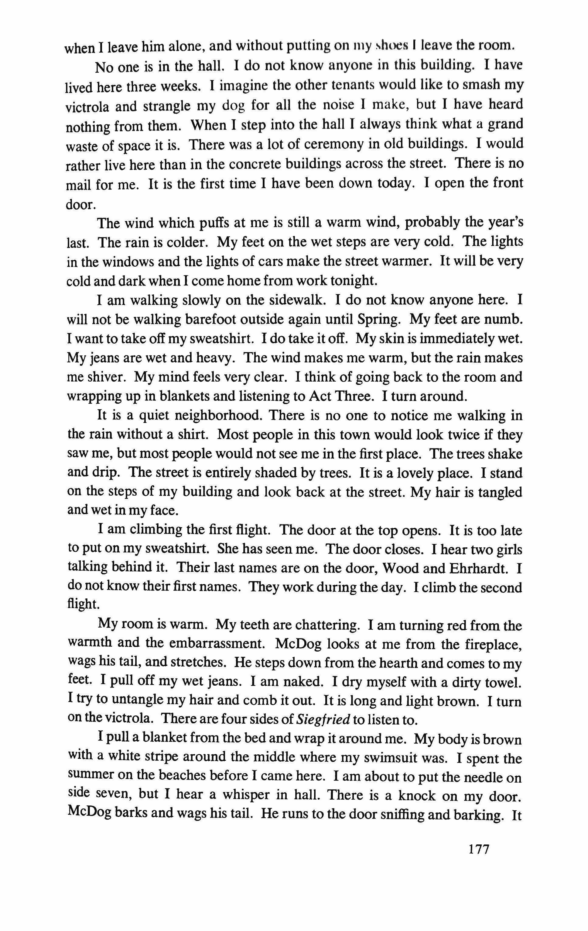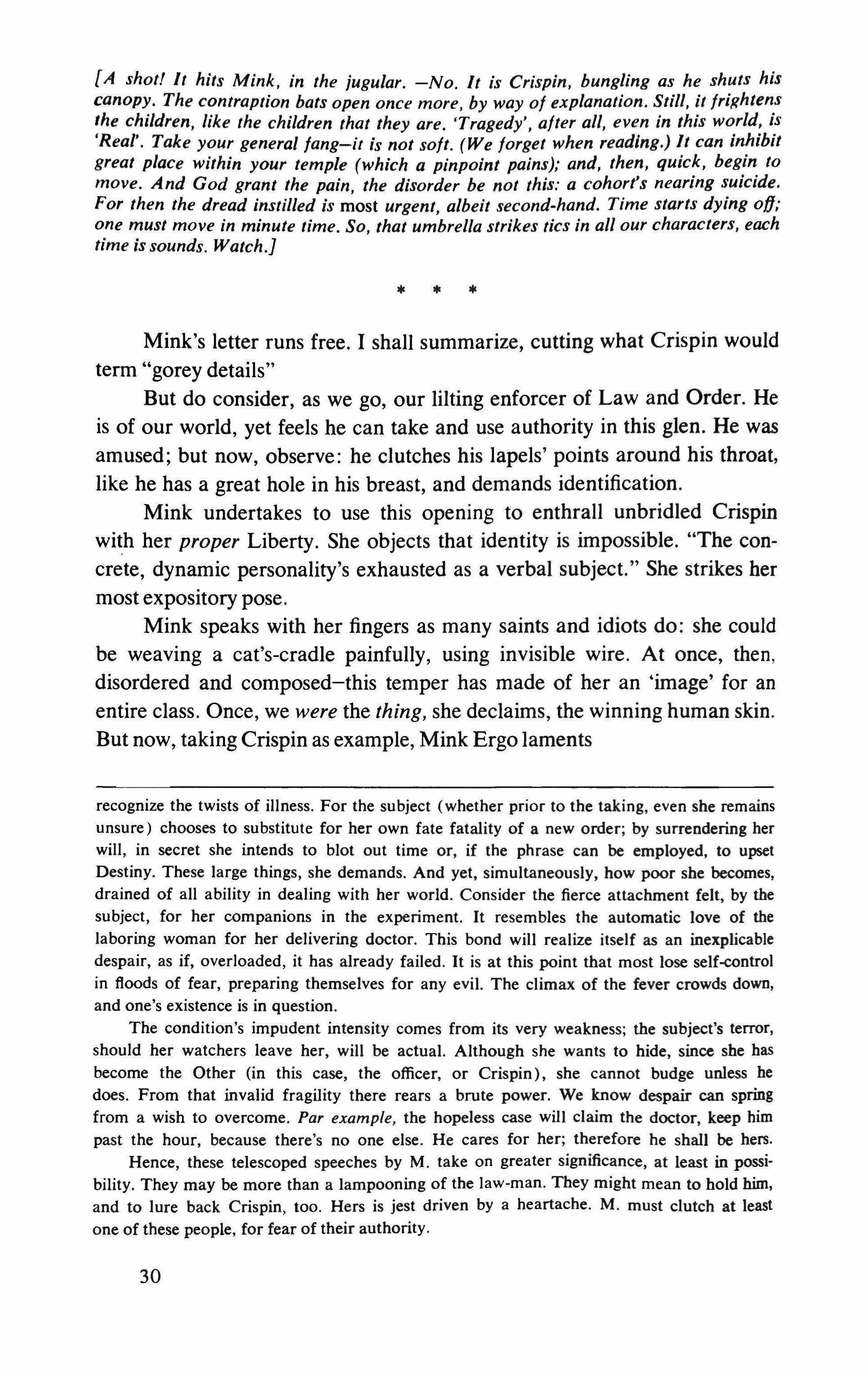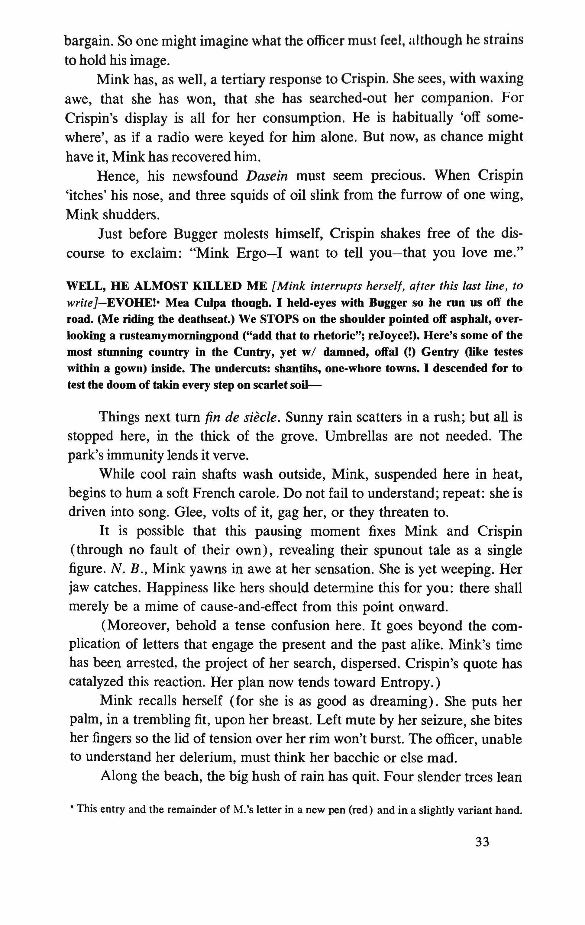 Intent: This study pretends to examine the relations of a few students from our Second, and dying, City. My treatment may appear overly-reflective, or may seem to ease into the essayistic. We have only Mink to blame. For if you study her, you will talk like her. You consider everything; yet at the same time, like her you try to live ingenuously, if not nobly, within your broadened awareness, sans the freezing effects of sight. (This is difficult, and dangerous. Mink warned as she watched the pages of My Ulysses dirty and curl from the turning: "Eye that sees too much'll burst.")
