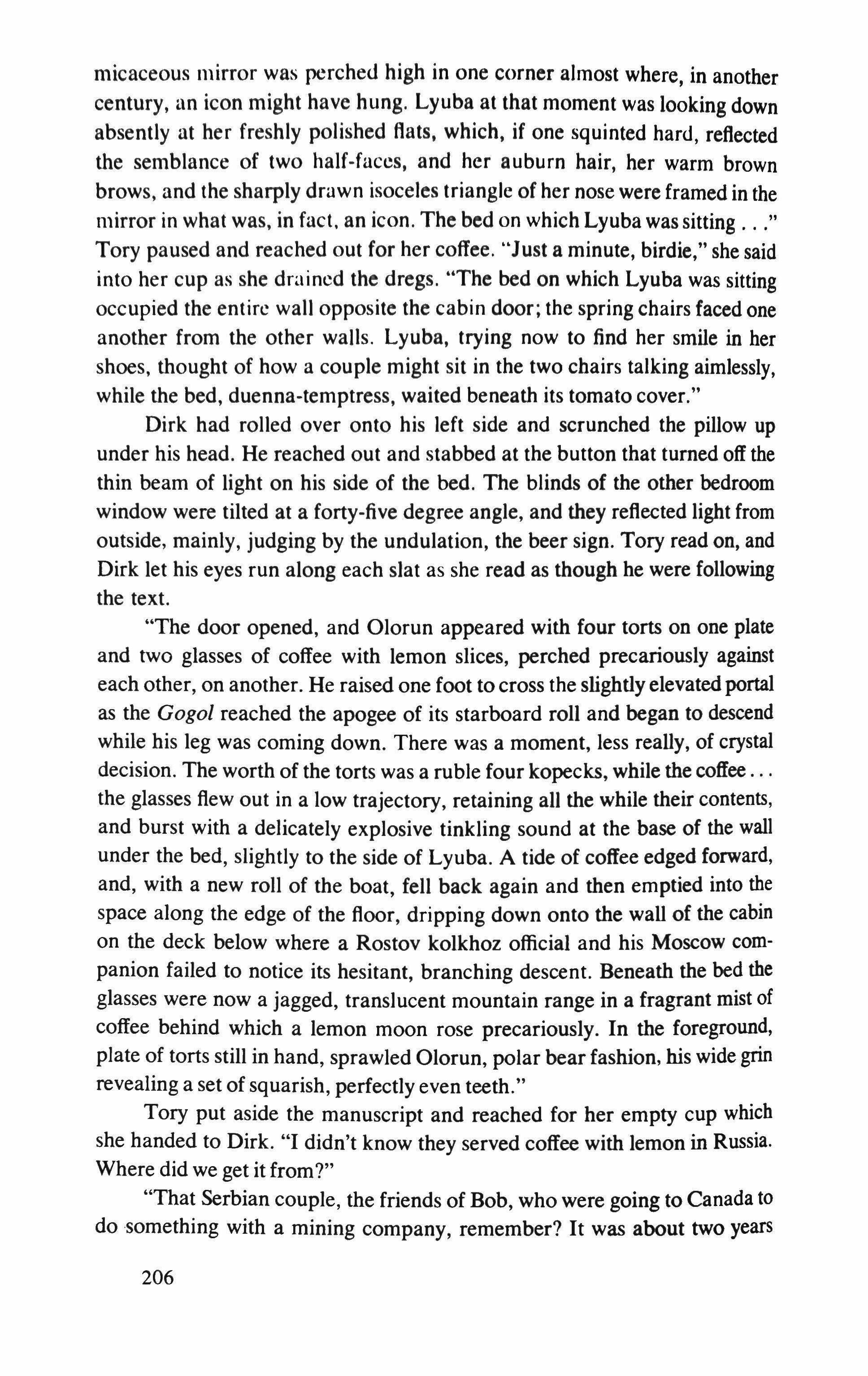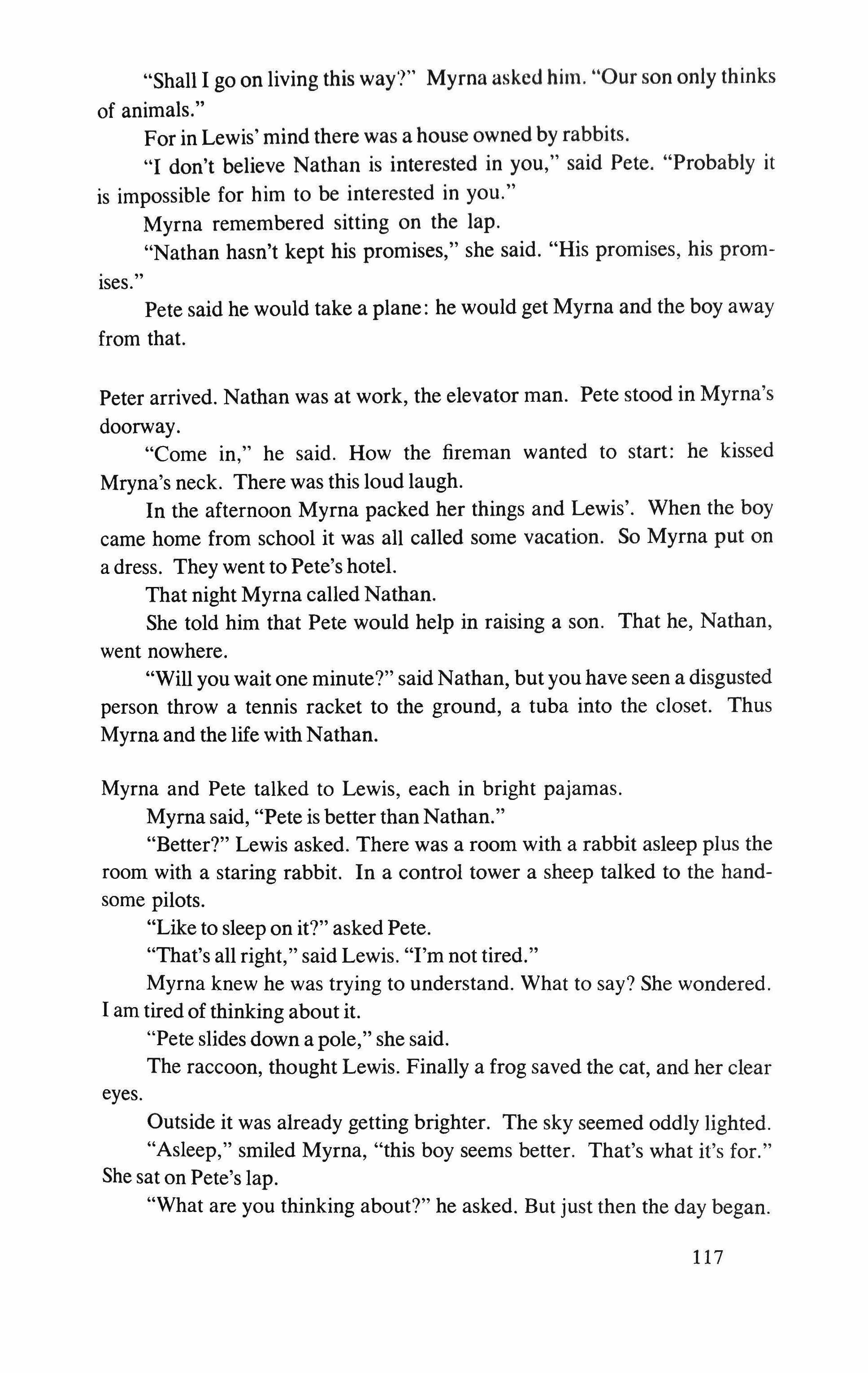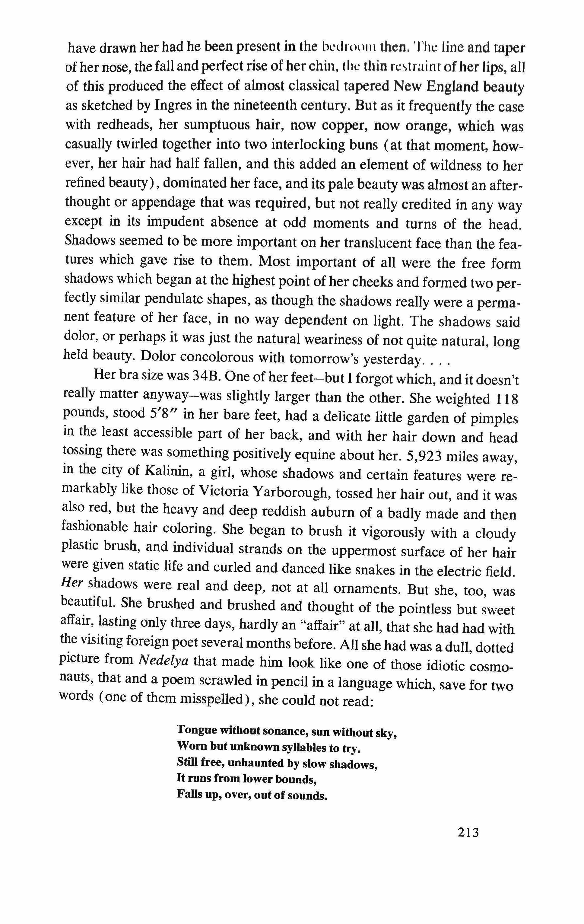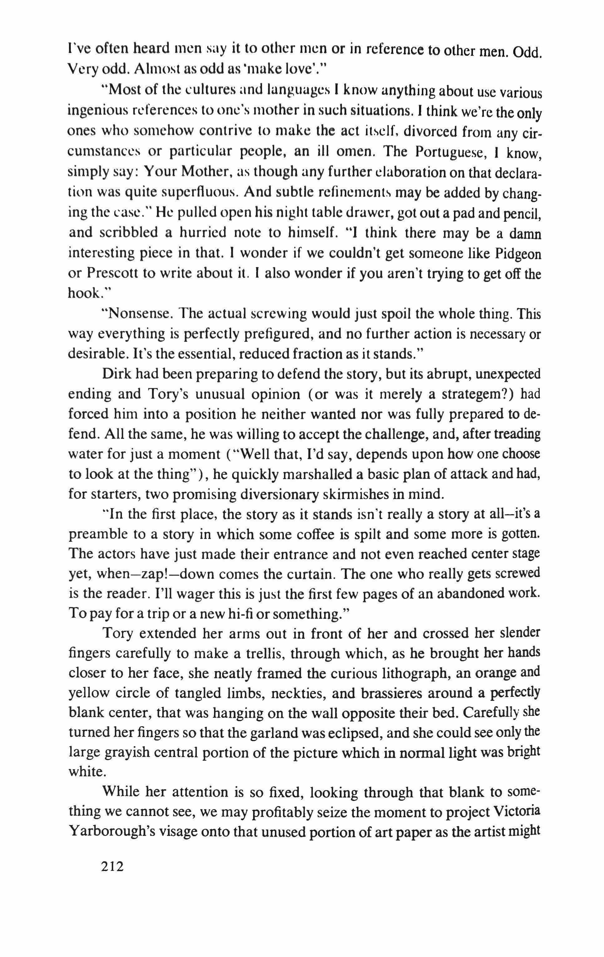 In a world which has doggedly refused to see itself as anything but metaphor for a hundred years, this could be a refreshing throwback in the American idiom. Mutha and Celine and Inque do exist, in literary fact, just as the Calcutta of the dream does: we need not prove it either spatially or temporally.