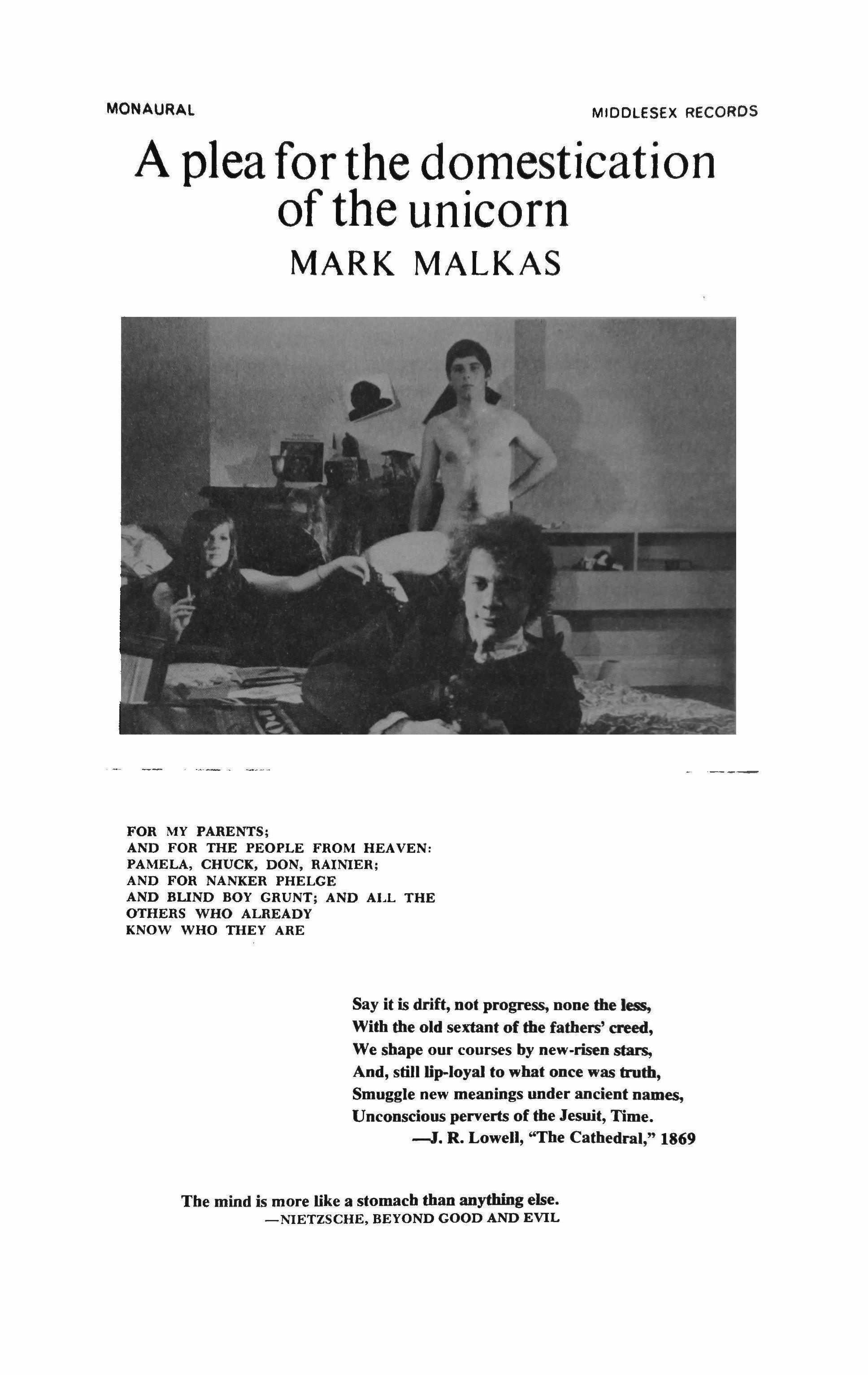 In the face of these appalling realities, the apparently destructive renunciations these young people have made (they are playing loser wins, to be sure) take on a startling and even tragic dignity. They are nothing less than appeals for Grace, and they adopt as their ethic all the attributes of Grace: the obviation of mind, the transcendence of language, the renunciation of individualism and (as some unsung genius of the Mattachine society perceived) an essentially mystical search for Communion with the One. ("The mystical circle of friendship makes all mankind One," as the Mattachines quote Emerson's mentor, Carlyle.)