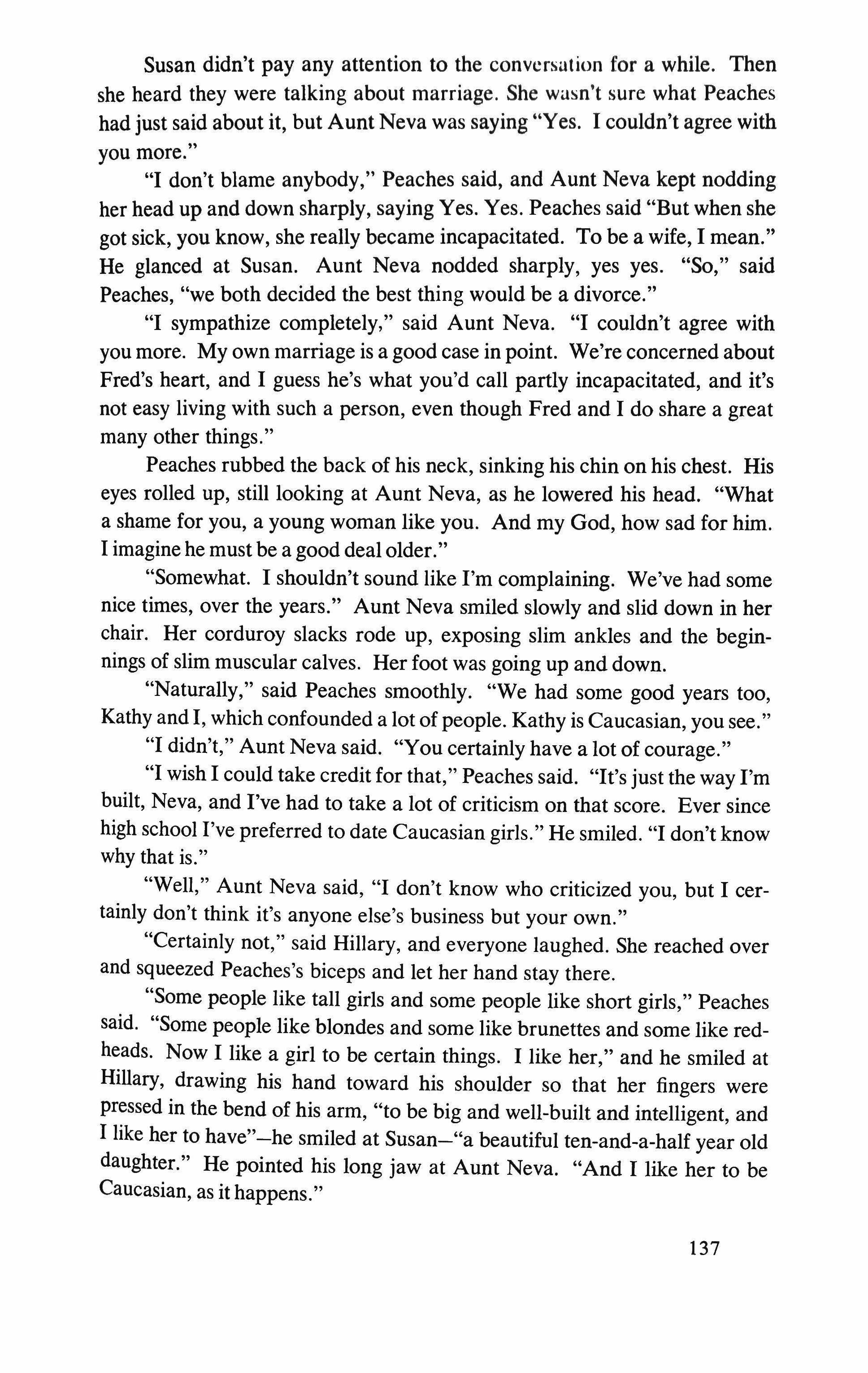 I'm listening to the Chopin nocturnes, thinking God I'm a swishy romantic. I remember Her saying, "Chopin, how hypocritical". Her hair was shorter than mine, her eyes were so large, Always dilated. I took it for a sign Of her passionate nature, but soon it grew Clear her rapture was lack of glasses.
