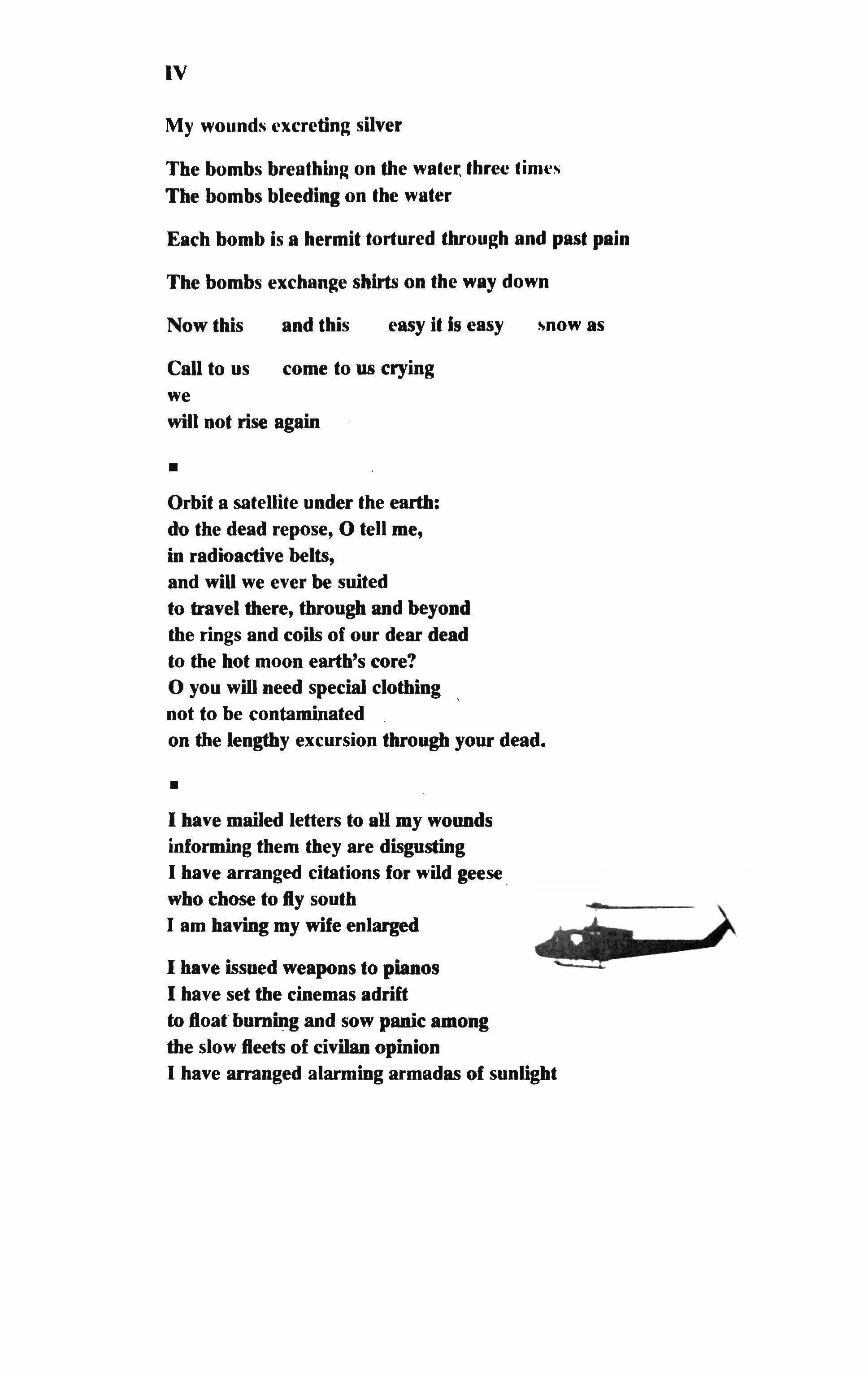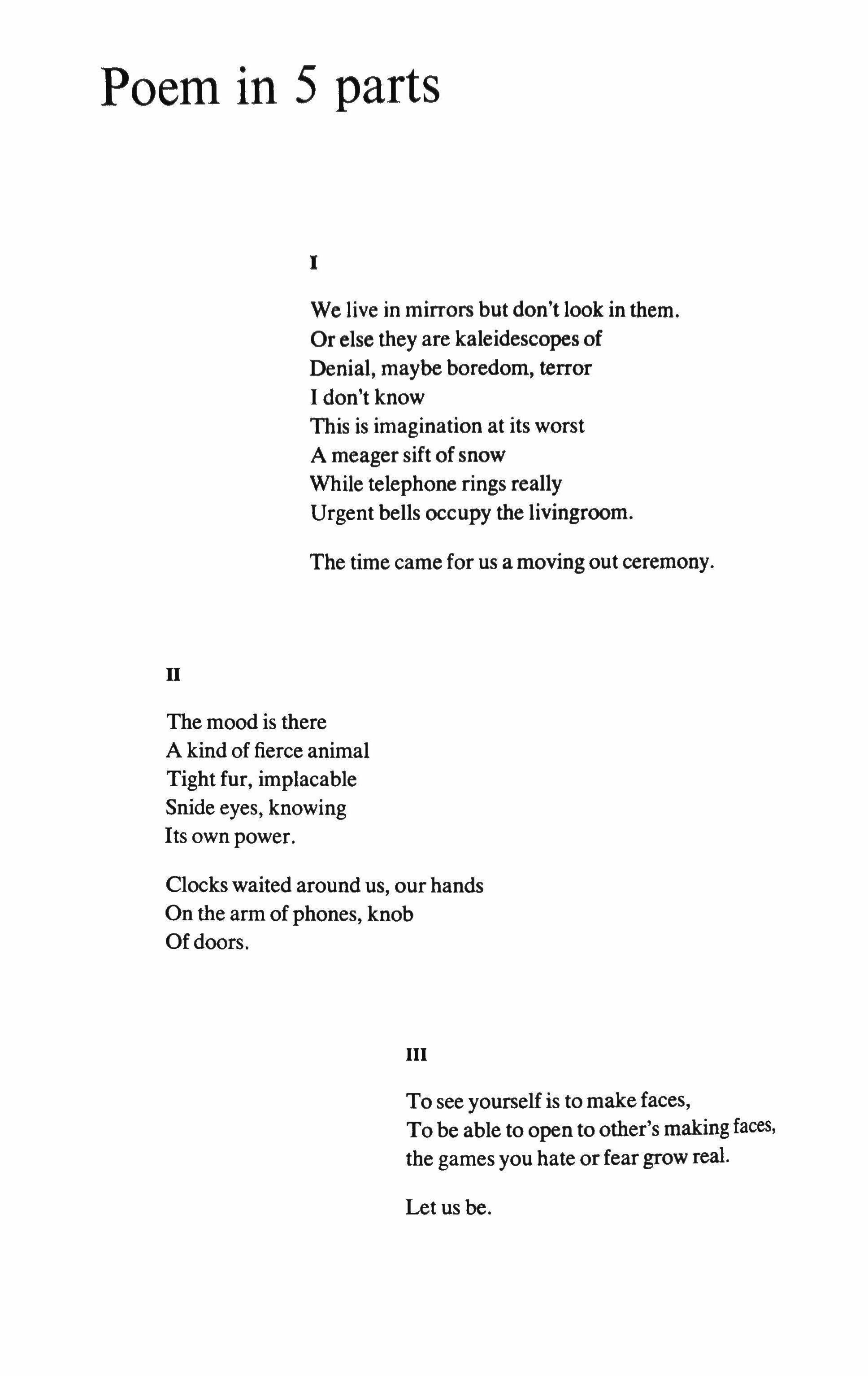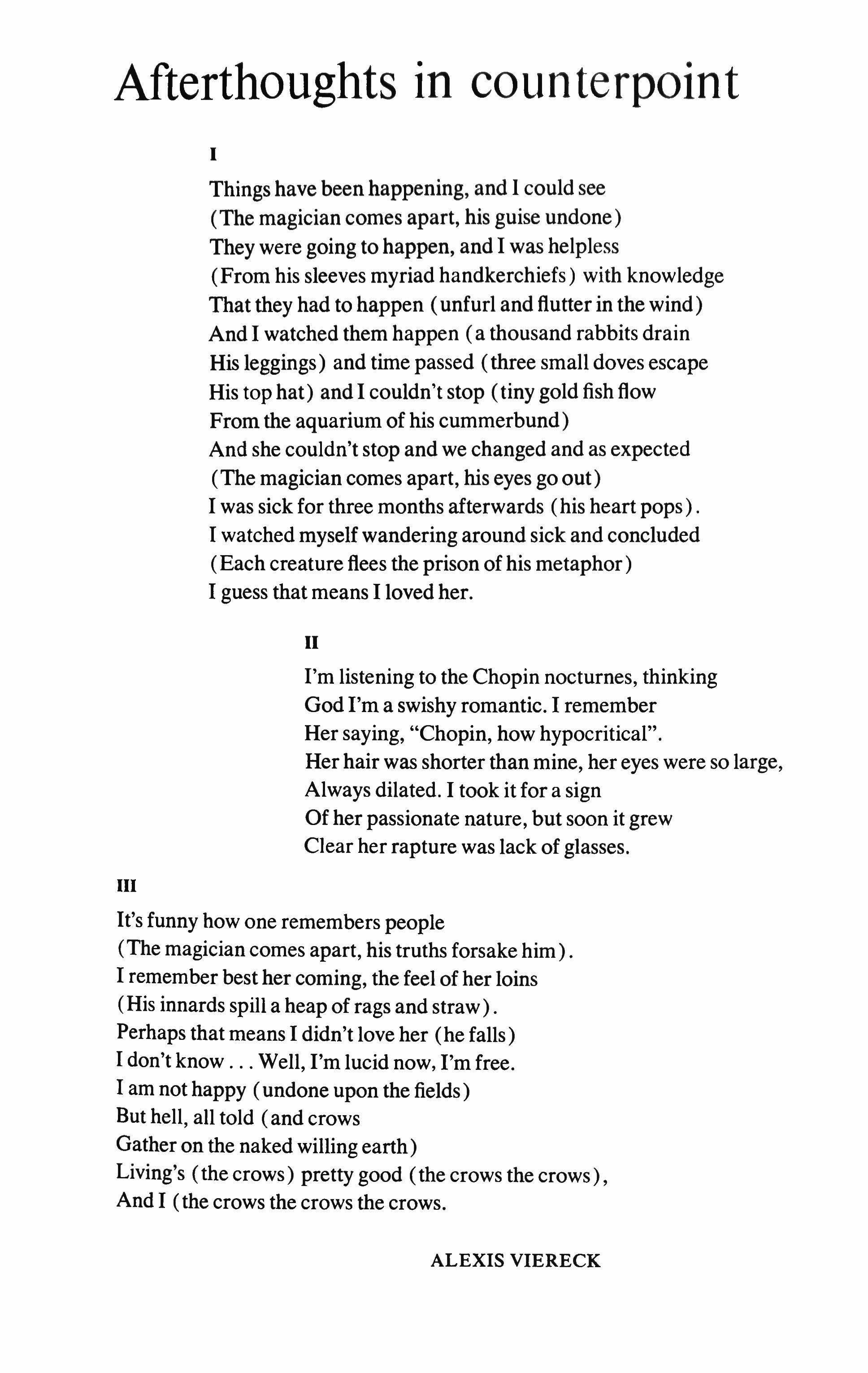Things have been happening, and I could see (The magician comes apart, his guise undone) They were going to happen, and I was helpless (From his sleeves myriad handkerchiefs) with knowledge That they had to happen (unfurl and flutter in the wind) And I watched them happen (a thousand rabbits drain His leggings) and time passed (three small doves escape His top hat) and I couldn't stop (tiny gold fish flow From the aquarium of his cummerbund)
