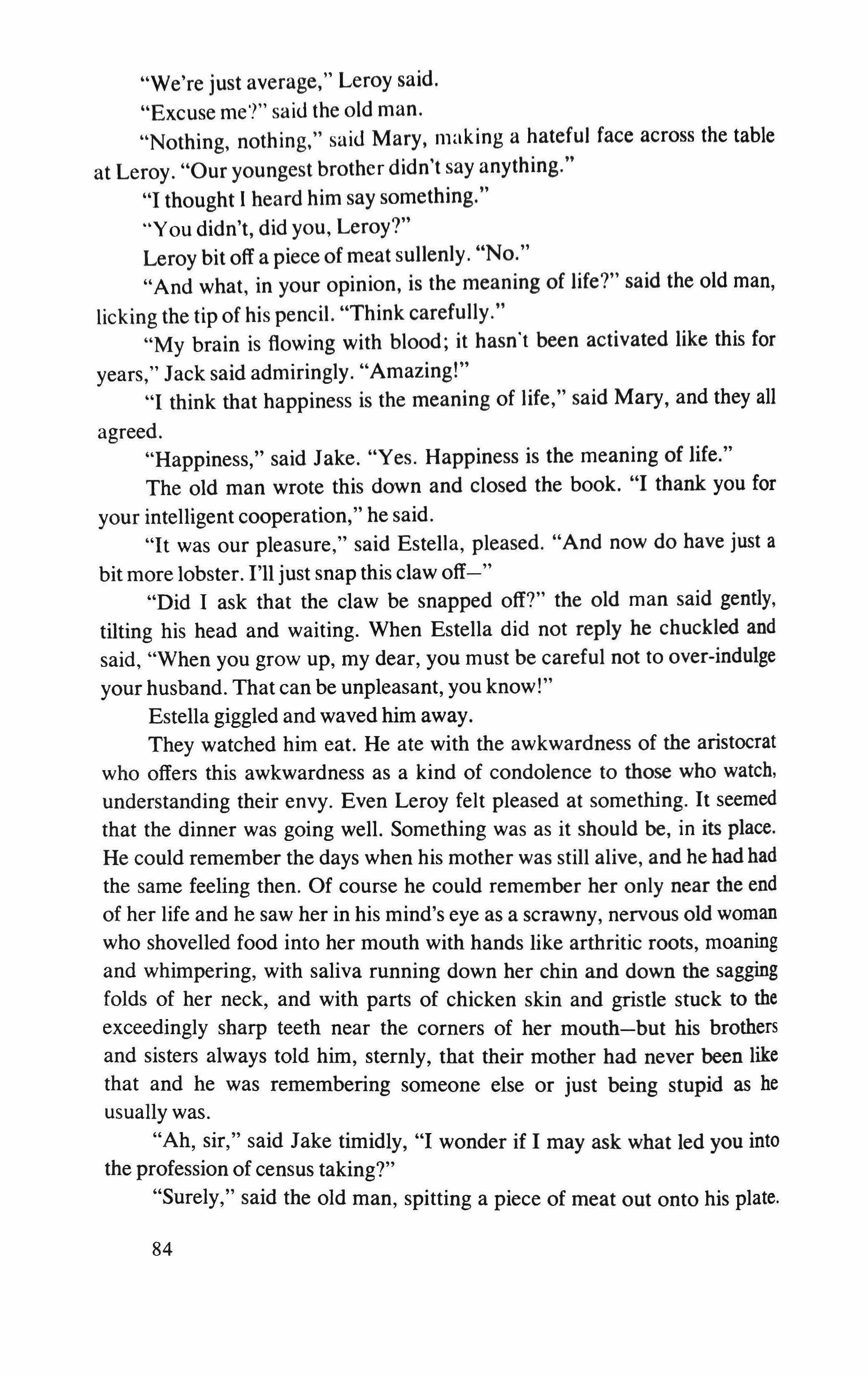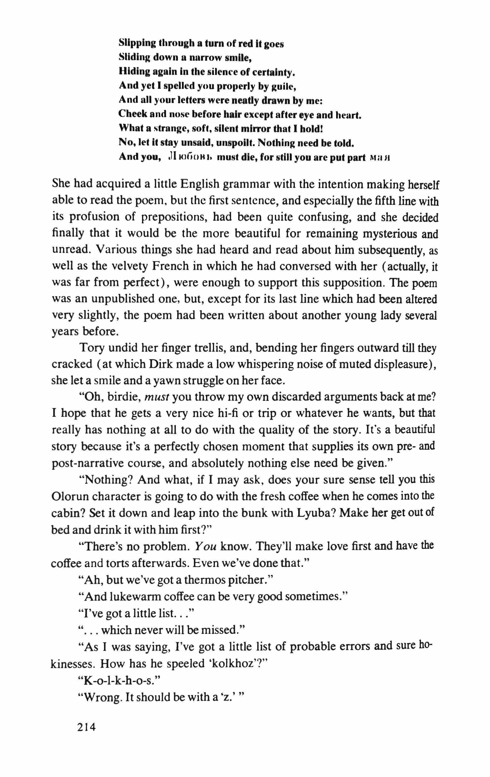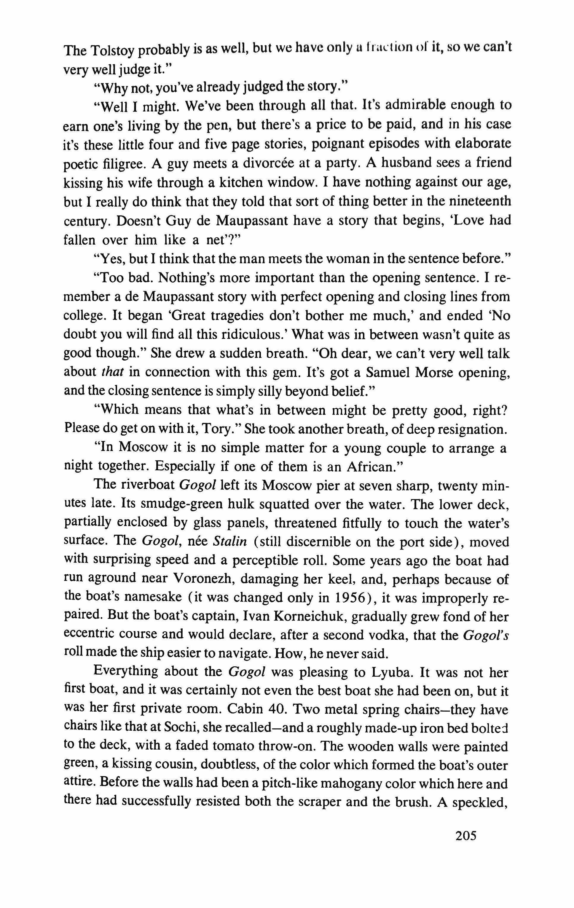 Which is exactly what happens at the beginning of the book. Ulga, the 60-year-old female Swedish painter sits on the floor with Evgenii, the 42year-old Russian painter, and with Walt-Marie, the 19-year-old hermaphroditic American painter, and reads aloud: