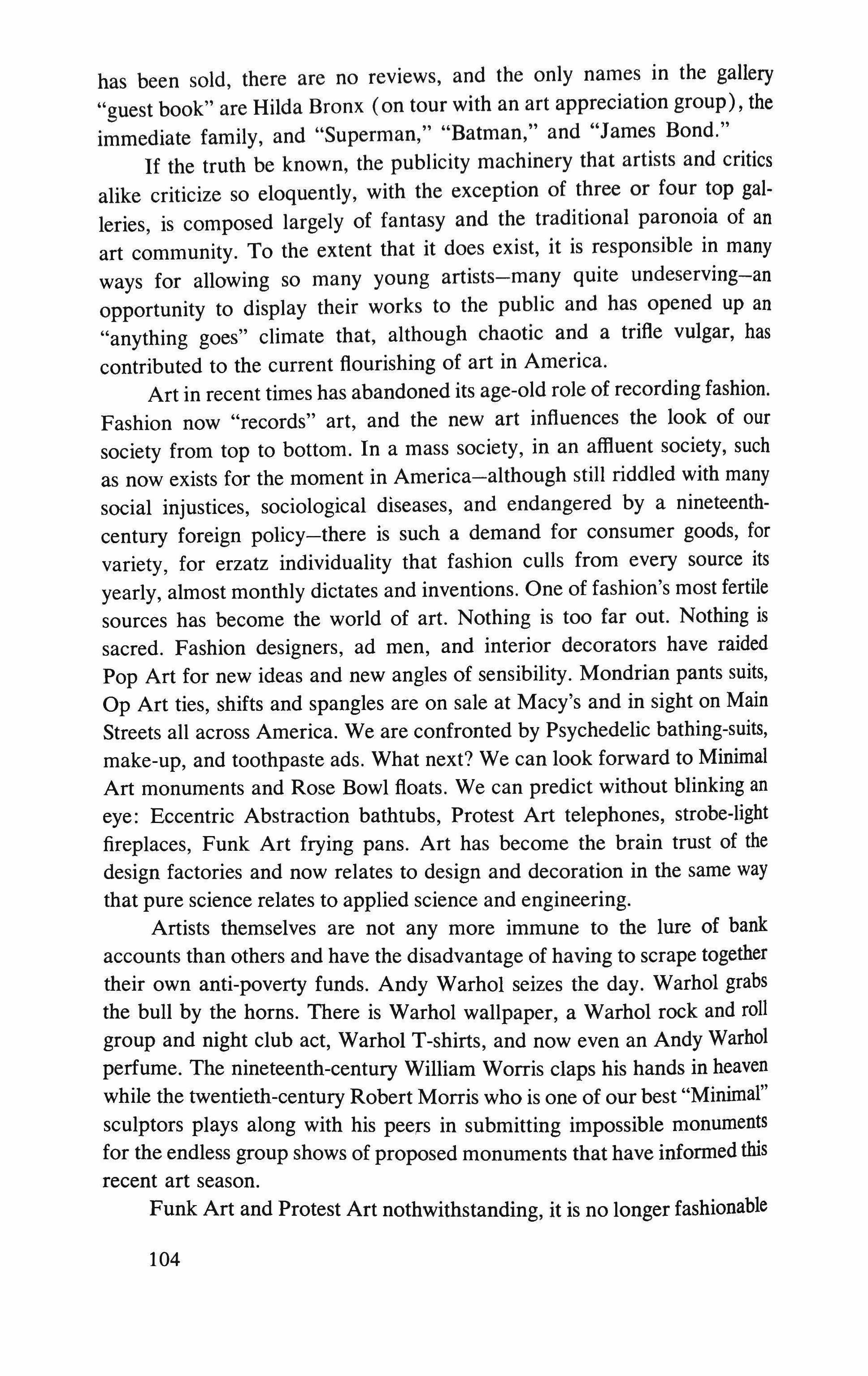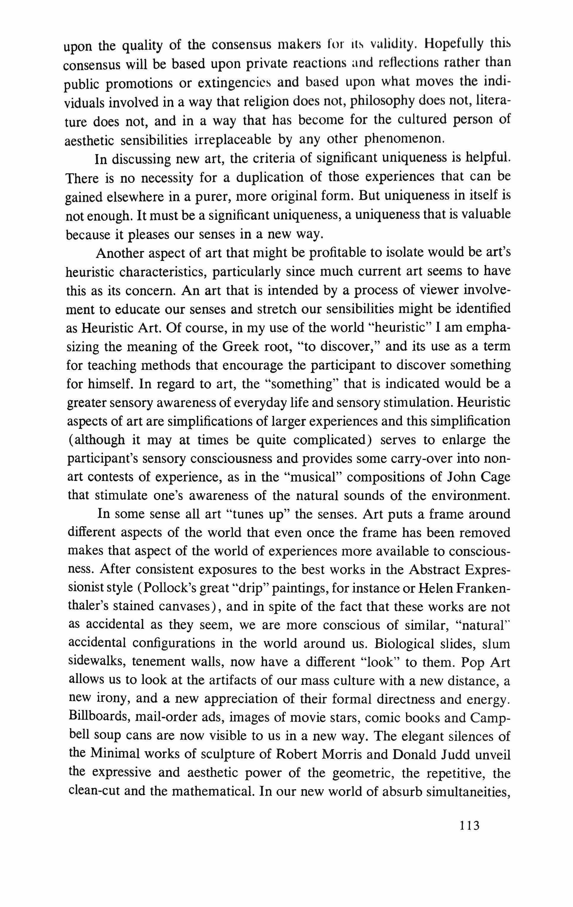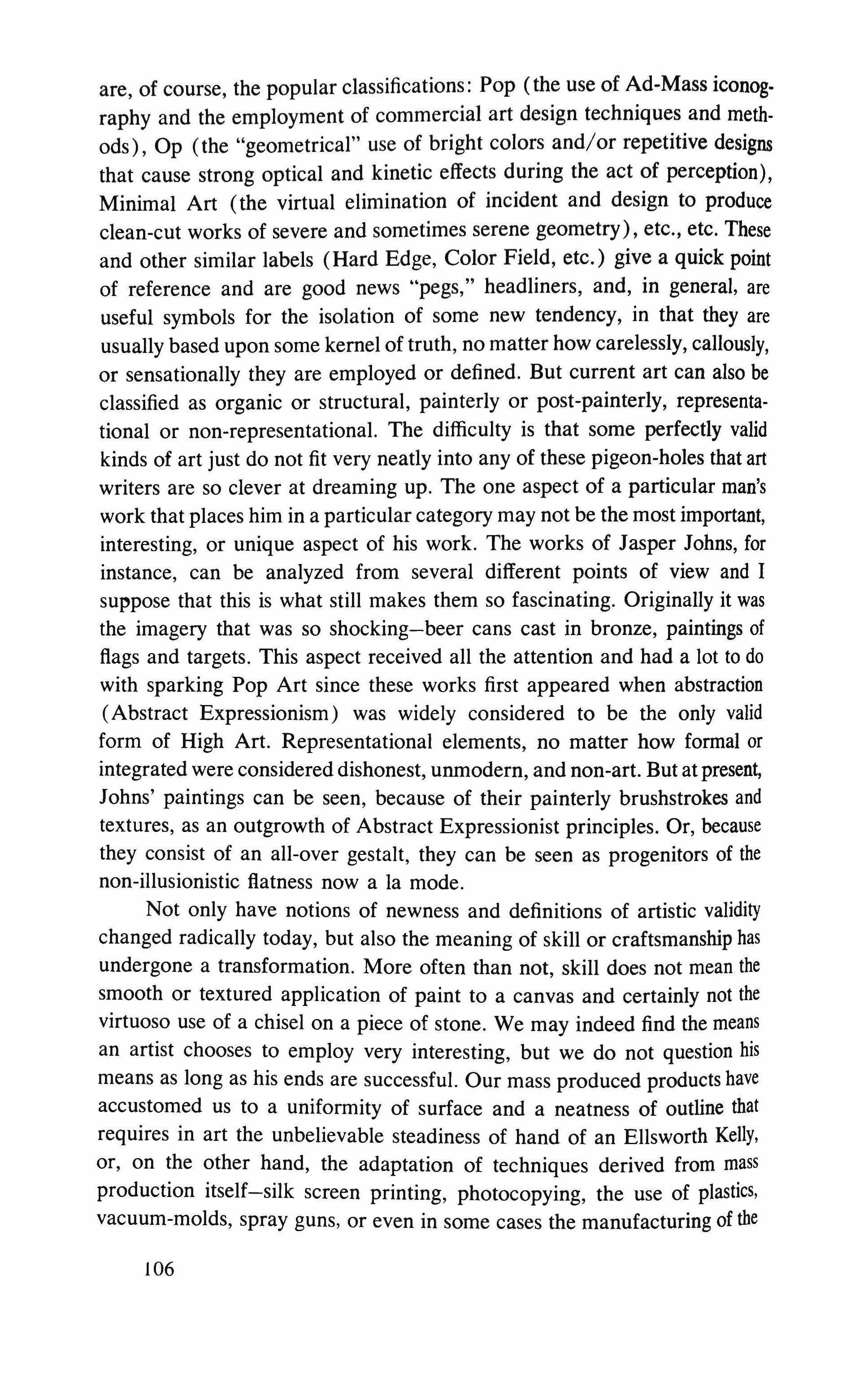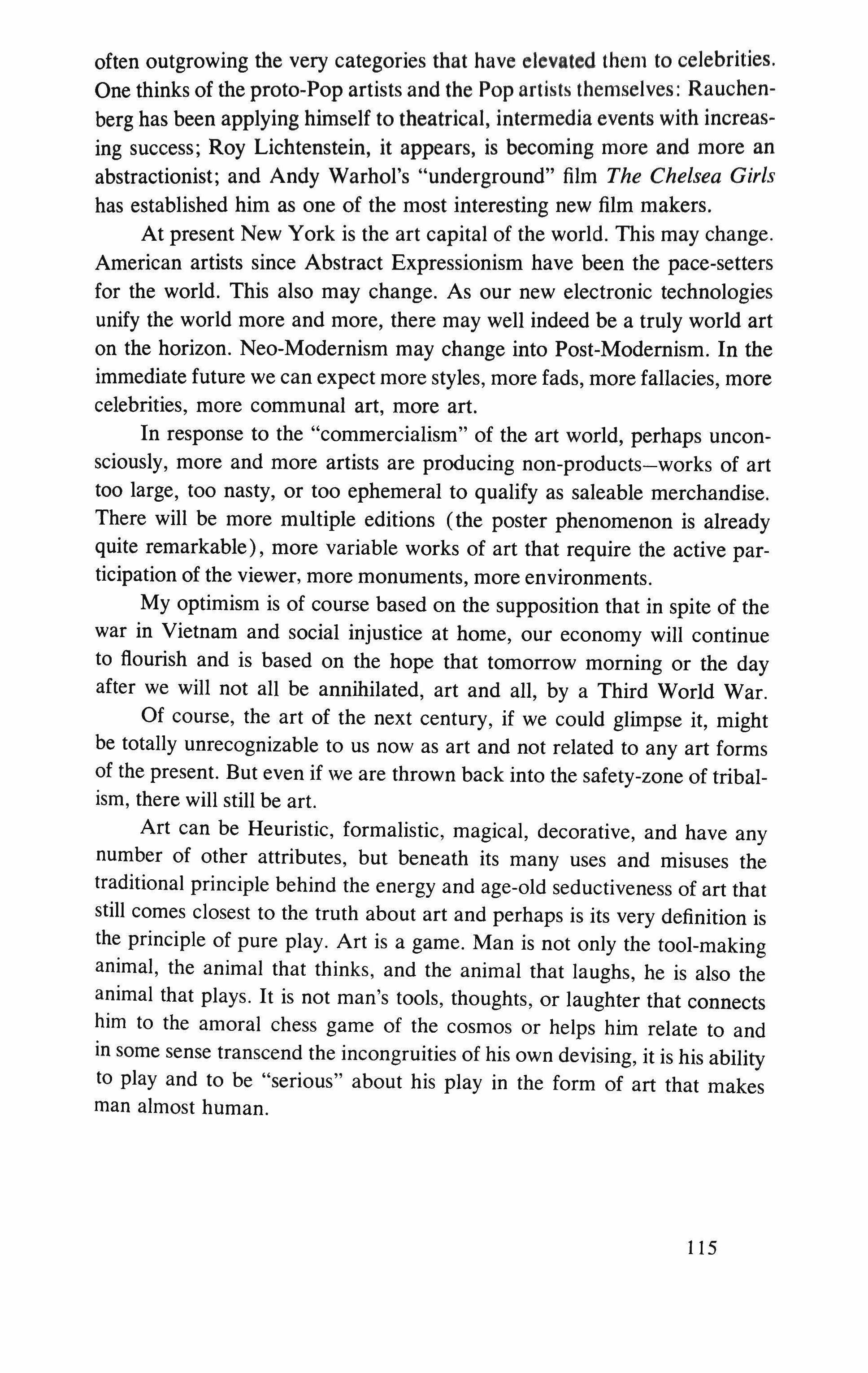 propitious of all is the cultural "temper" of the sixties and the shifts in artistic taste it may be able to support. A certain repressive solemnity seems to have been dispelled over the past few years; in particular, the chauvinistic, liberal ethic that drives our provincial realism is no longer taken seriously by anyone except its perpetrators and a certain pre-literate segment of the public. The change is so complete that even the newspaper reviewers get nervous when the word realism floats into sight. (It almost seems time to point out that realism is not necessarily the same as the anti-poetic, defensive parochialism with which its post-war American manifestation is strictly coextensive). In place of the old style, one hears of nothing but a benign hedonism, which is, of course, highly conducive to the creation of art.
