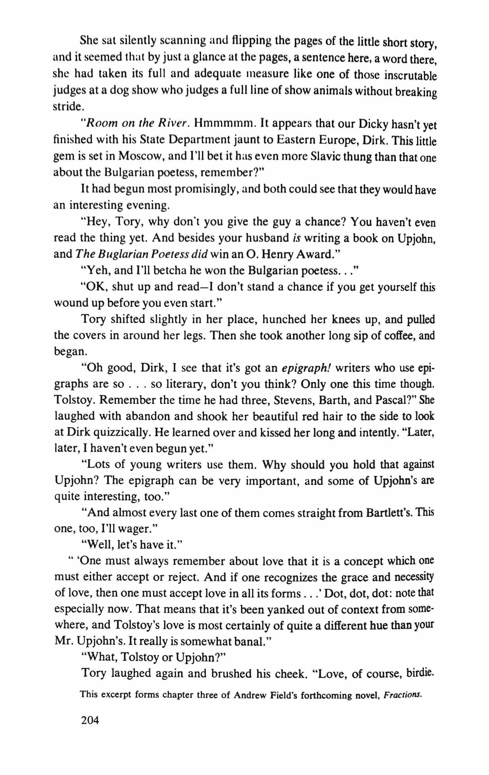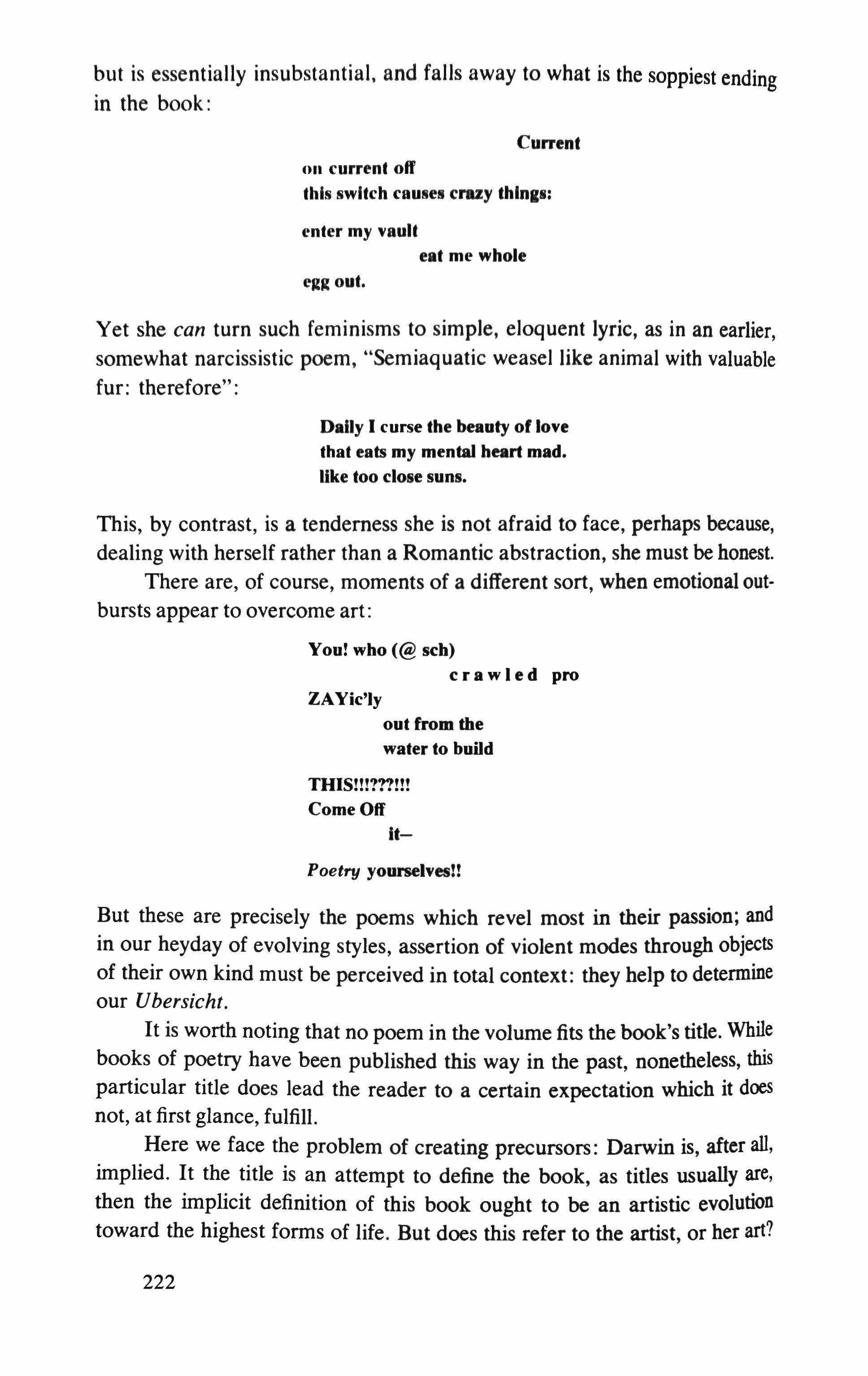 What Professor Eigen means is that Twigge-Chafe has successfully turned off his mind to nearly all possibilities-particularly those of normalcy -in an effort to demonstrate the possibility of doing so. Perhaps some tragedy lies in the worthlessness of his effort: who ever doubted what he has proved? Or maybe this is not a tragic flaw. The Bad Anhanglichkeit abounds in it so generously that we might be led to believe it a rampant fact in the current world: three simultaneous generations screaming, "Bad things don't happen except when fools make them happen!" and blowing their minds on The Little Golden Book of Poetry.