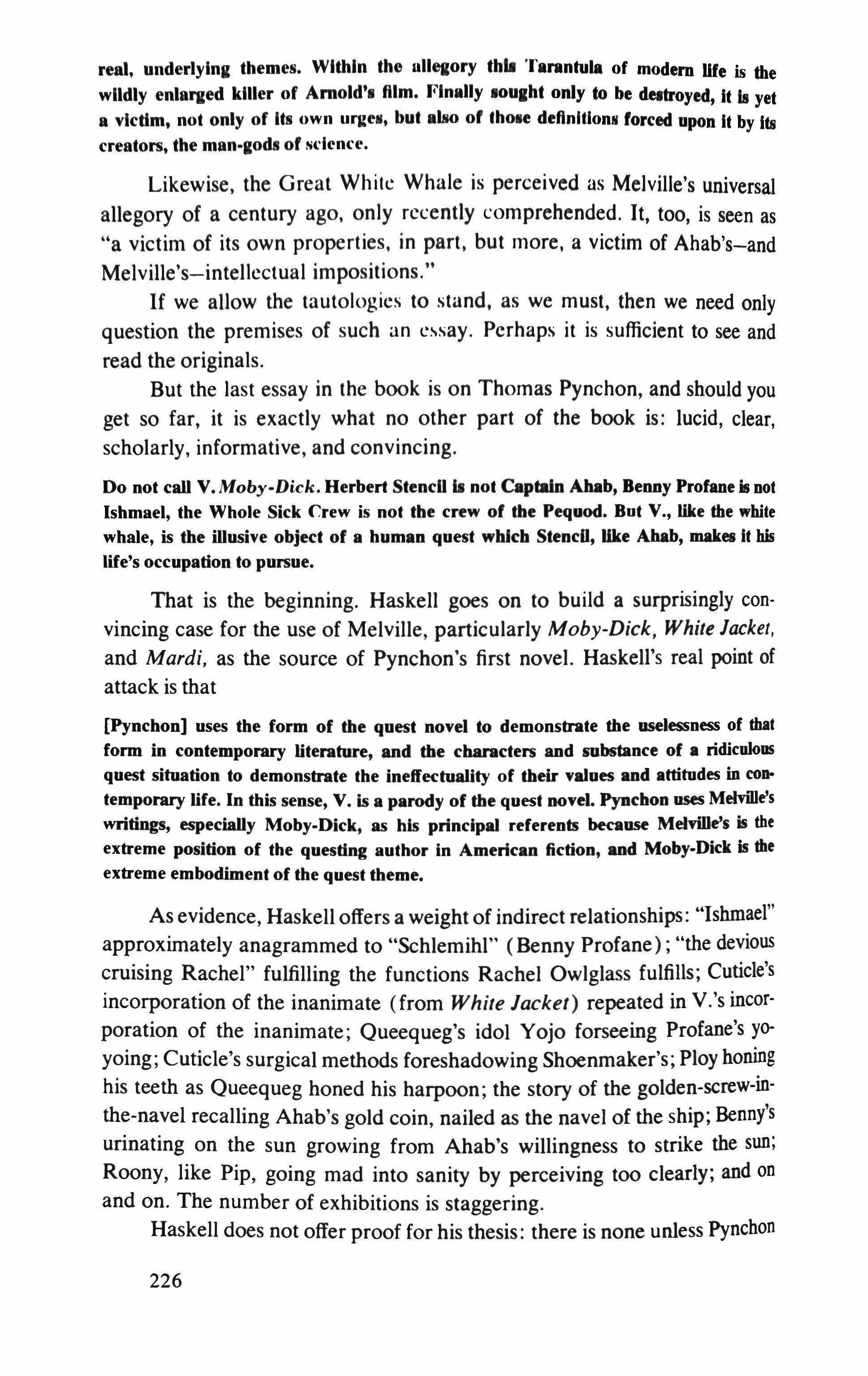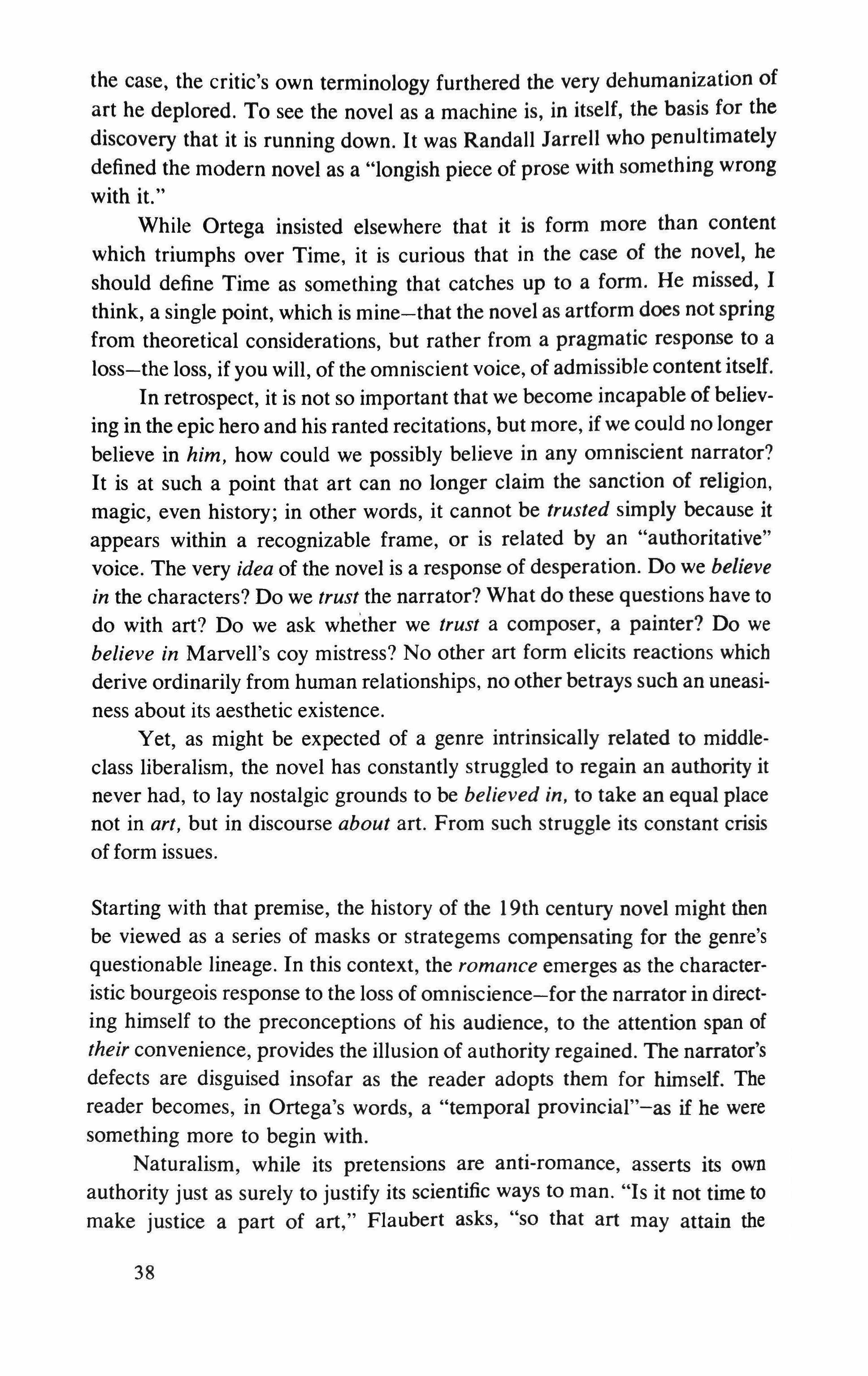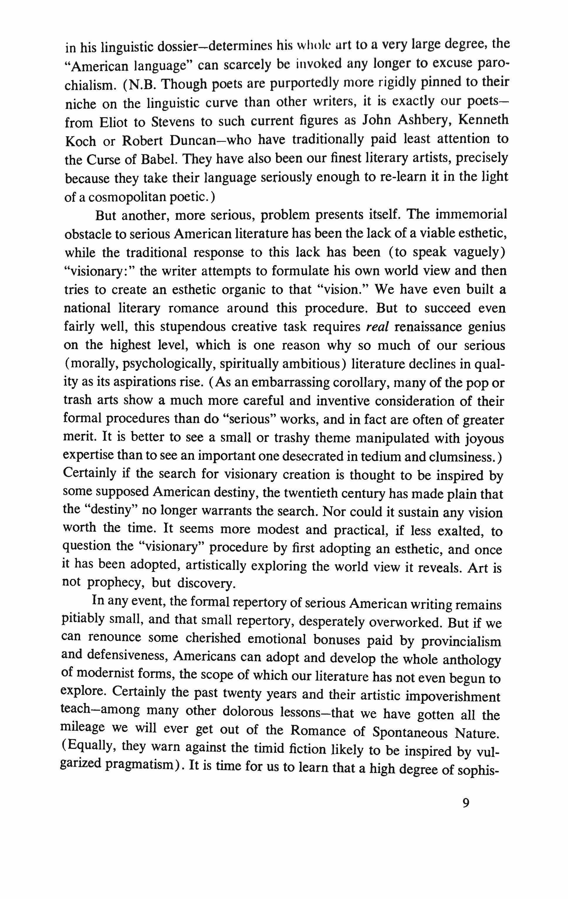 But another, more serious, problem presents itself. The immemorial obstacle to serious American literature has been the lack of a viable esthetic, while the traditional response to this lack has been (to speak vaguely) "visionary:" the writer attempts to formulate his own world view and then tries to create an esthetic organic to that "vision." We have even built a national literary romance around this procedure. But to succeed even fairly well, this stupendous creative task requires real renaissance genius on the highest level, which is one reason why so much of our serious (morally, psychologically, spiritually ambitious) literature declines in quality as its aspirations rise. (As an embarrassing corollary, many of the pop or trash arts show a much more careful and inventive consideration of their formal procedures than do "serious" works, and in fact are often of greater merit. It is better to see a small or trashy theme manipulated with joyous expertise than to see an important one desecrated in tedium and clumsiness.) Certainly if the search for visionary creation is thought to be inspired by some supposed American destiny, the twentieth century has made plain that the "destiny" no longer warrants the search. Nor could it sustain any vision worth the time. It seems more modest and practical, if less exalted, to question the "visionary" procedure by first adopting an esthetic, and once it has been adopted, artistically exploring the world view it reveals. Art is not prophecy, but discovery.