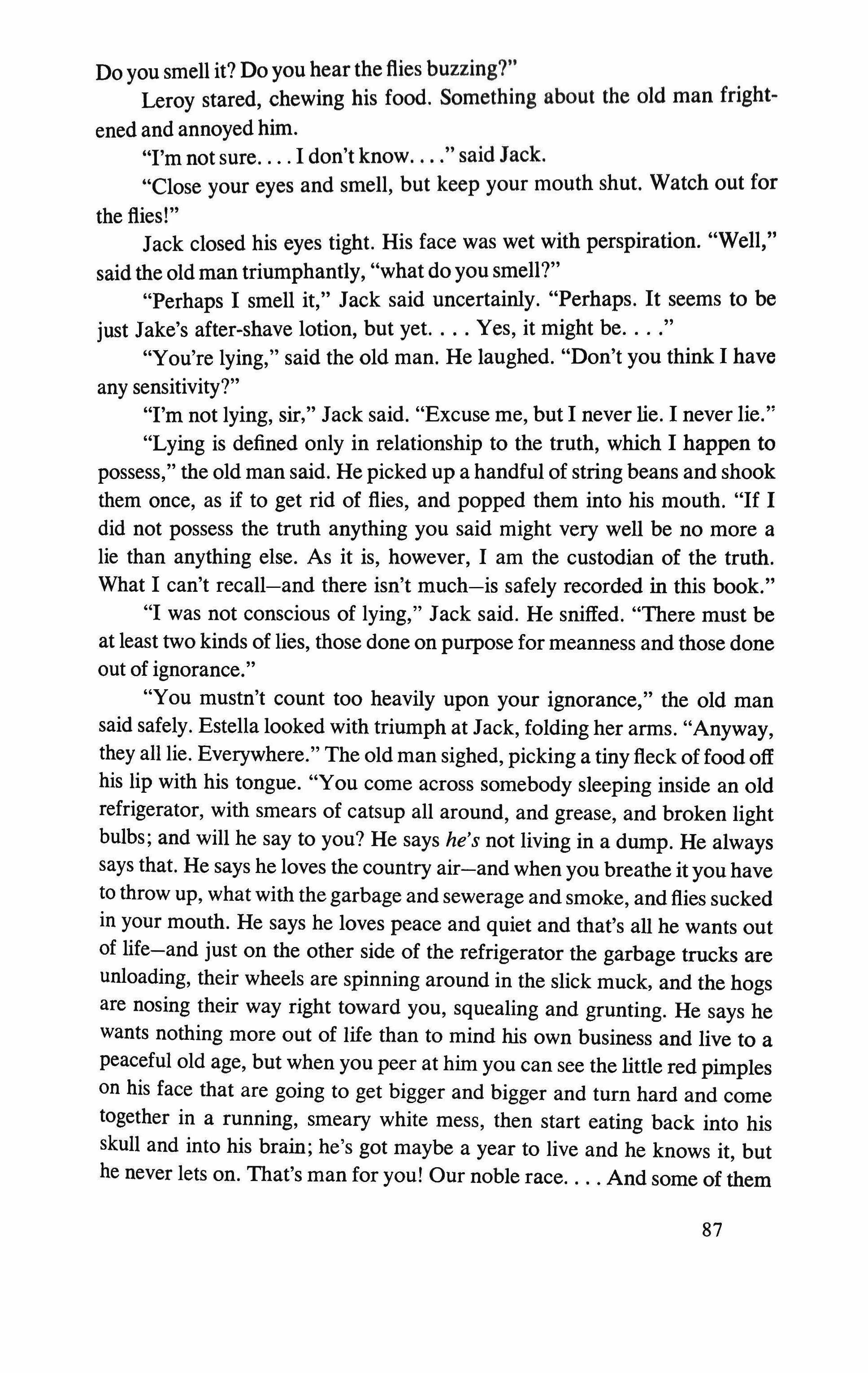 Is it Harris's responsibility to teach us the difference between the all and the nothing of this proof? I think not; we are better than that reason, and only on the specious grounds of a dated concept of responsibility, stemming from the equally dated idea of fully realized Man, does Foster Harris's first novel fail.