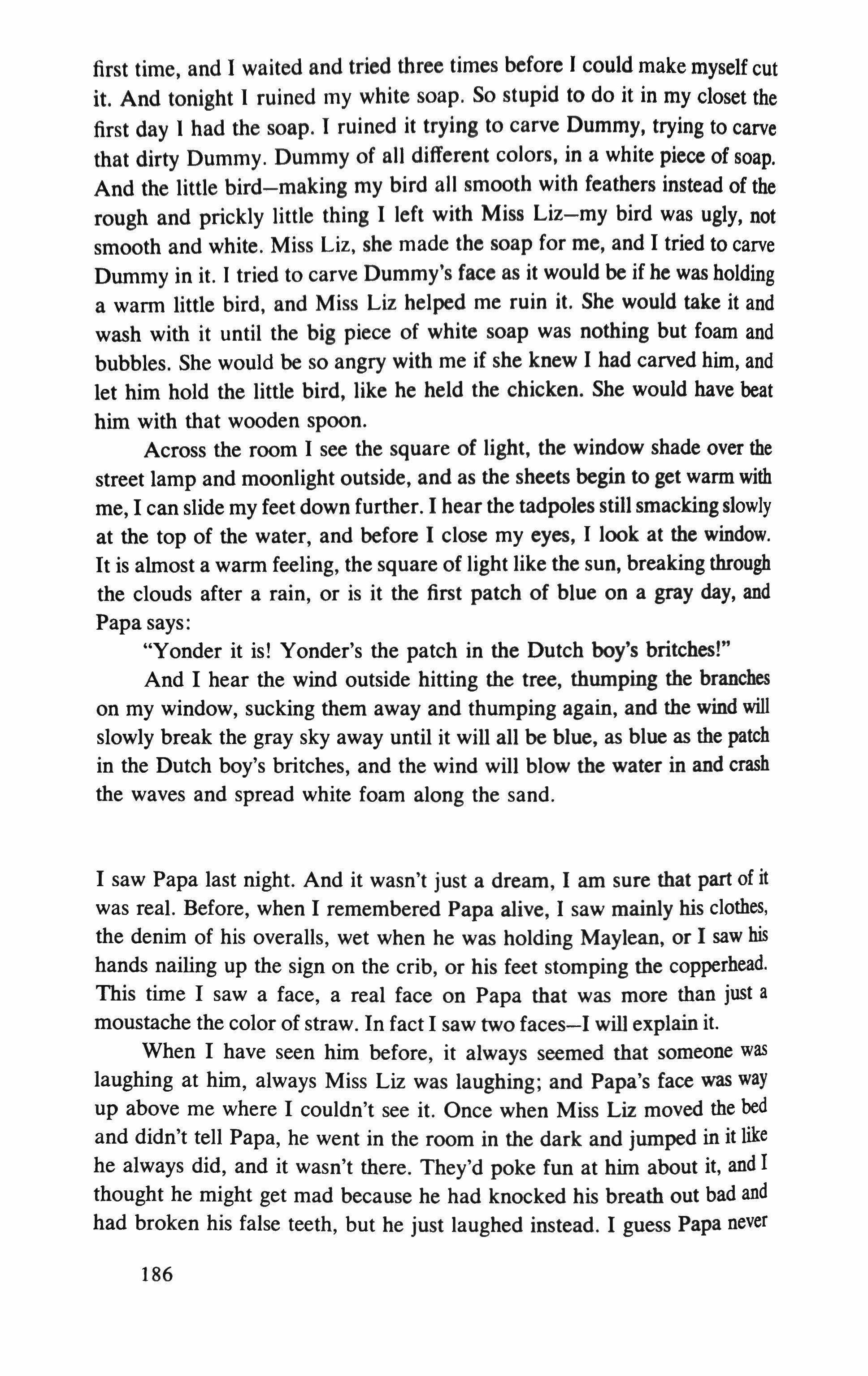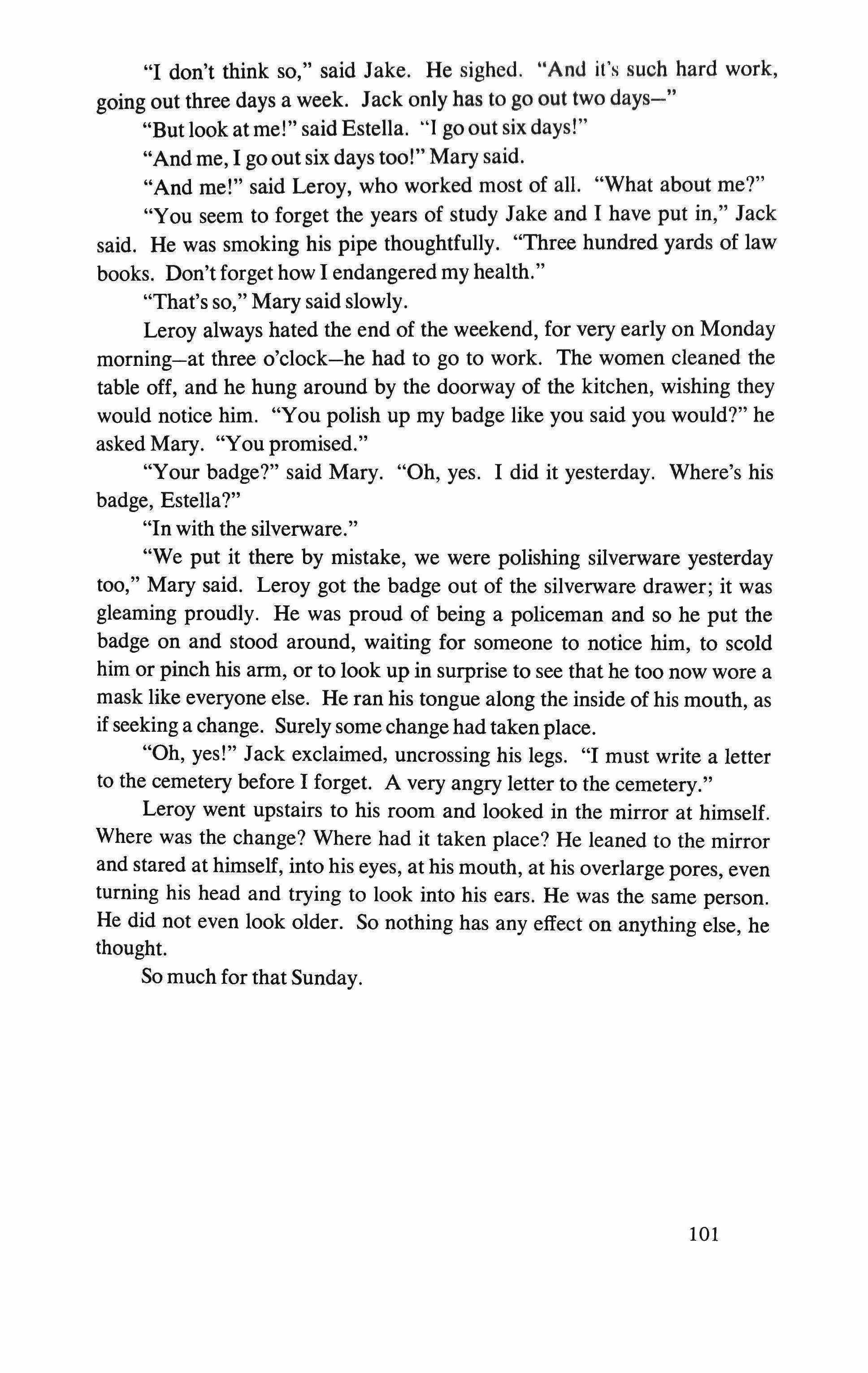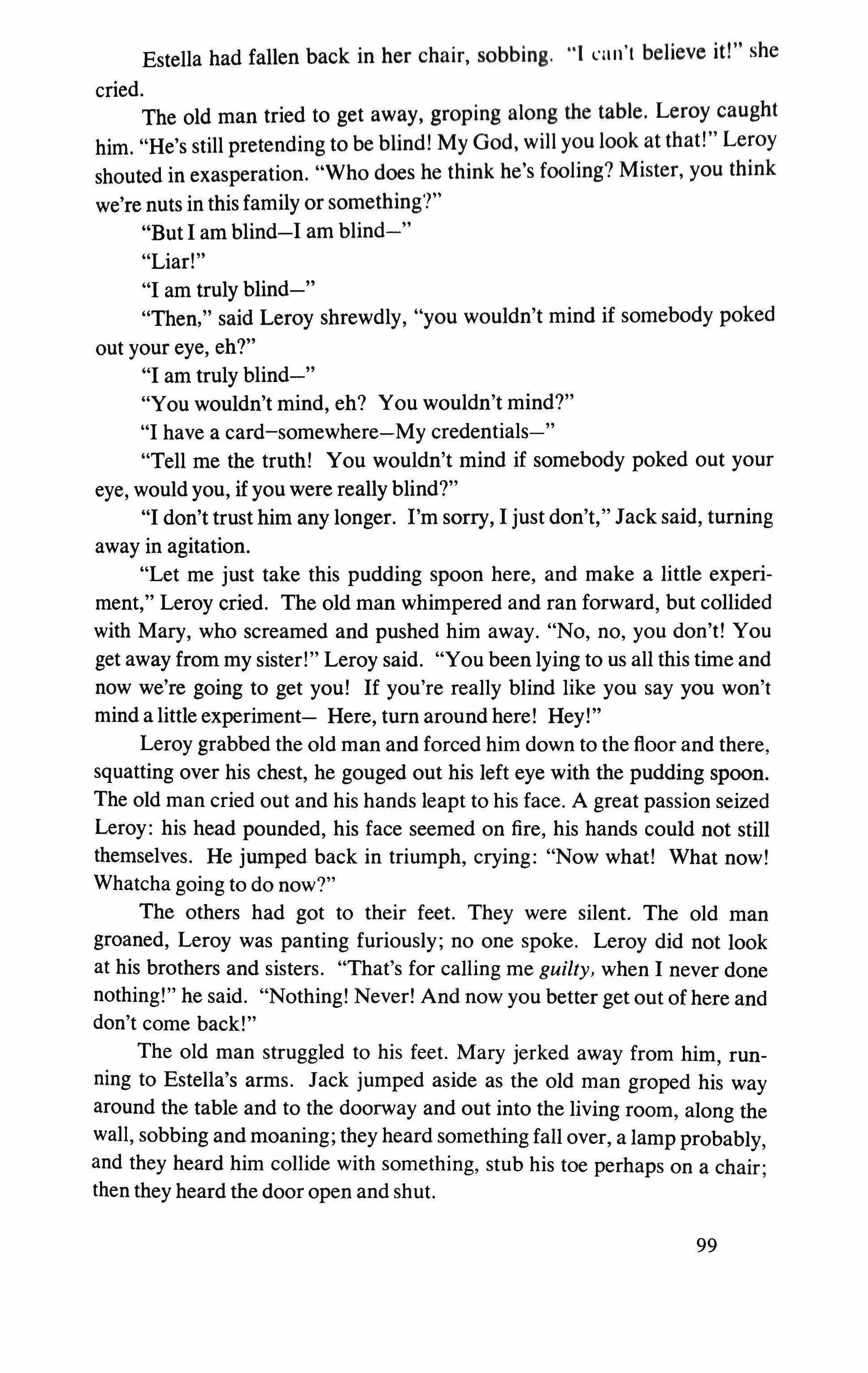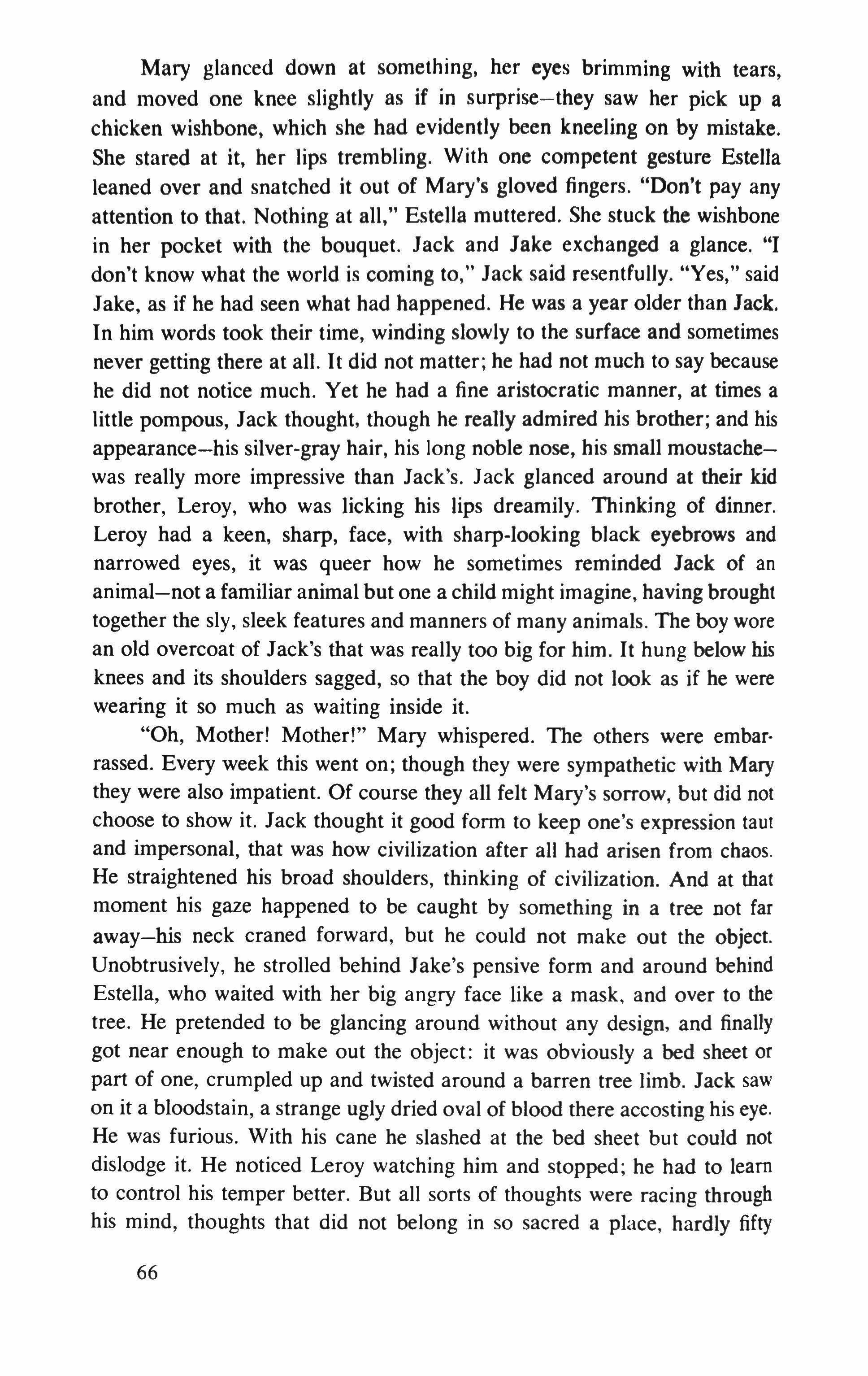 It's funny how one remembers people (The magician comes apart, his truths forsake him) I remember best her coming, the feel of her loins (His innards spill a heap of rags and straw) Perhaps that means I didn't love her (he falls) I don't know Well, I'm lucid now, I'm free.