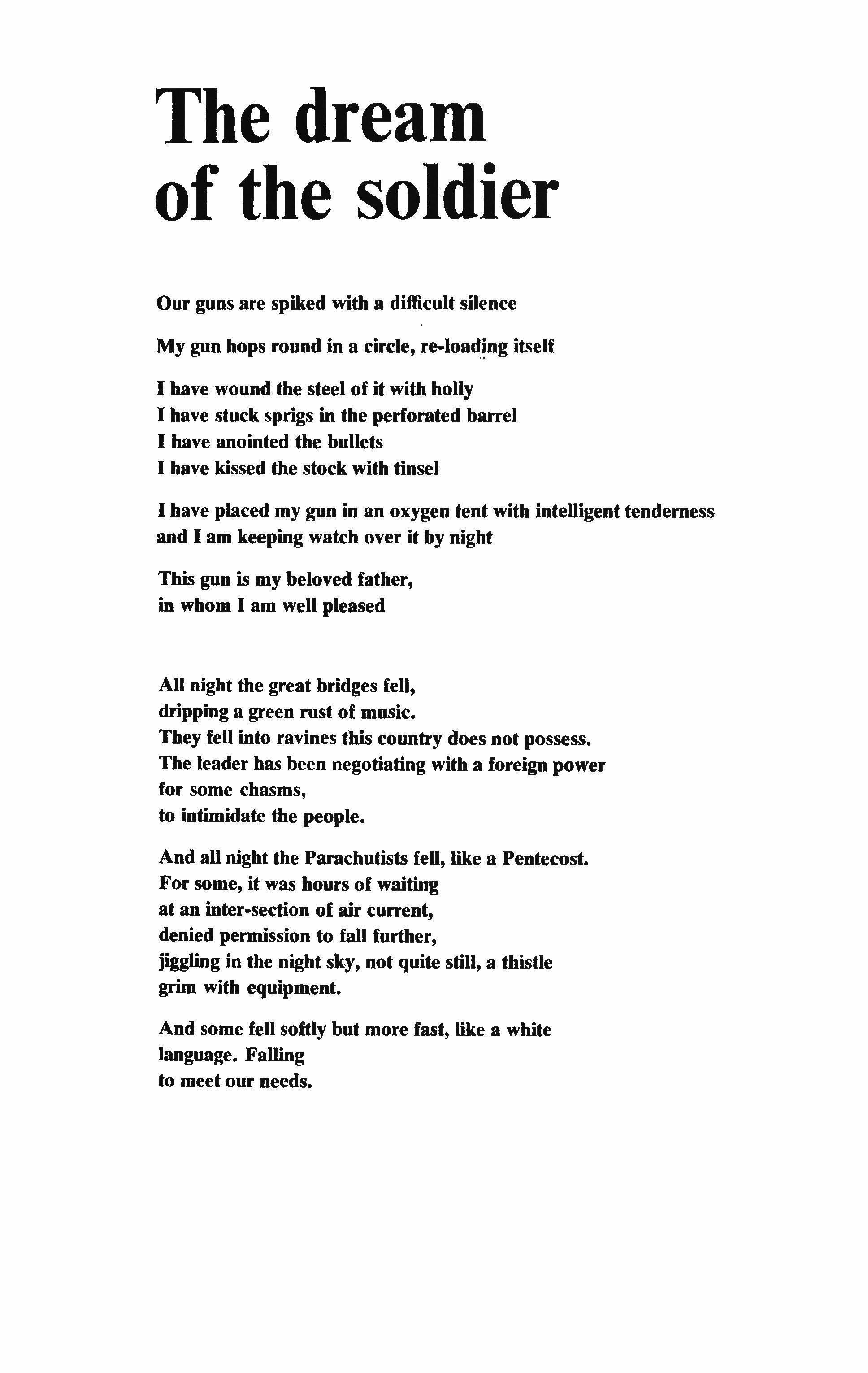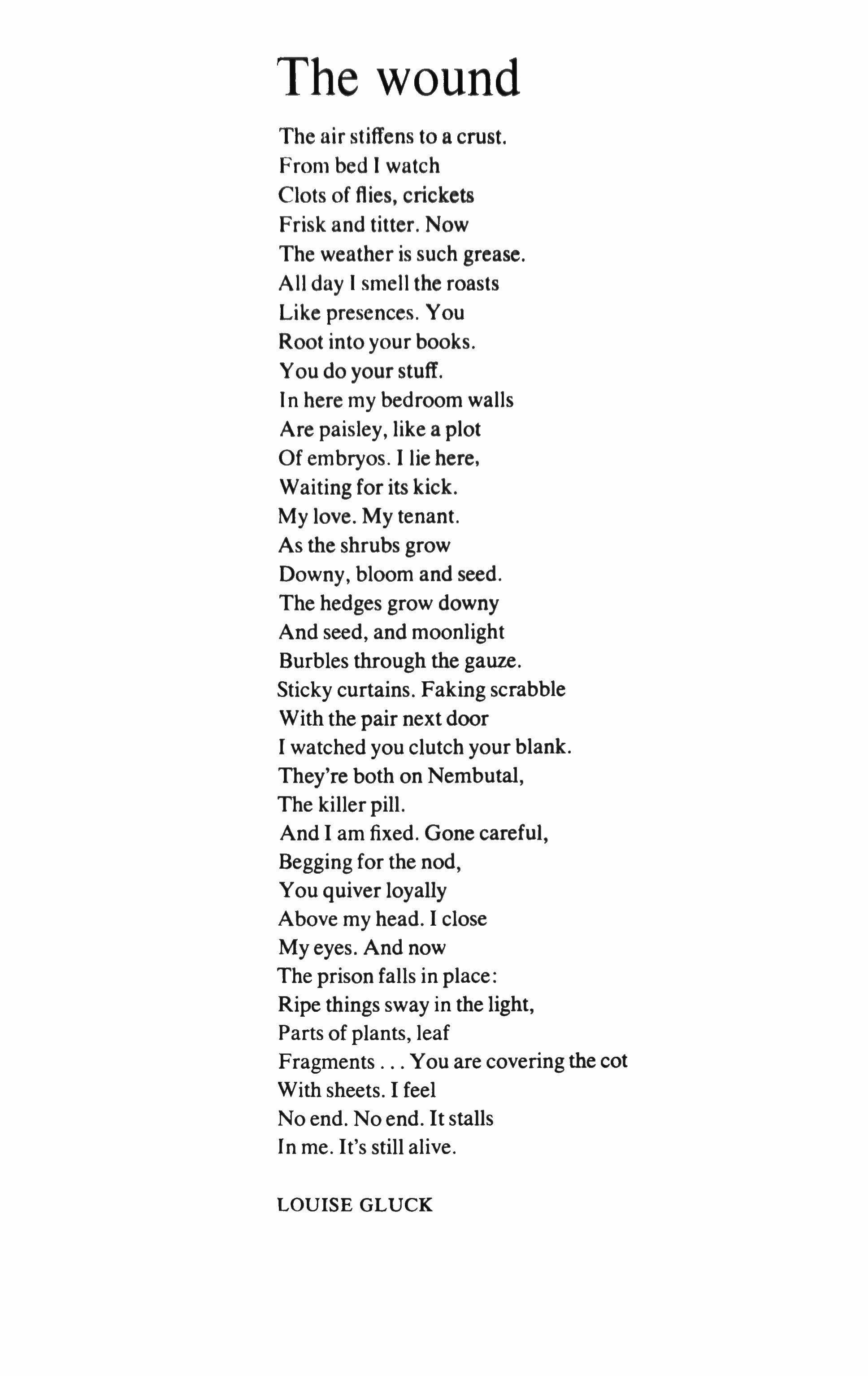 I n here my bedroom walls Are paisley, like a plot Of embryos. I lie here, Waiting for its kick. My love. My tenant. As the shrubs grow Downy, bloom and seed. The hedges grow downy And seed, and moonlight Burbles through the gauze. Sticky curtains. Faking scrabble With the pair next door I watched you clutch your blank. They're both on Nembutal, The killer pill. And I am fixed. Gone careful, Begging for the nod, You quiver loyally Above my head. I close My eyes. And now The prison falls in place: Ripe things sway in the light, Parts of plants, leaf