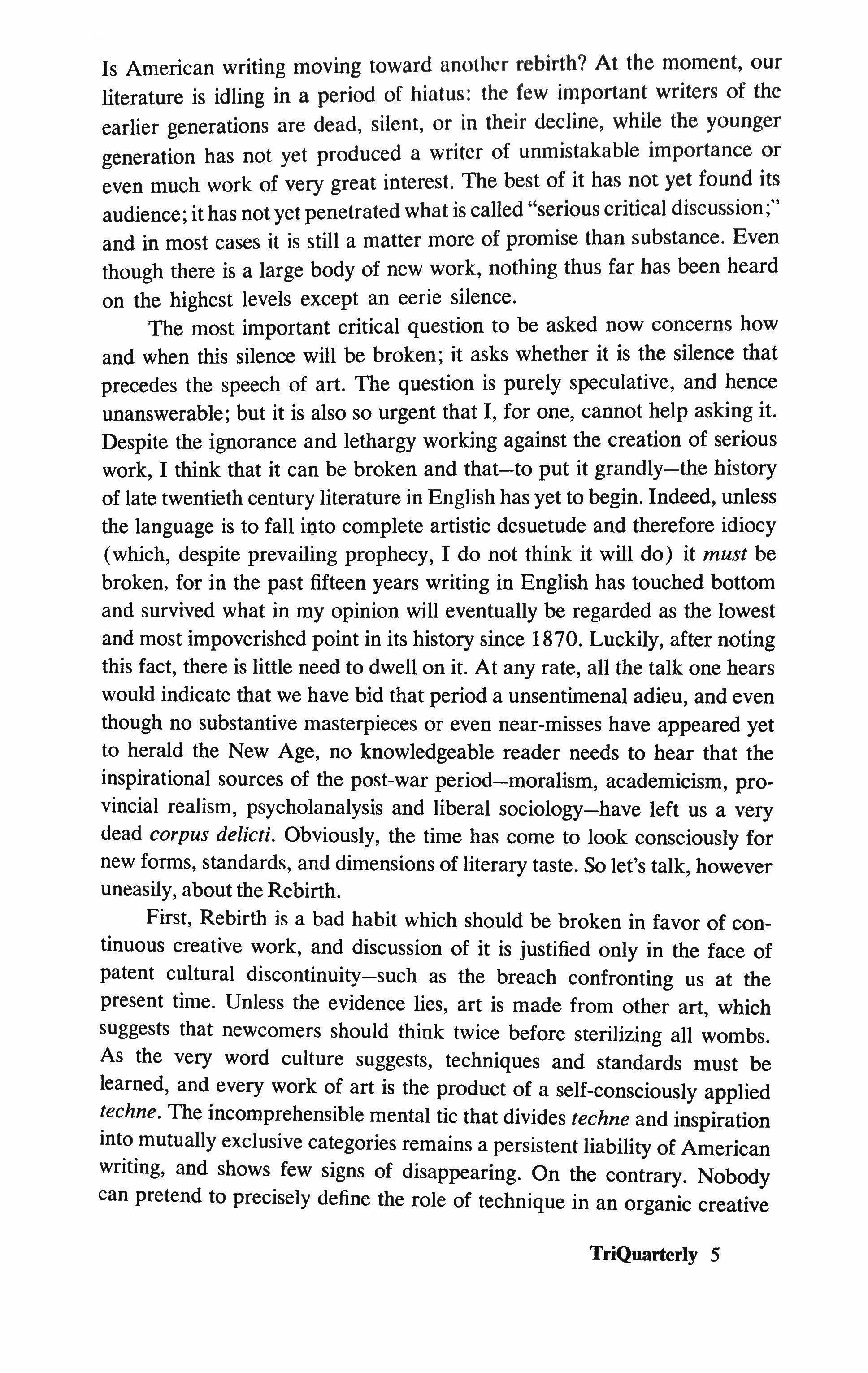 The most important critical question to be asked now concerns how and when this silence will be broken; it asks whether it is the silence that precedes the speech of art. The question is purely speculative, and hence unanswerable; but it is also so urgent that I, for one, cannot help asking it. Despite the ignorance and lethargy working against the creation of serious work, I think that it can be broken and that-to put it grandly-the history of late twentieth century literature in English has yet to begin. Indeed, unless the language is to fall into complete artistic desuetude and therefore idiocy (which, despite prevailing prophecy, I do not think it will do) it must be broken, for in the past fifteen years writing in English has touched bottom and survived what in my opinion will eventually be regarded as the lowest and most impoverished point in its history since 1870. Luckily, after noting this fact, there is little need to dwell on it. At any rate, all the talk one hears would indicate that we have bid that period a unsentimenal adieu, and even though no substantive masterpieces or even near-misses have appeared yet to herald the New Age, no knowledgeable reader needs to hear that the inspirational sources of the post-war period-moralism, academicism, provincial realism, psycholanalysis and liberal sociology-have left us a very dead corpus delicti. Obviously, the time has come to look consciously for new forms, standards, and dimensions of literary taste. So let's talk, however uneasily, about the Rebirth.