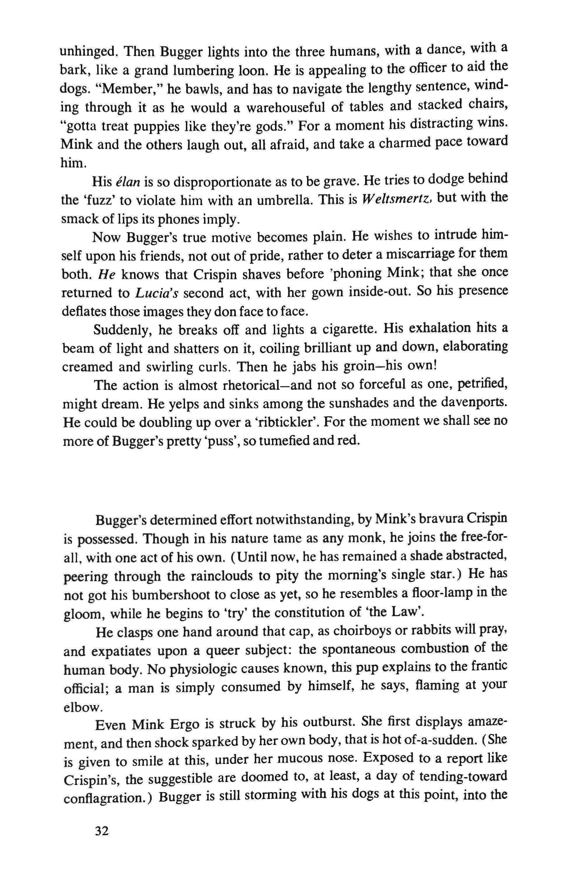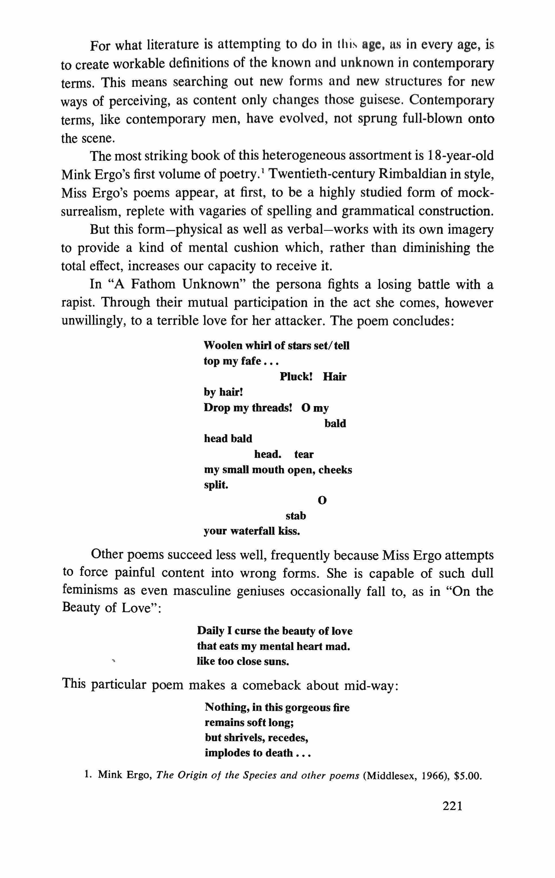 She has a loveliness despite. About the famous actor, but one suspects about herself as well, Mink wrote, "Barrault; battery. Bout always tswitch tlight. & does. ."' She sports a killing blazer, trousers, rapier umbrella, and slim tie. Hair sprays in kinks above her brains; the cut is man-style, but has crabbed out for a long six months. That craned snout of hers brags a fancy, hooked extension, too, suggesting noses can have noses all their own. She resembles, at a glance, an old man laid-out like an older woman. 'Doomed and knows it. that is why she has that look. "I'm fine," Mink Ergo has been known to pipe, "it seems to be my blood that doesn't fit."