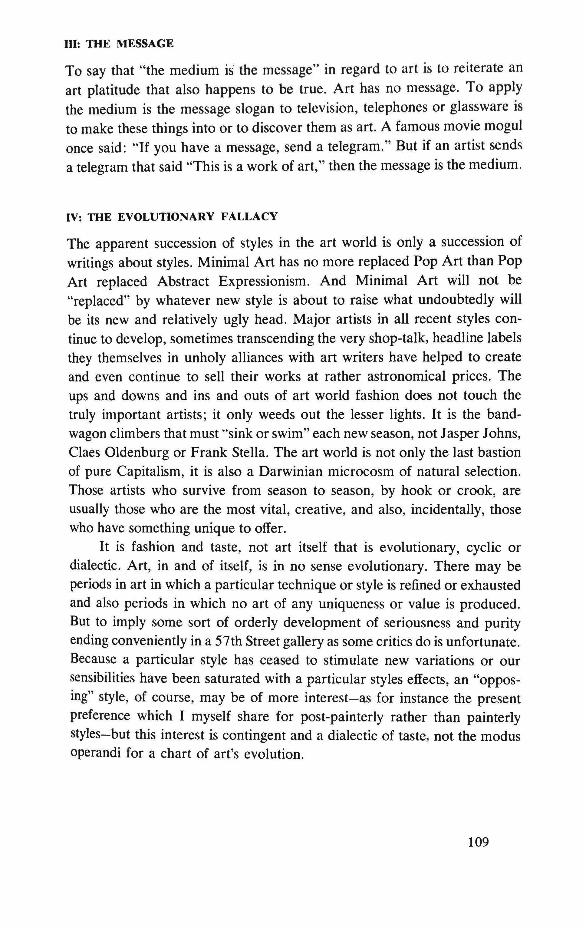 Except of course "this" technique is nowhere to be found, and I'm enough of a neo-classicist to believe that it cannot be created ex nihilo, adding that it is foolishly complacent to trust to the transcendent literary accidents that have up to now been America's specialty. (After all, even Dickinson had her sources.) But without "espousing" a given school, it is still possible to suggest guidelines. All the recent emphasis on the nature of media presents an ideal moment for writers to sophisticate their consciousness of technique. Even without postulating an "essence" for a given artistic genre, the hypothesis of an organic inventory of technical concerns intrinsic to an art and the genres of that art ought to prove extremely valuable. It may even be right to agree with Clement Greenberg that "the essence of modernism lies in the use of the characteristic methods of a discipline to criticize the discipline itself-not in order to subvert it, but to entrench it more firmly in its area of competence." The flies in the ointment of this remarkably lucid statement are the words "essence" and "criticize." Mistrusting any doctrines of essences, I am unwilling to accept Greenberg's idea except as a useful touchstone for the creation of an artistic vocabulary. At the same time, I don't think that the "criticism" of a discipline can properly define that vocabulary without unnecessary loss to its expressive range and its flexibility. Finally, this "criticism" establishes an idea of a continuous history running like a backbone through a given art which, even if real, is not very interesting, any more than it is very interesting that man can properly be defined as a vertebrate.