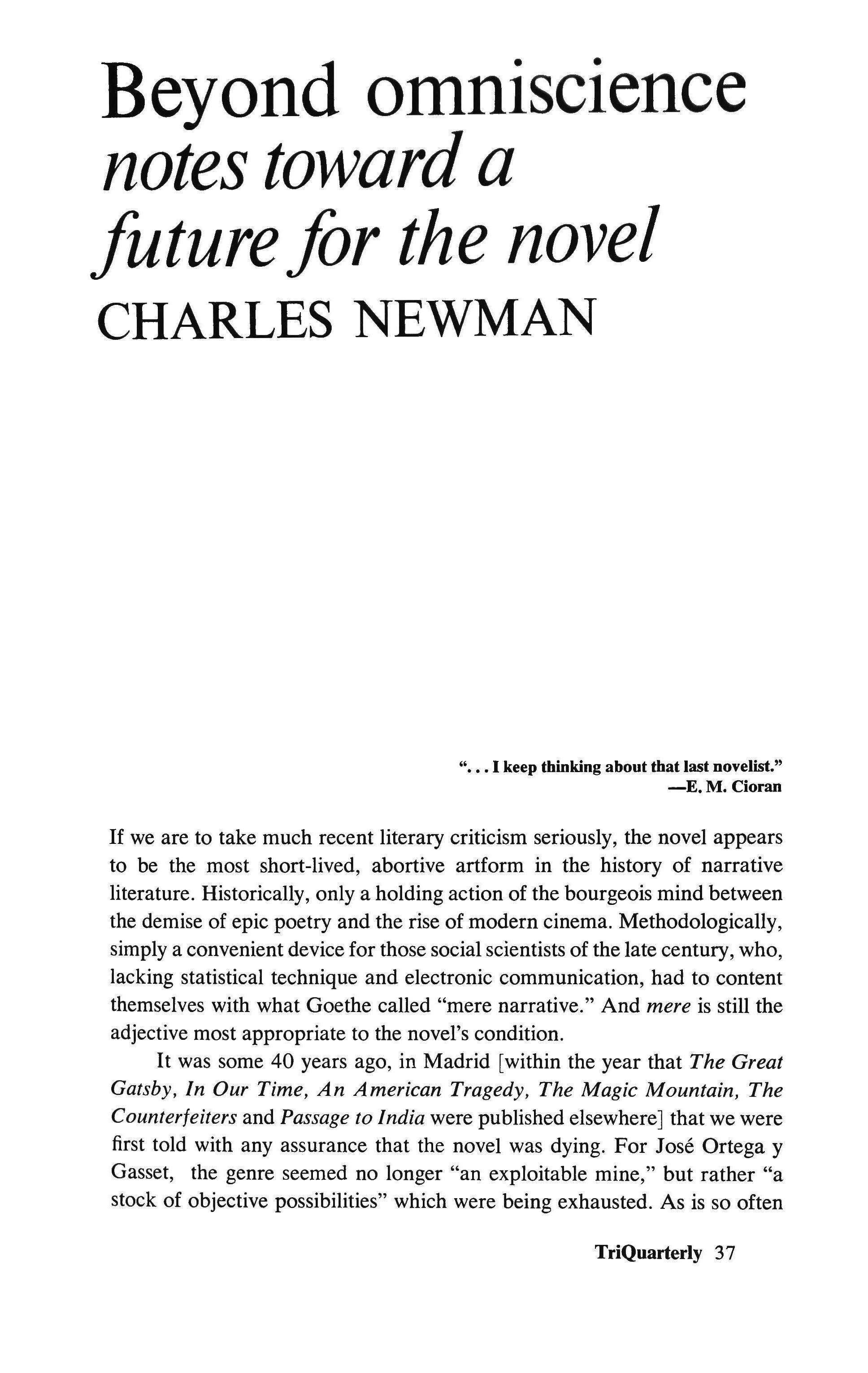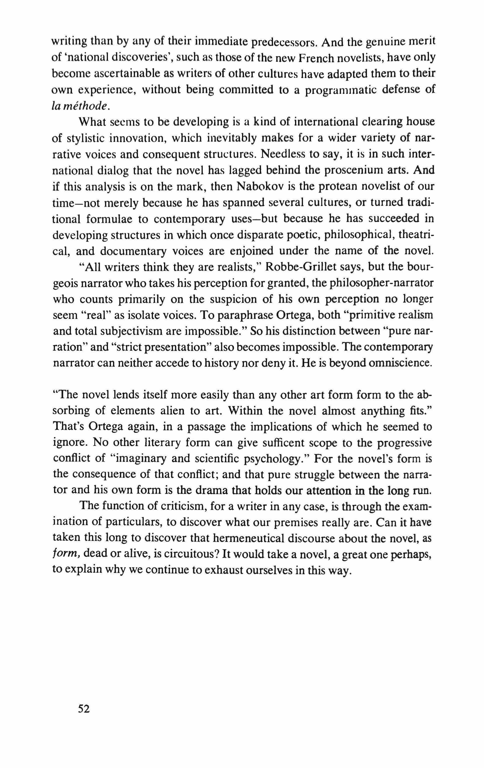 What are we to make of this? The end of the end of the novel? We strive in art as in anything else for a balance of power which will check none but the incapacitating extremes. Yet, when the center path and the most innocuous edges have been worn beyond use, we must force new ones in any area that will open to us.