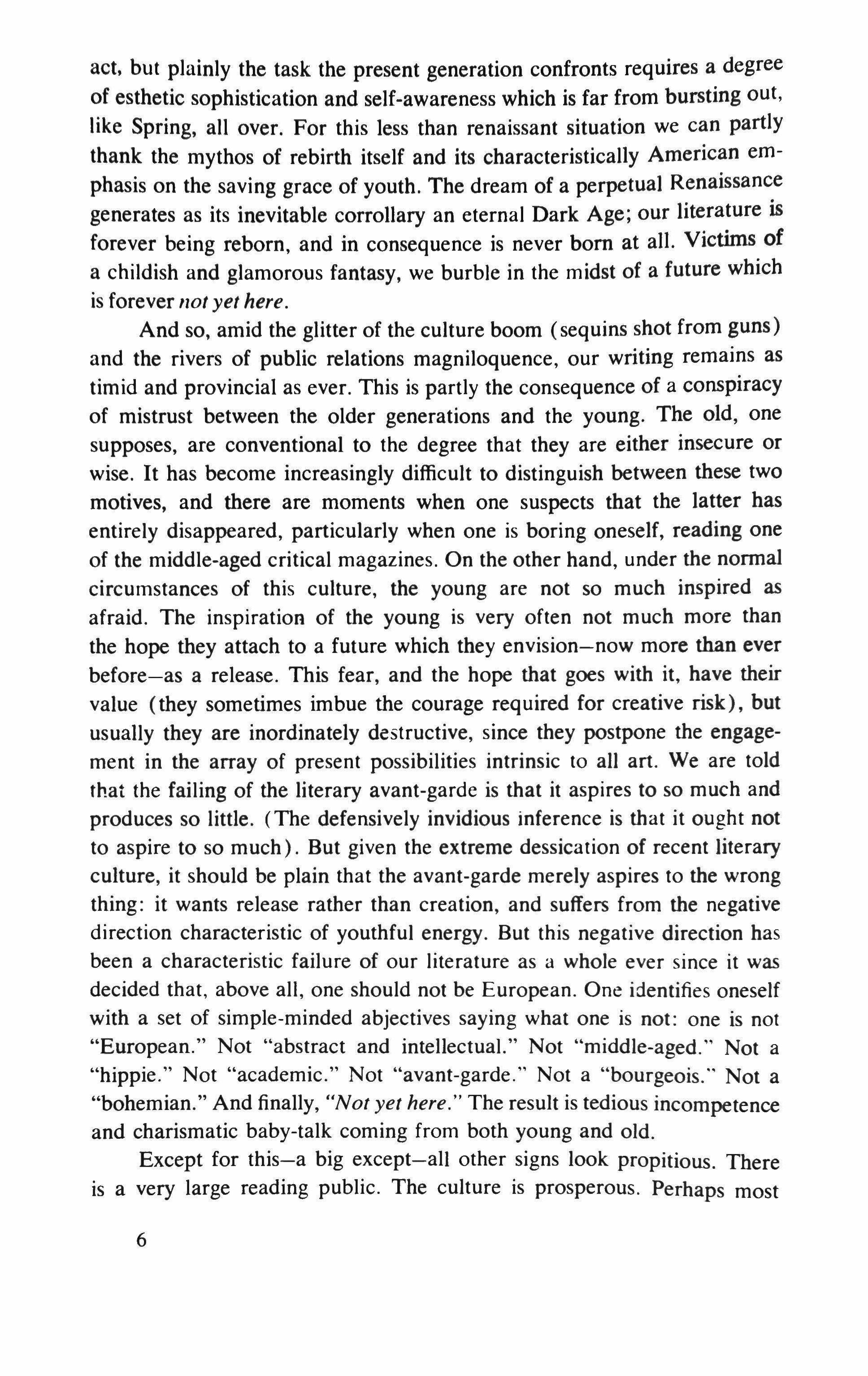 And so, amid the glitter of the culture boom (sequins shot from guns) and the rivers of public relations magniloquence, our writing remains as timid and provincial as ever. This is partly the consequence of a conspiracy of mistrust between the older generations and the young. The old, one supposes, are conventional to the degree that they are either insecure or wise. It has become increasingly difficult to distinguish between these two motives, and there are moments when one suspects that the latter has entirely disappeared, particularly when one is boring oneself, reading one of the middle-aged critical magazines. On the other hand, under the normal circumstances of this culture, the young are not so much inspired as afraid. The inspiration of the young is very often not much more than the hope they attach to a future which they envision-now more than ever before-as a release. This fear, and the hope that goes with it, have their value (they sometimes imbue the courage required for creative risk), but usually they are inordinately destructive, since they postpone the engagement in the array of present possibilities intrinsic to all art. We are told that the failing of the literary avant-garde is that it aspires to so much and produces so little. (The defensively invidious inference is that it ought not to aspire to so much). But given the extreme dessication of recent literary culture, it should be plain that the avant-garde merely aspires to the wrong thing: it wants release rather than creation, and suffers from the negative direction characteristic of youthful energy. But this negative direction has been a characteristic failure of our literature as a whole ever since it was decided that, above all, one should not be European. One identifies oneself with a set of simple-minded abjectives saying what one is not: one is not "European." Not "abstract and intellectual." Not "middle-aged." Not a "hippie." Not "academic." Not "avant-garde." Not a "bourgeois." Not a "bohemian." And finally, "Not yet here." The result is tedious incompetence and charismatic baby-talk coming from both young and old.