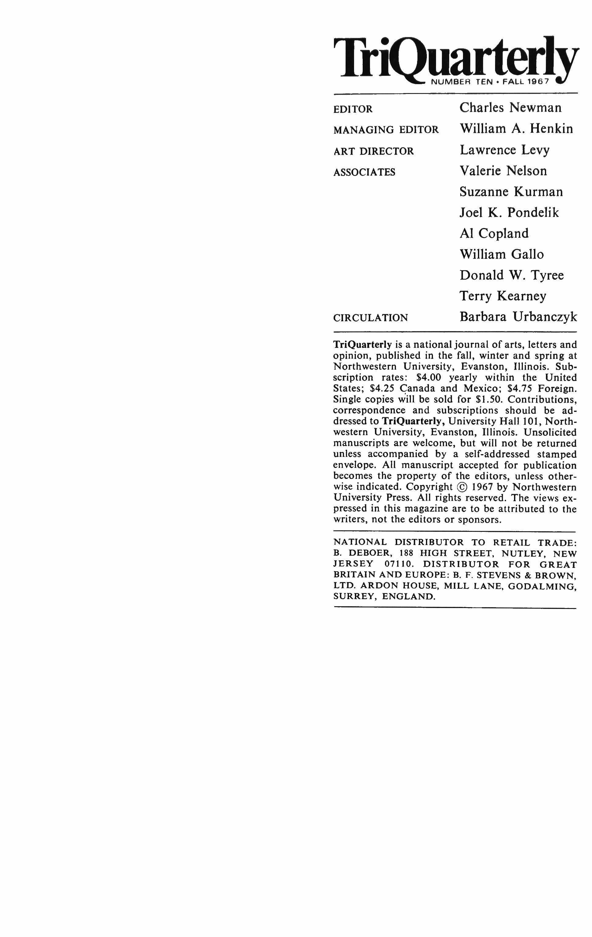 TriQuarterIy is a national journal of arts, letters and opinion, published in the fall, winter and spring at Northwestern University, Evanston, Illinois. Subscription rates: $4.00 yearly within the United States; $4.25 Canada and Mexico; $4.75 Foreign. Single copies will be sold for $1.50. Contributions, correspondence and subscriptions should be addressed to TriQuarterly, University Hall 101, Northwestern University, Evanston, Illinois. Unsolicited manuscripts are welcome, but will not be returned unless accompanied by a self-addressed stamped envelope. All manuscript accepted for publication becomes the property of the editors, unless otherwise indicated. Copyright © 1967 by Northwestern University Press. All rights reserved. The views expressed in this magazine are to be attributed to the writers, not the editors or sponsors.