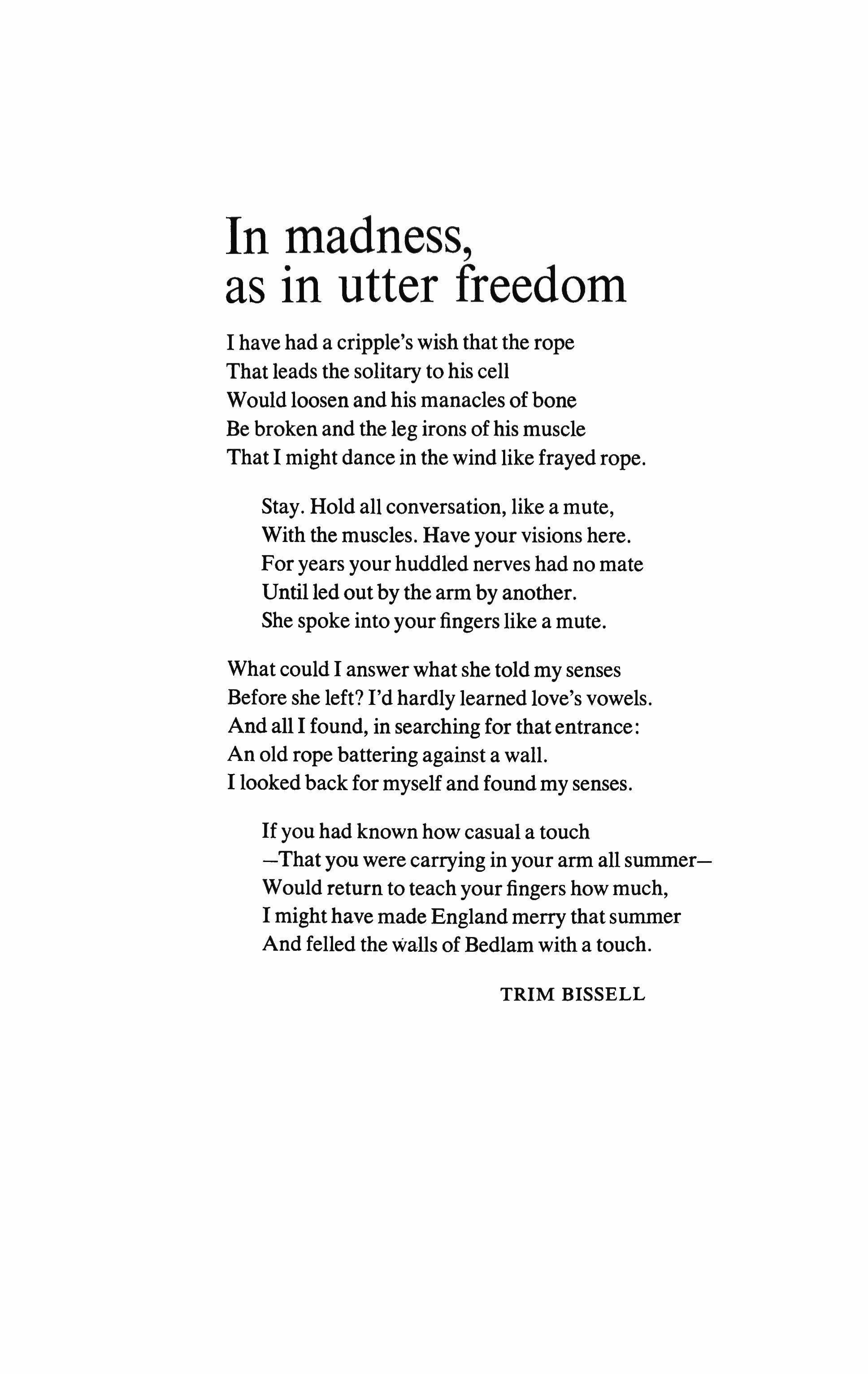 I have had a cripple's wish that the rope That leads the solitary to his cell Would loosen and his manacles of bone Be broken and the leg irons of his muscle That I might dance in the wind like frayed rope.