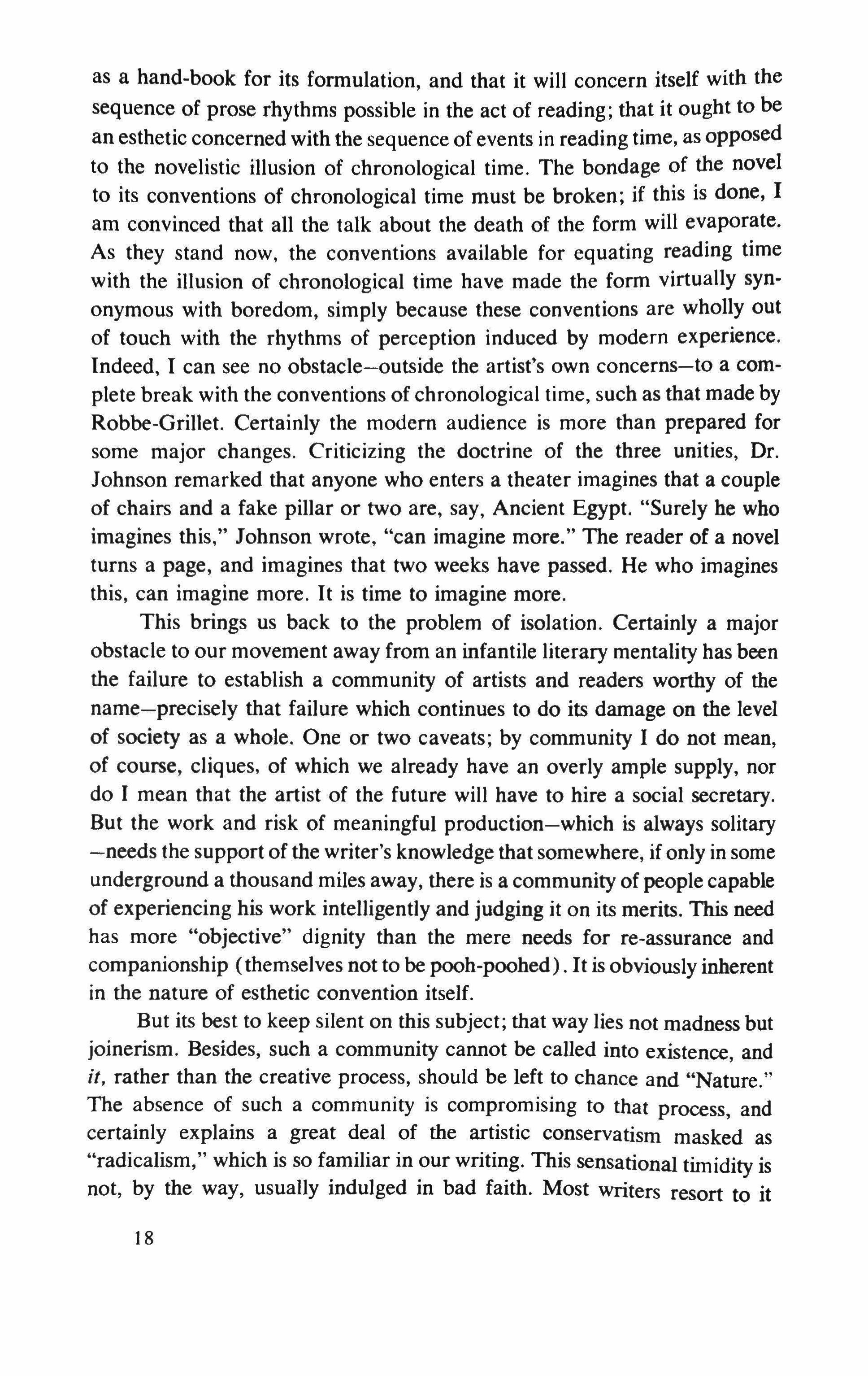 as a hand-book for its formulation, and that it will concern itself with the sequence of prose rhythms possible in the act of reading; that it ought to be an esthetic concerned with the sequence of events in reading time, as opposed to the novelistic illusion of chronological time. The bondage of the novel to its conventions of chronological time must be broken; if this is done, I am convinced that all the talk about the death of the form will evaporate. As they stand now, the conventions available for equating reading time with the illusion of chronological time have made the form virtually synonymous with boredom, simply because these conventions are wholly out of touch with the rhythms of perception induced by modern experience. Indeed, I can see no obstacle-outside the artist's own concerns-to a complete break with the conventions of chronological time, such as that made by Robbe-Grillet, Certainly the modem audience is more than prepared for some major changes. Criticizing the doctrine of the three unities, Dr. Johnson remarked that anyone who enters a theater imagines that a couple of chairs and a fake pillar or two are, say, Ancient Egypt. "Surely he who imagines this," Johnson wrote, "can imagine more." The reader of a novel turns a page, and imagines that two weeks have passed. He who imagines this, can imagine more. It is time to imagine more.