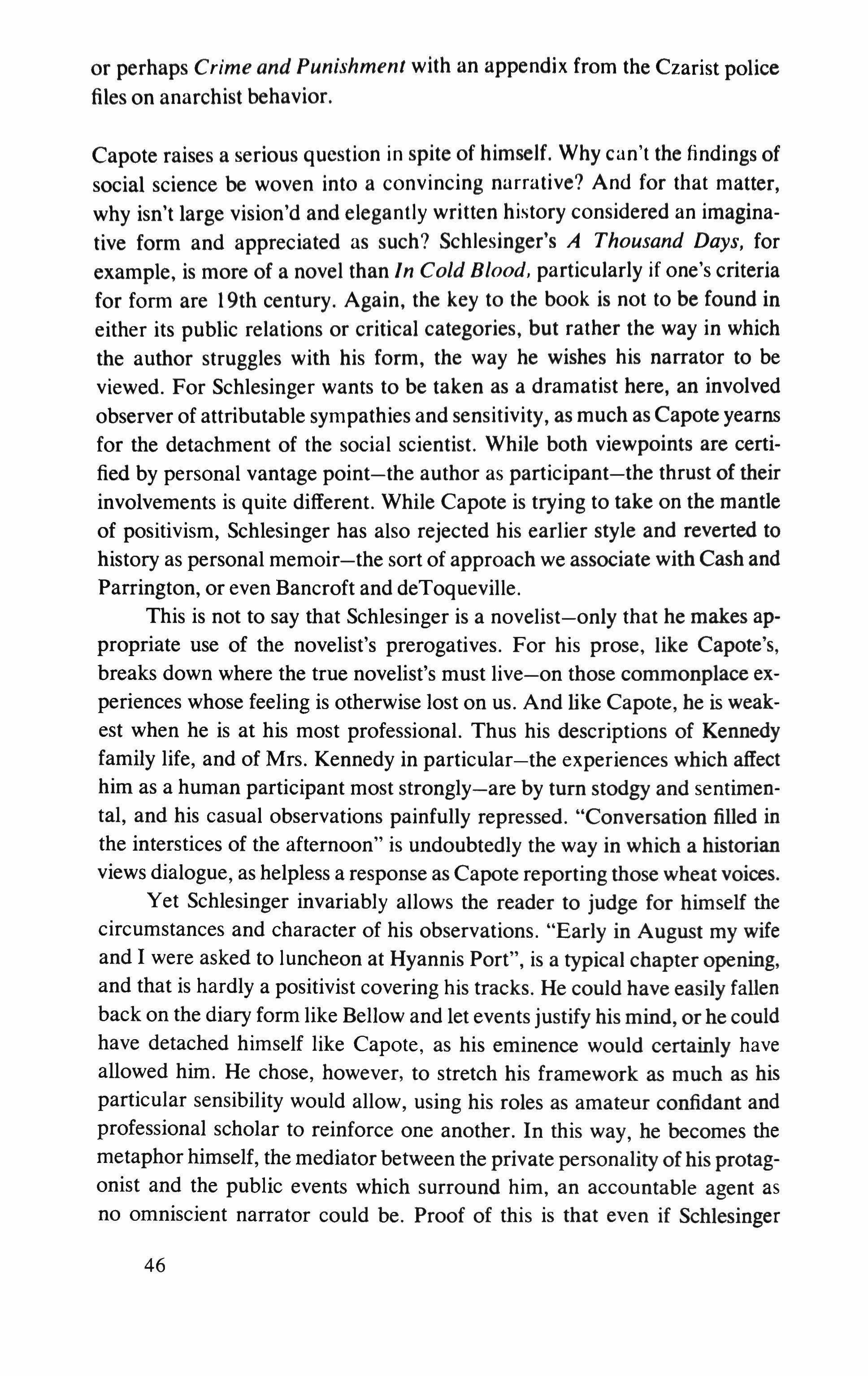 And so the young American literary artist faces the traditional impasse of his ancestors: the opportunity to work wonders and almost nothing at all to work them with; no training, no tradition, no models, no mentors. The liberal imagination (i.e. the esthetically conservative imagination) successfully ruptured the modernist tradition which had gotten firmly under way during the early phase of the century, and the brilliant achievements of that era now seem terribly remote and a little marmoreal. On the other hand the period of reaction which the thirties set in motion, and which has continued until quite recently, seems still more remote, though it is closer in time. It can even be argued that the literature of 1967 has improved very little since Henry James fled the American scene in 1876. It is certainly true that the rubbish his friend Howells accepted for publication in such journals as Godey's Ladies' Book and the Atlantic was the counterpart to our own Brooklyn and Boise bestsellers. But if our writing hasn't risen in quality, the cultural "complex" has certainly changed, exactly as James foretold it would. (See his preface to Lady Barbarina). In 1876 that rubbish
