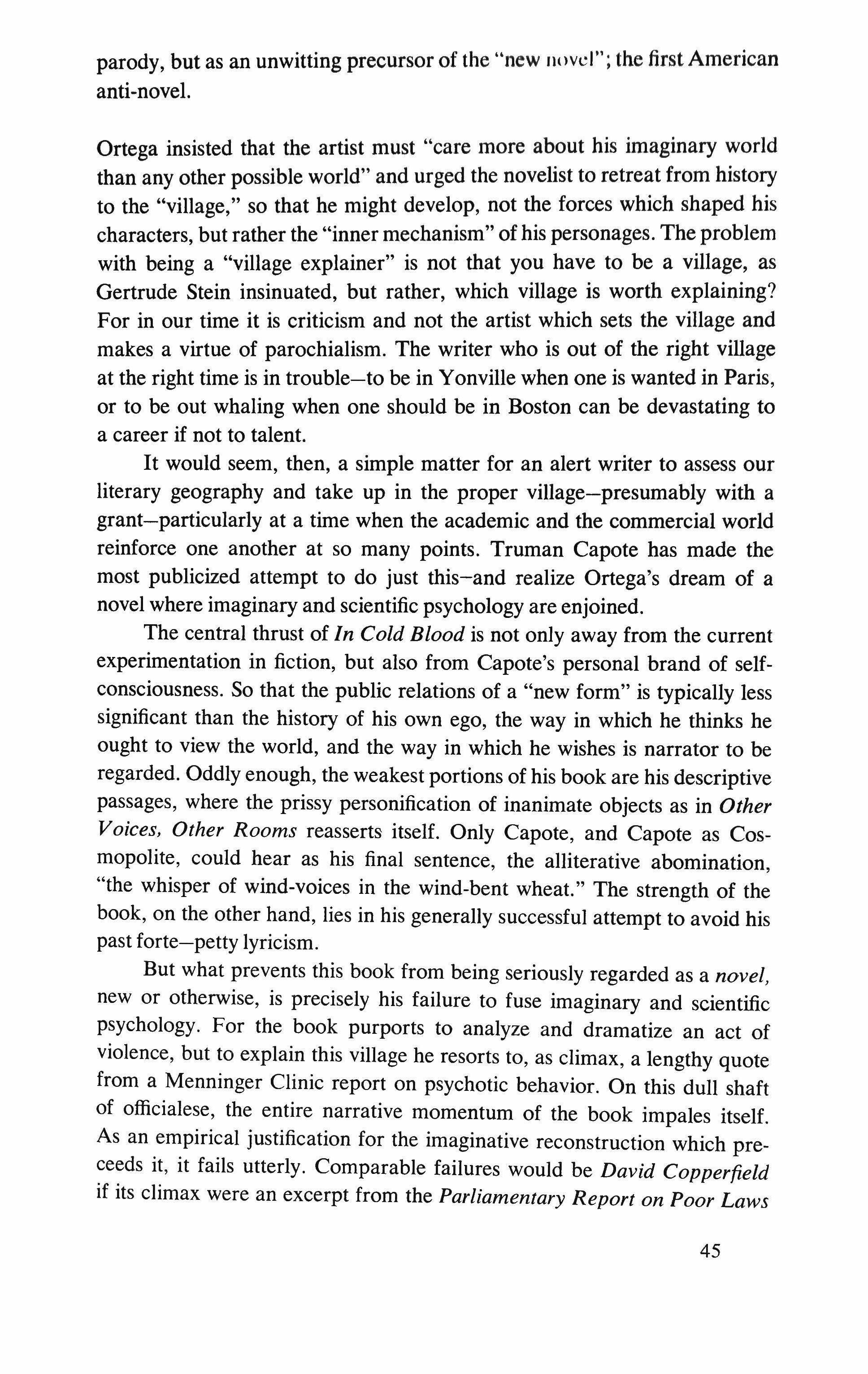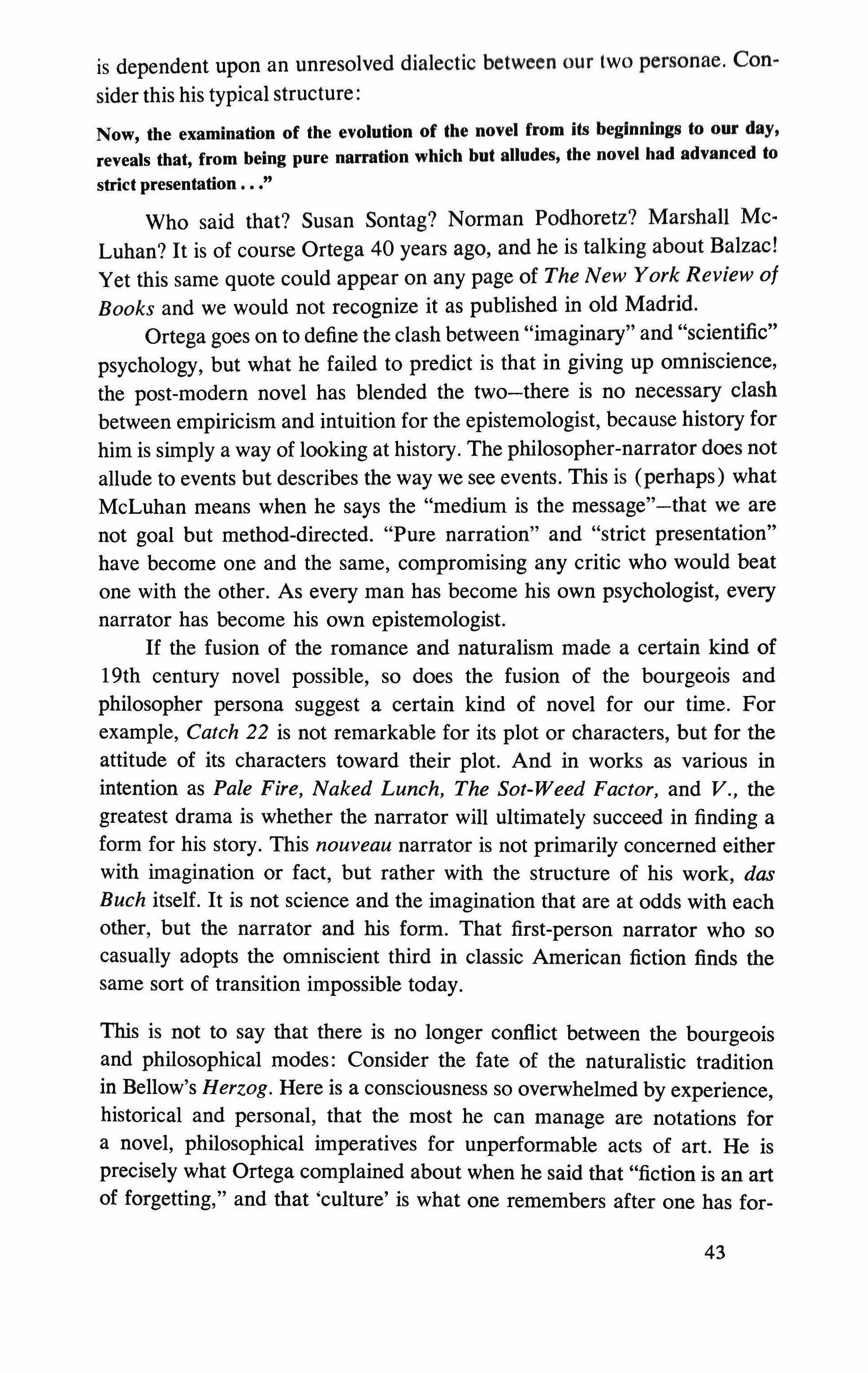 In any event, the formal repertory of serious American writing remains pitiably small, and that small repertory, desperately overworked. But if we can renounce some cherished emotional bonuses paid by provincialism and defensiveness, Americans can adopt and develop the whole anthology of modernist forms, the scope of which our literature has not even begun to explore. Certainly the past twenty years and their artistic impoverishment teach-among many other dolorous lessons-that we have gotten all the mileage we will ever get out of the Romance of Spontaneous Nature. (Equally, they warn against the timid fiction likely to be inspired by vulgarized pragmatism). It is time for us to learn that a high degree of sophis-