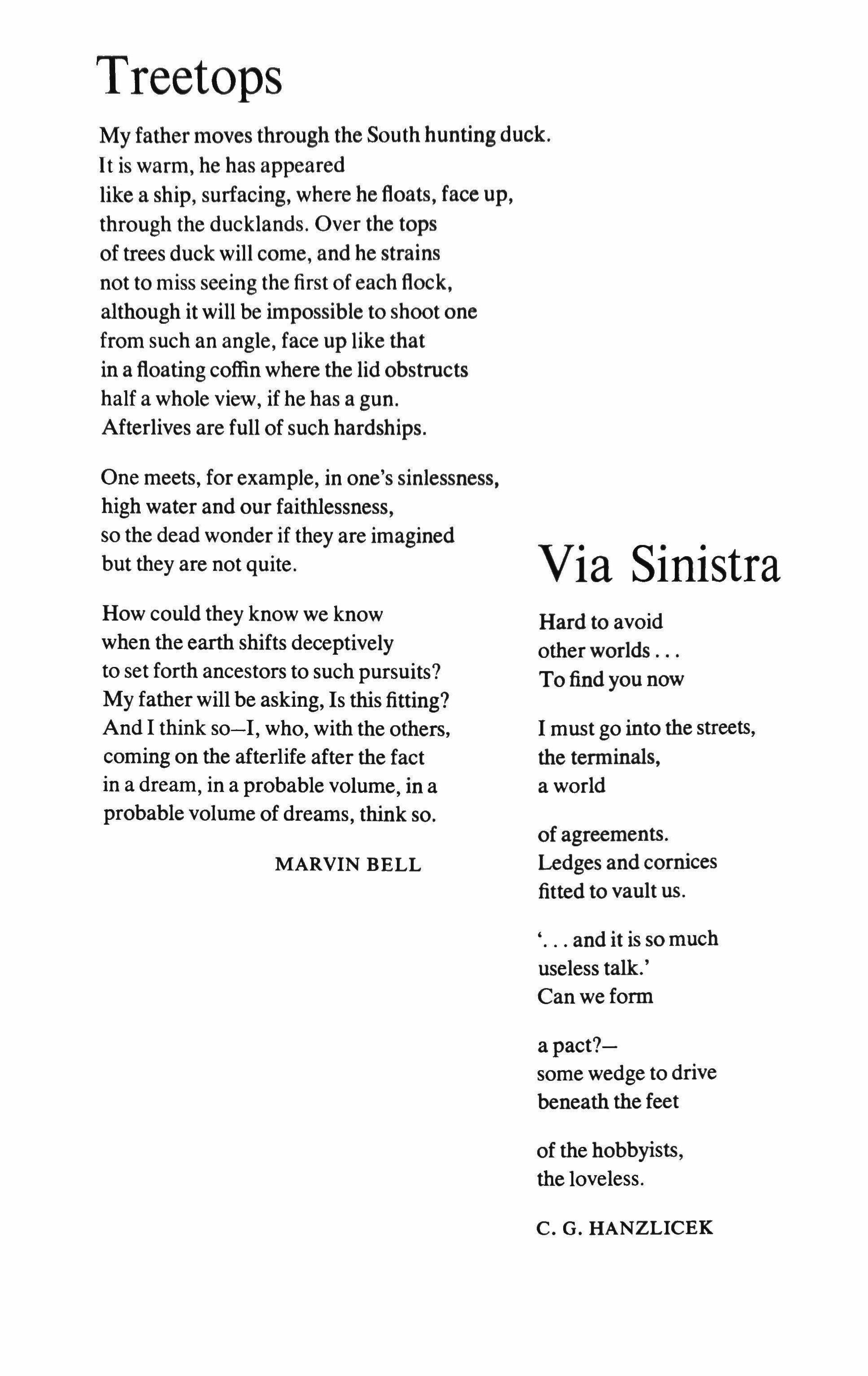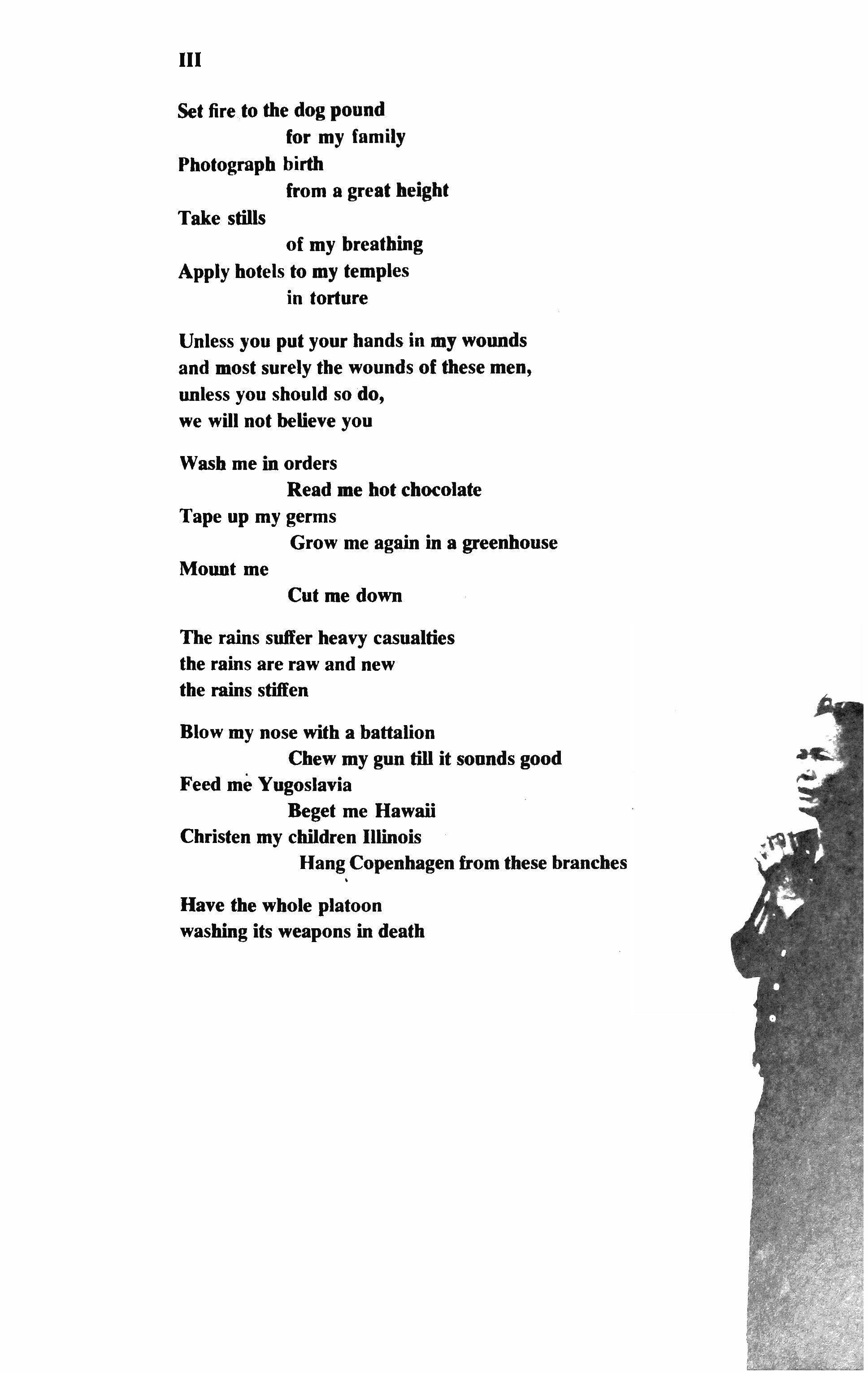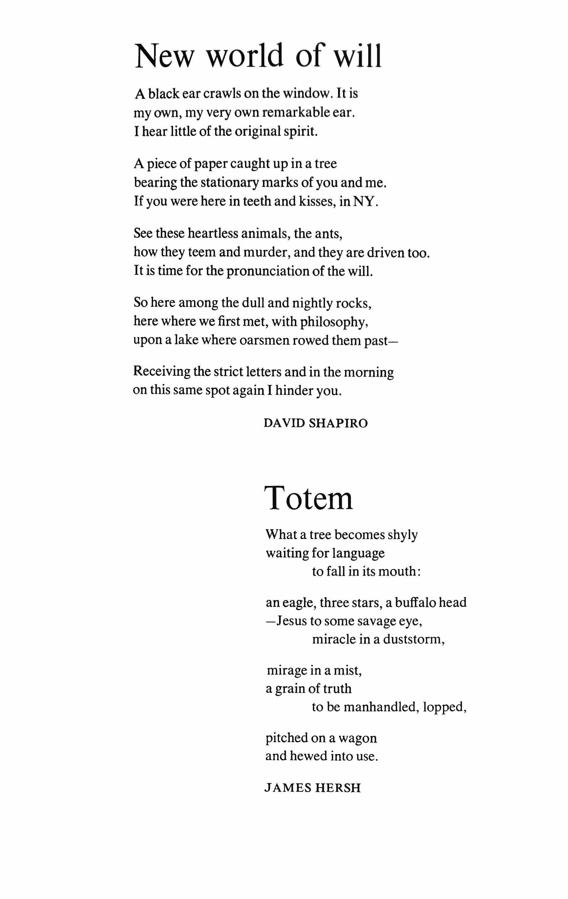 What a tree becomes shyly waiting for language to fall in its mouth: an eagle, three stars, a buffalo head -Jesus to some savage eye, miracle in a duststorm, mirage in a mist, a grain of truth to be manhandled, lopped, pitched on a wagon and hewed into use.