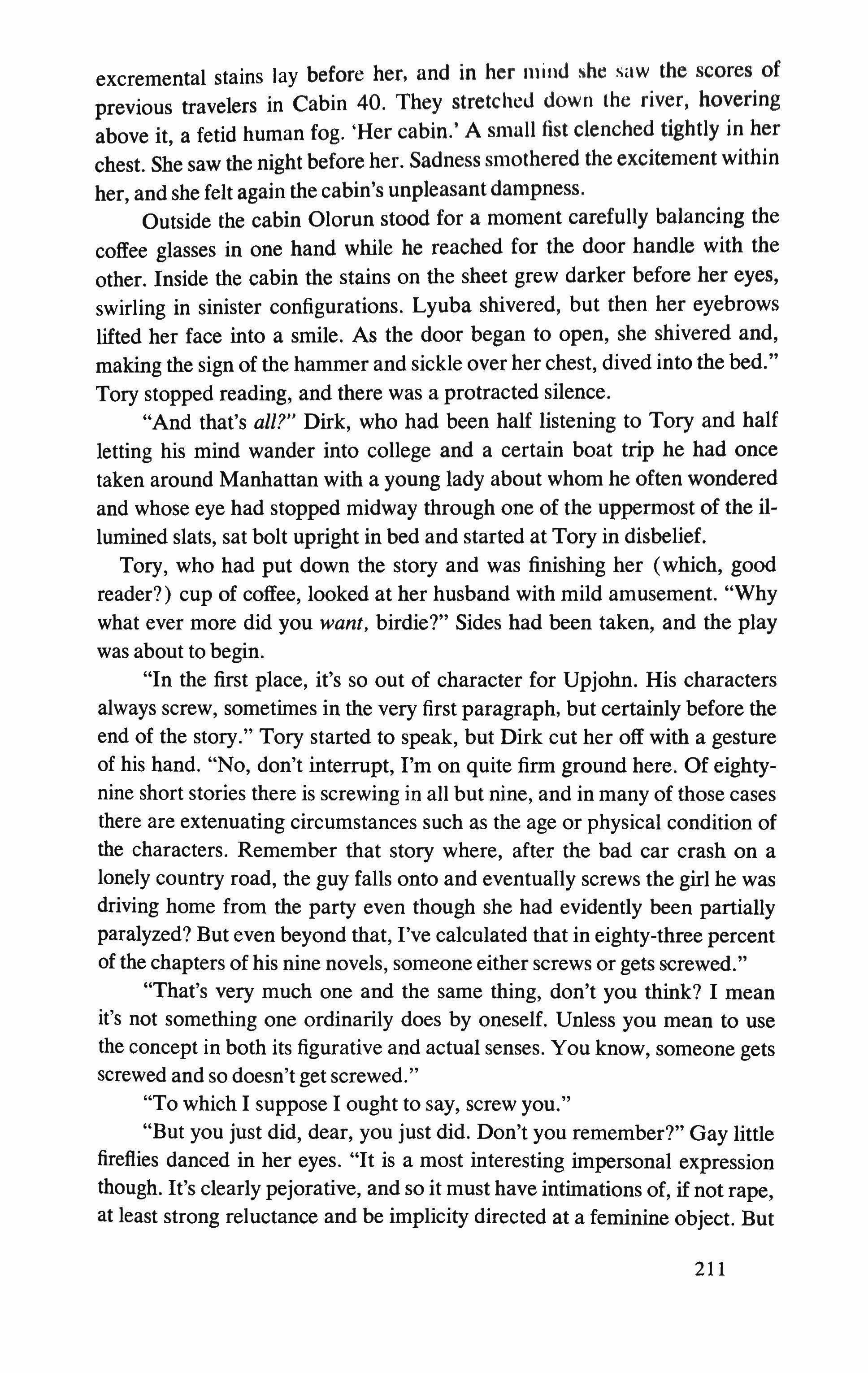 "My great-grandfather on my father's side was stoned to death for infidelity by the people of his own town; my grandmother was stoned to death for fidelity by some Dutch Southwest Afrikaan fathers who wanted their newly public boys initiated; my father was stoned to death for attempting to save a whore from death by stoning on some crazy Grick island; if I stay utterly faithful, avoid, you know, infidelity, I'U be stoned to death."