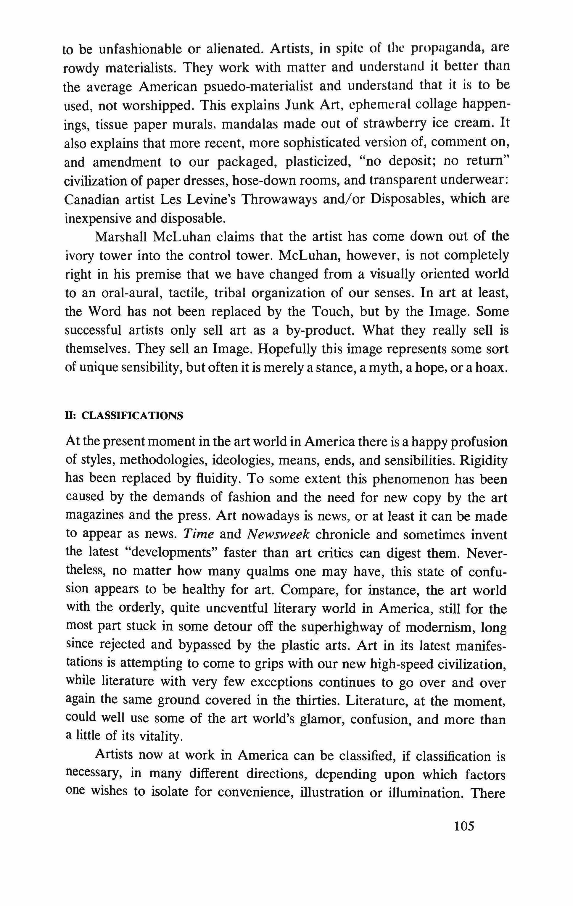 But in balance it seems important to emphasize technique at the expense of spirit, simply because that emphasis seems more likely than the other to give us the canon of concrete works we now lack. (It would perhaps be kinder to say nothing about the literature thus far produced by the Learyites. One general remark: the new San Francisco wave looks like it's rolling away from the harsh aggressive rocks of yore, and washing out instead on the beaches of sentimentalism.)