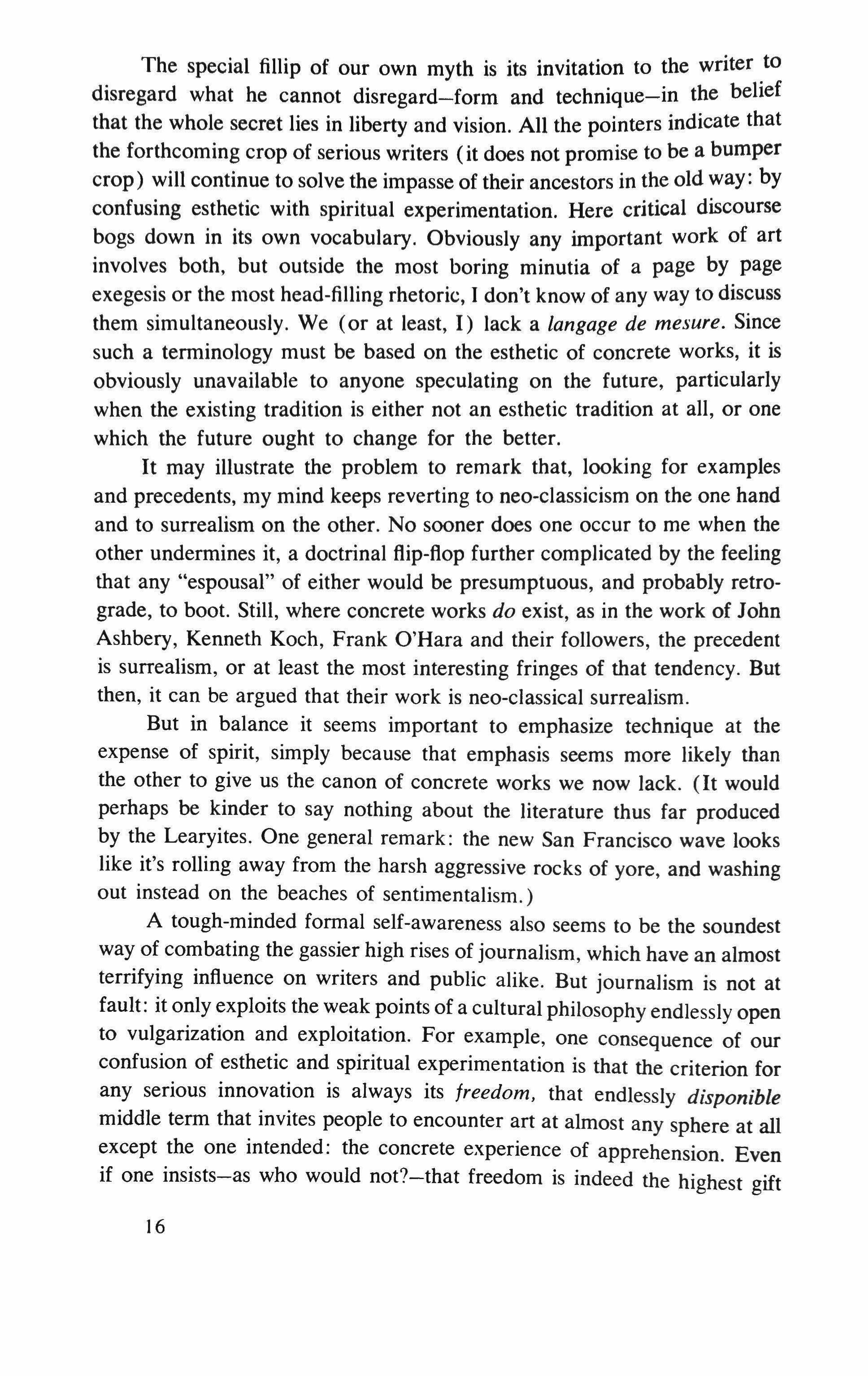 It may illustrate the problem to remark that, looking for examples and precedents, my mind keeps reverting to neo-c1assicism on the one hand and to surrealism on the other. No sooner does one occur to me when the other undermines it, a doctrinal flip-flop further complicated by the feeling that any "espousal" of either would be presumptuous, and probably retrograde, to boot. Still, where concrete works do exist, as in the work of John Ashbery, Kenneth Koch, Frank O'Hara and their followers, the precedent is surrealism, or at least the most interesting fringes of that tendency. But then, it can be argued that their work is neo-c1assical surrealism.