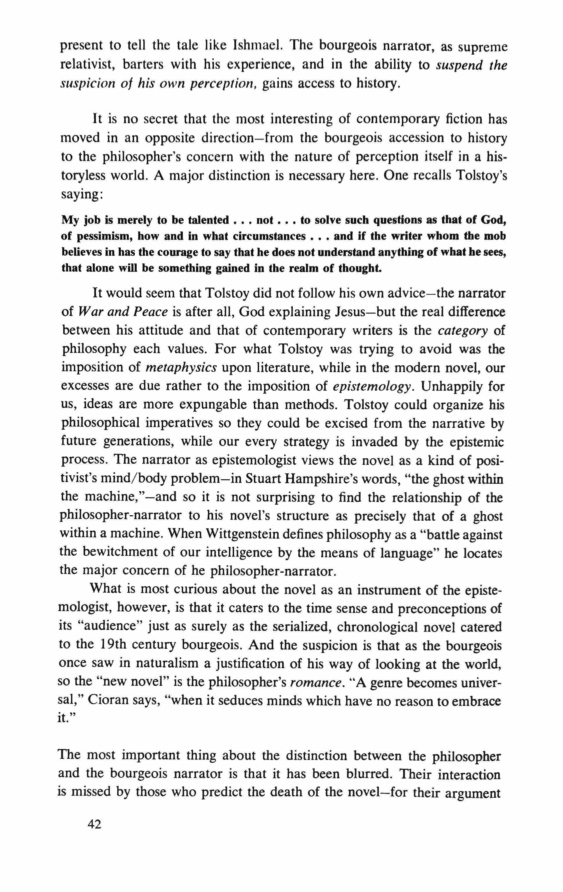 The special fillip of our own myth is its invitation to the writer to disregard what he cannot disregard-form and technique-in the belief that the whole secret lies in liberty and vision. All the pointers indicate that the forthcoming crop of serious writers (it does not promise to be a bumper crop) will continue to solve the impasse of their ancestors in the old way: by confusing esthetic with spiritual experimentation. Here critical discourse bogs down in its own vocabulary. Obviously any important work of art involves both, but outside the most boring minutia of a page by page exegesis or the most head-filling rhetoric, I don't know of any way to discuss them simultaneously. We (or at least, I) lack a langage de mesure, Since such a terminology must be based on the esthetic of concrete works, it is obviously unavailable to anyone speculating on the future, particularly when the existing tradition is either not an esthetic tradition at all, or one which the future ought to change for the better.