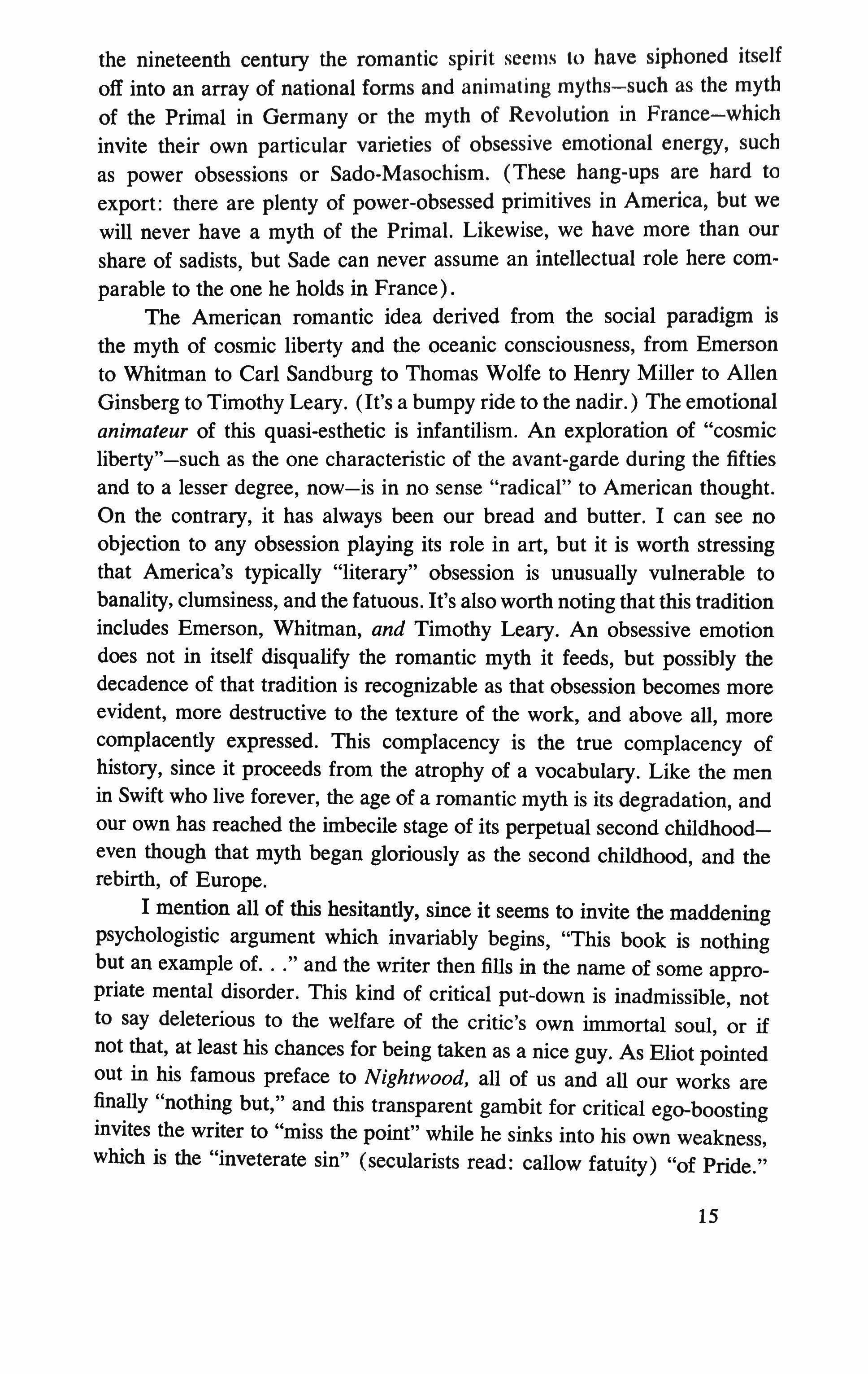 The American romantic idea derived from the social paradigm is the myth of cosmic liberty and the oceanic consciousness, from Emerson to Whitman to Carl Sandburg to Thomas Wolfe to Henry Miller to Allen Ginsberg to Timothy Leary. (It's a bumpy ride to the nadir.) The emotional animateur of this quasi-esthetic is infantilism. An exploration of "cosmic liberty"-such as the one characteristic of the avant-garde during the fifties and to a lesser degree, now-is in no sense "radical" to American thought. On the contrary, it has always been our bread and butter. I can see no objection to any obsession playing its role in art, but it is worth stressing that America's typically "literary" obsession is unusually vulnerable to banality, clumsiness, and the fatuous. It's also worth noting that this tradition includes Emerson, Whitman, and Timothy Leary. An obsessive emotion does not in itself disqualify the romantic myth it feeds, but possibly the decadence of that tradition is recognizable as that obsession becomes more evident, more destructive to the texture of the work, and above all, more complacently expressed. This complacency is the true complacency of history, since it proceeds from the atrophy of a vocabulary. Like the men in Swift who live forever, the age of a romantic myth is its degradation, and our own has reached the imbecile stage of its perpetual second childhoodeven though that myth began gloriously as the second childhood, and the rebirth, of Europe.