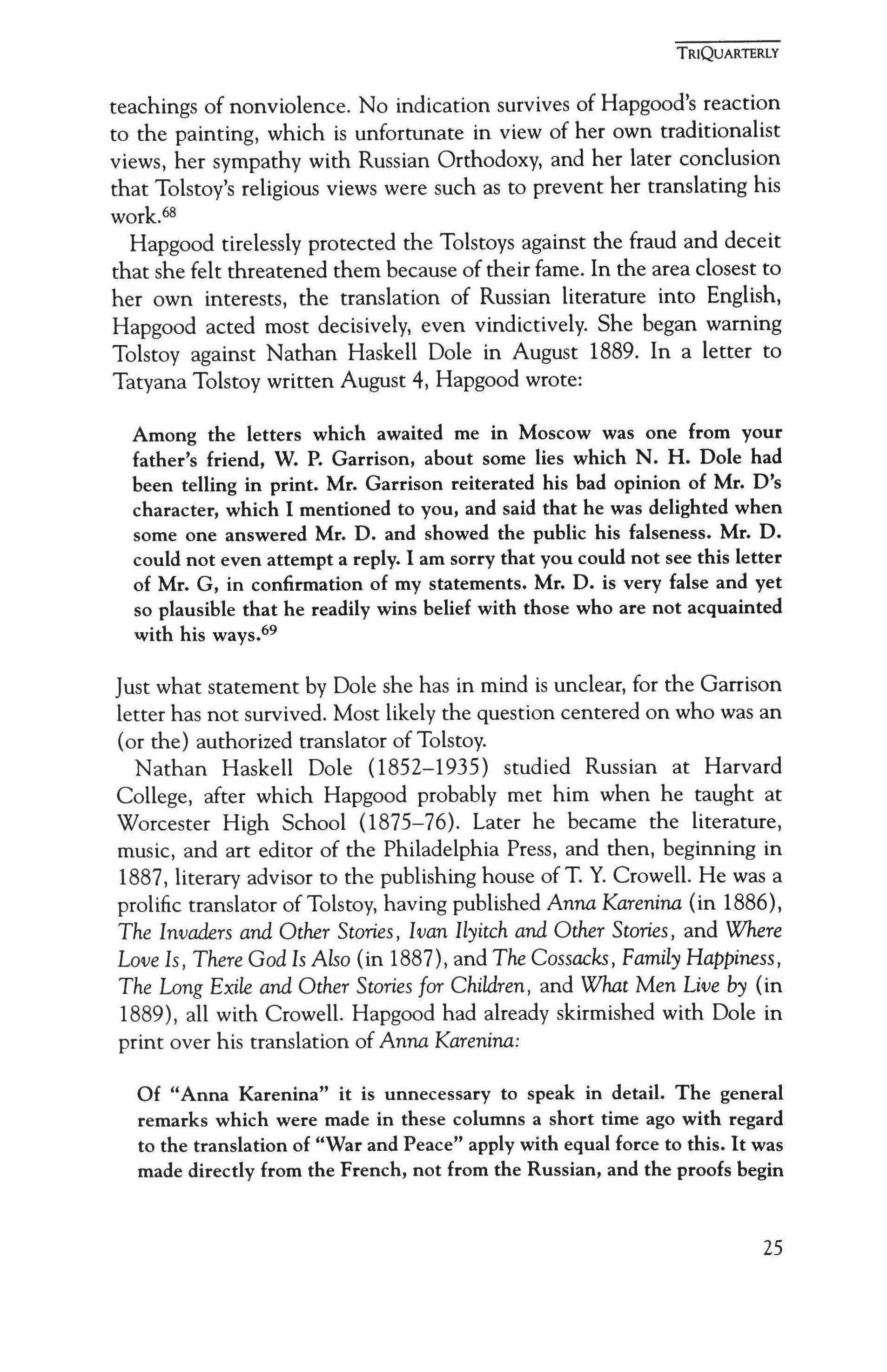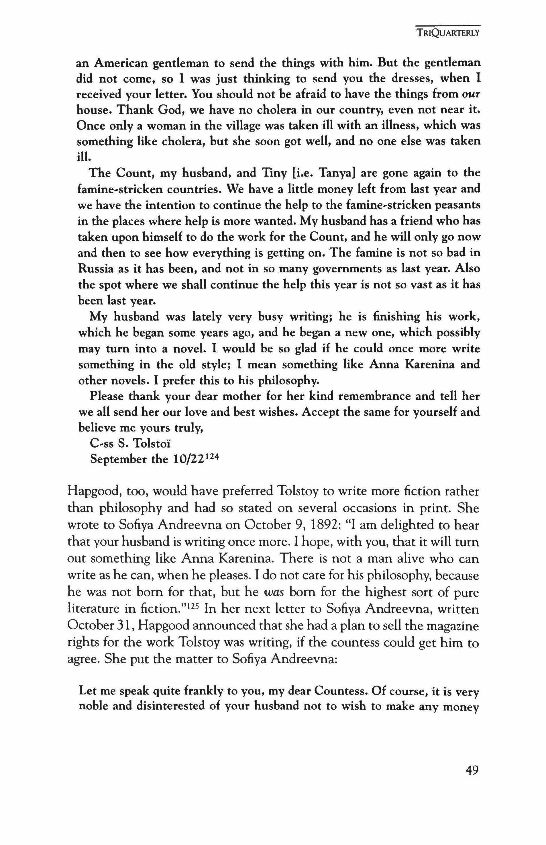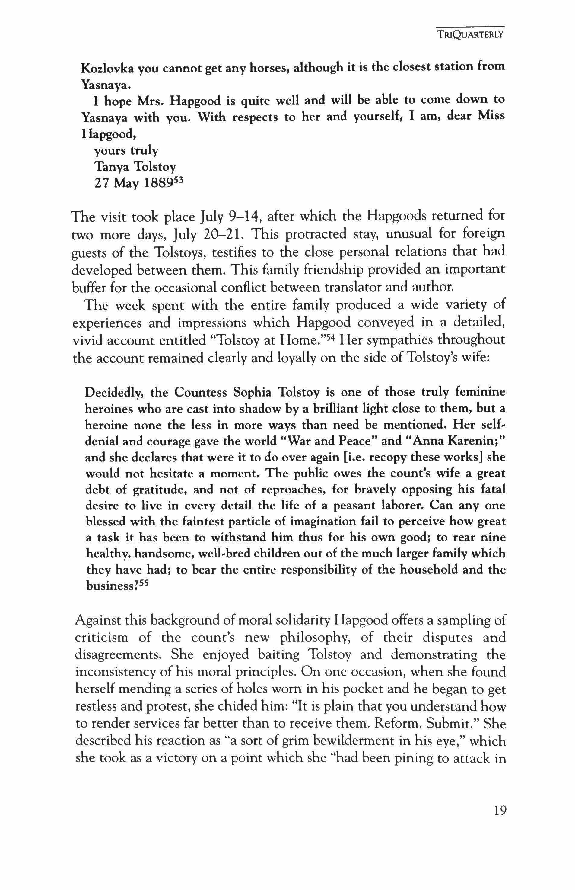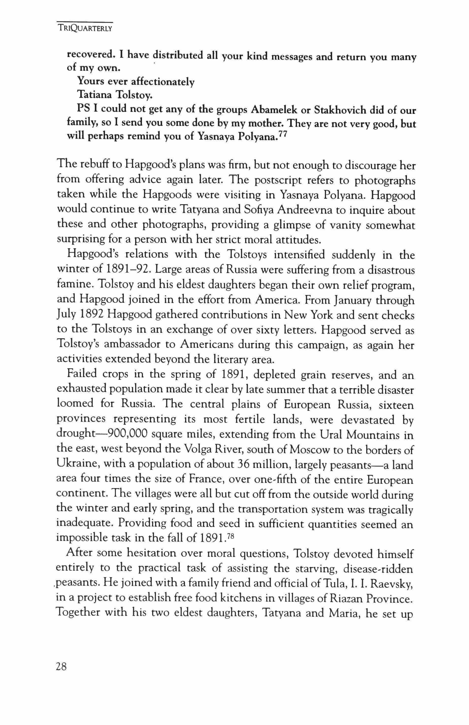 epics (byliny), and the Russian Orthodox liturgy. She also wrote literary criticism, travel commentary, and general features on Russia for newspapers and magazines. Of all Tolstoy's American translators, only Hapgood knew him personally. She became close to the Tolstoy family (120 letters were exchanged between the Tolstoys and Hapgood),I advised Tolstoy's wife and elder daughters on a variety of literary and general subjects, and served as self-designated guardian of the quality of translations and ofTolstoy's public image. Furthermore, Hapgood assisted Tolstoy in alleviating the suffering of Russian peasants during the famine of 1892 by gathering and sending contributions from America. Of all these activities, the most significant remain her translations ofhis fiction and her memoirs of meetings with him and his family in Moscow and at the family estate in Yashaya Polyana.