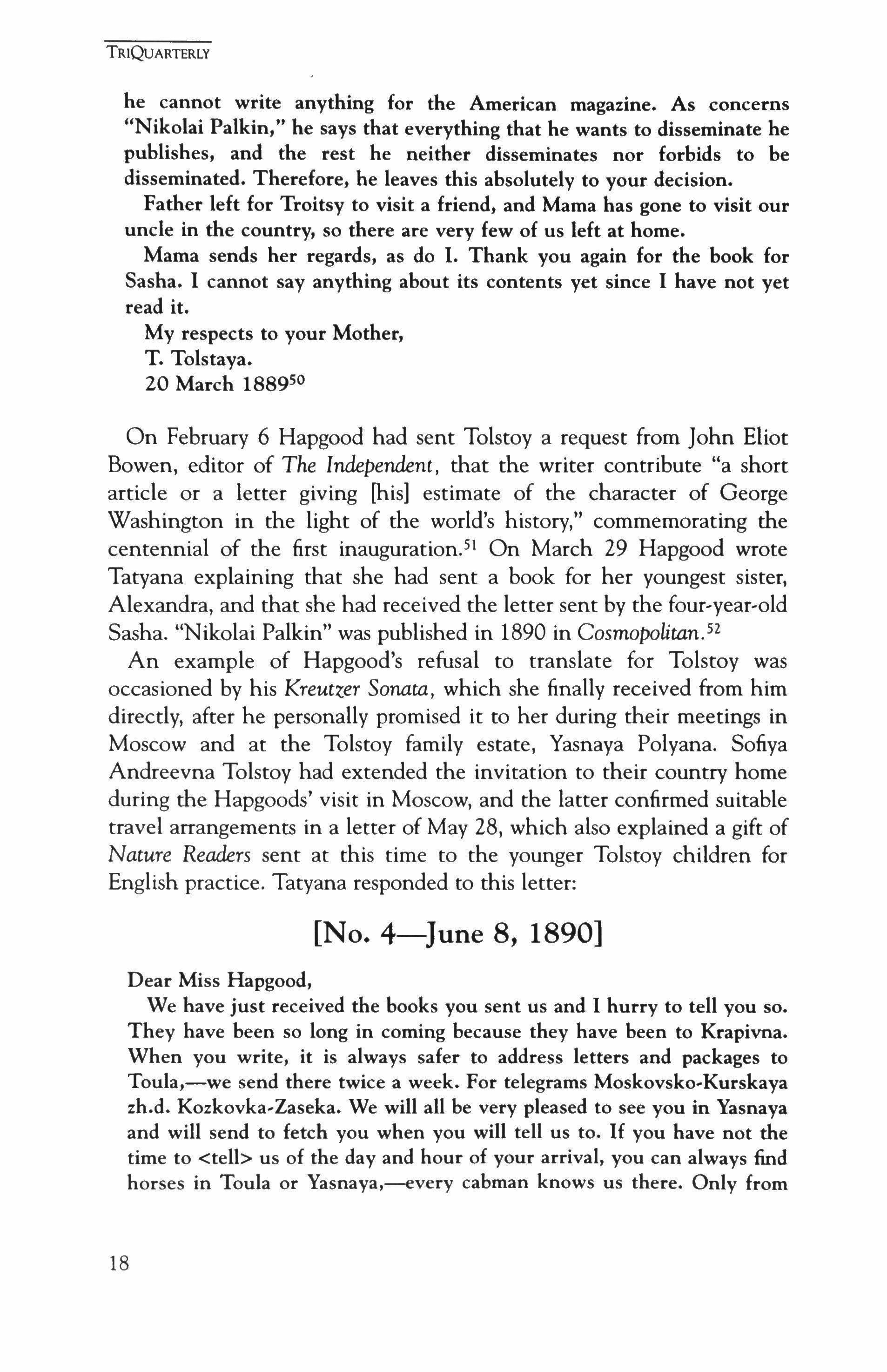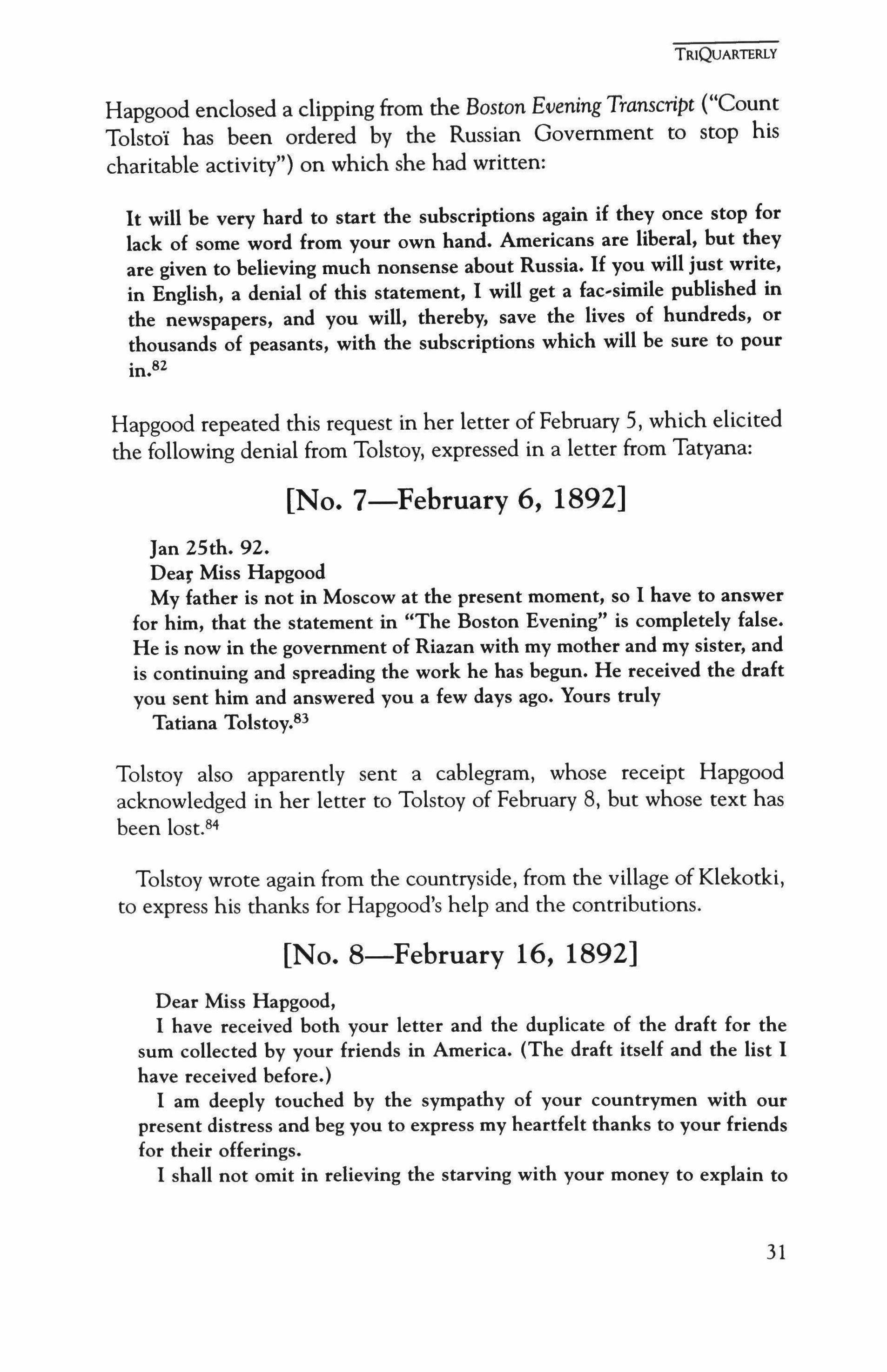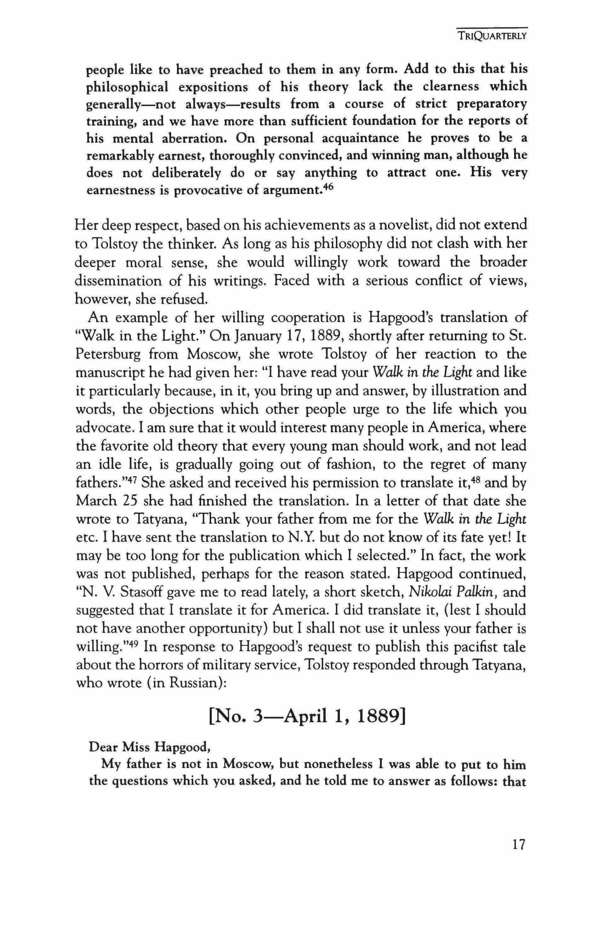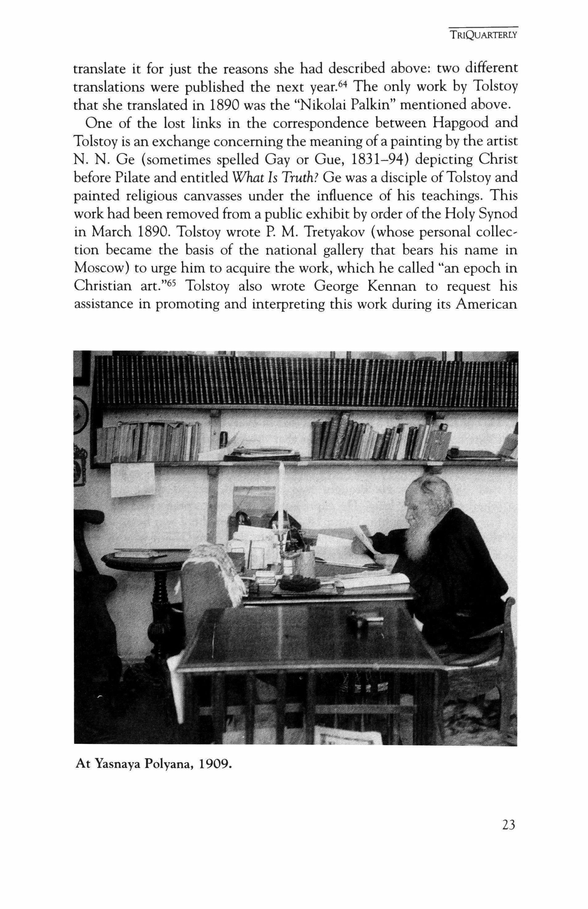 epics (byliny), and the Russian Orthodox liturgy. She also wrote literary criticism, travel commentary, and general features on Russia for newspapers and magazines. Of all Tolstoy's American translators, only Hapgood knew him personally. She became close to the Tolstoy family (120 letters were exchanged between the Tolstoys and Hapgood),I advised Tolstoy's wife and elder daughters on a variety of literary and general subjects, and served as self-designated guardian of the quality of translations and ofTolstoy's public image. Furthermore, Hapgood assisted Tolstoy in alleviating the suffering of Russian peasants during the famine of 1892 by gathering and sending contributions from America. Of all these activities, the most significant remain her translations ofhis fiction and her memoirs of meetings with him and his family in Moscow and at the family estate in Yashaya Polyana.