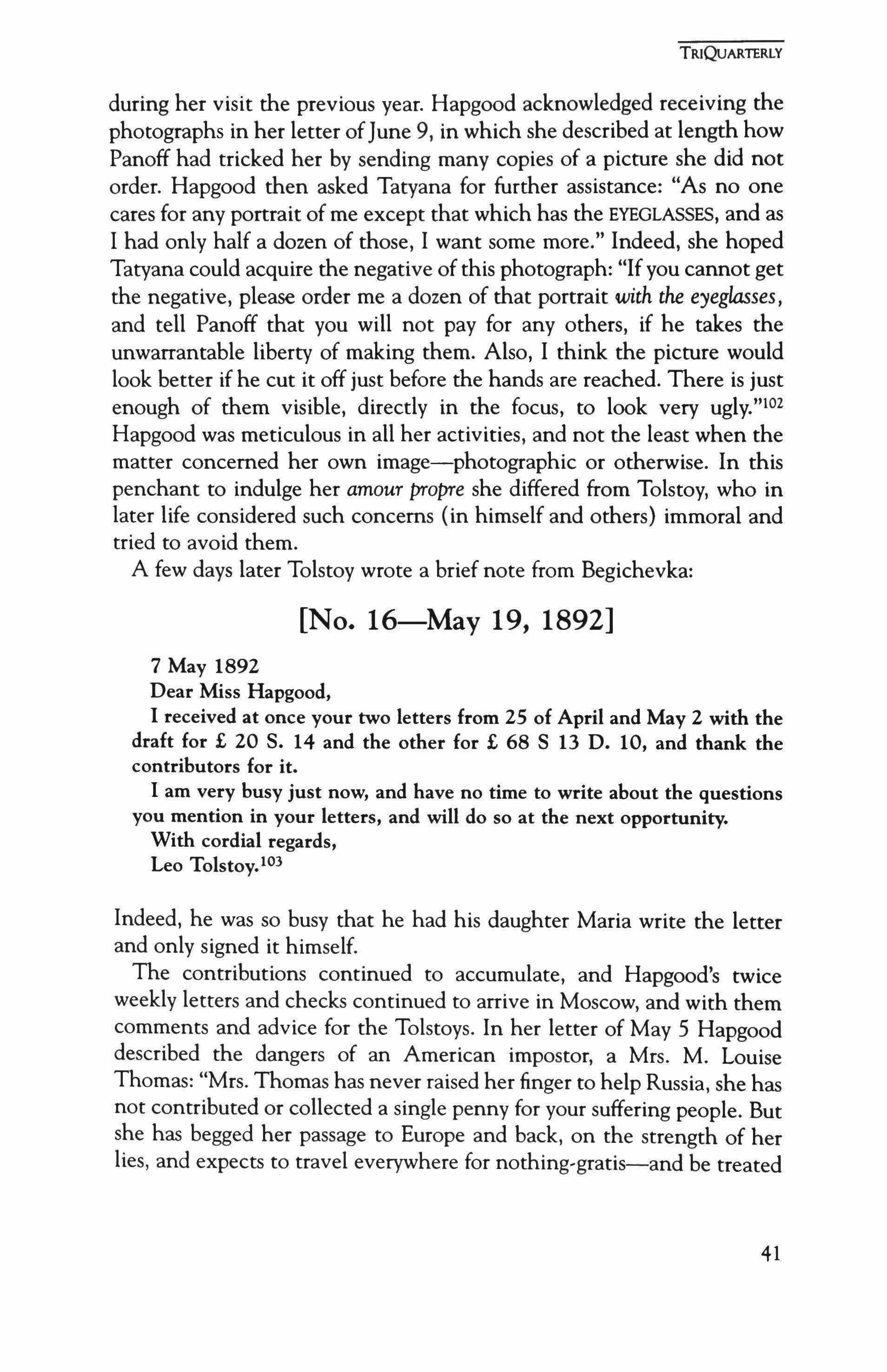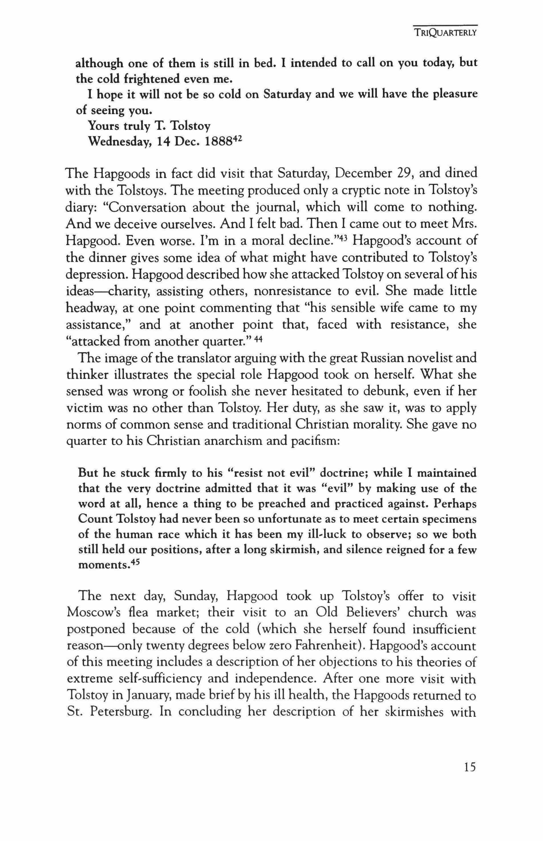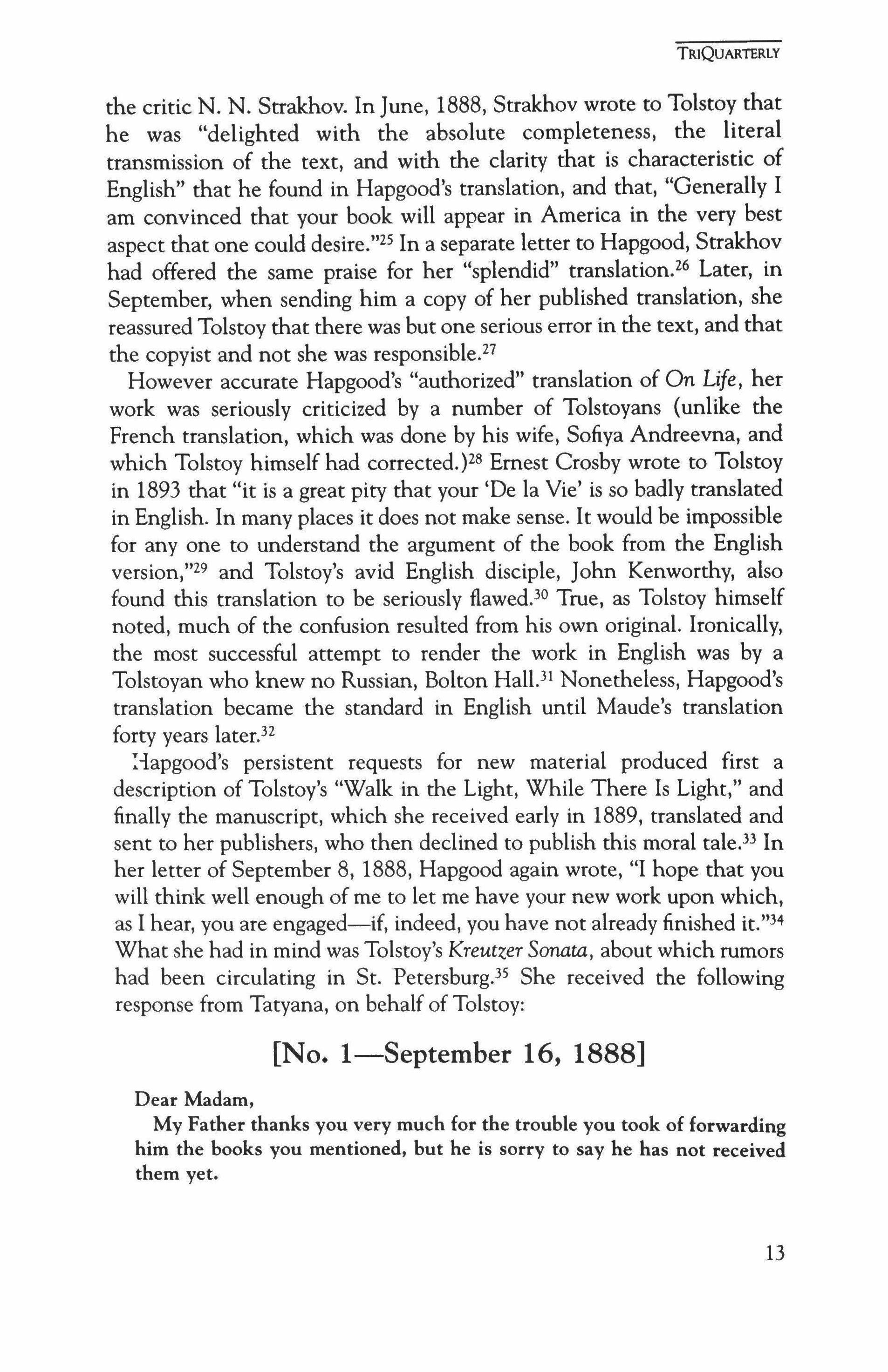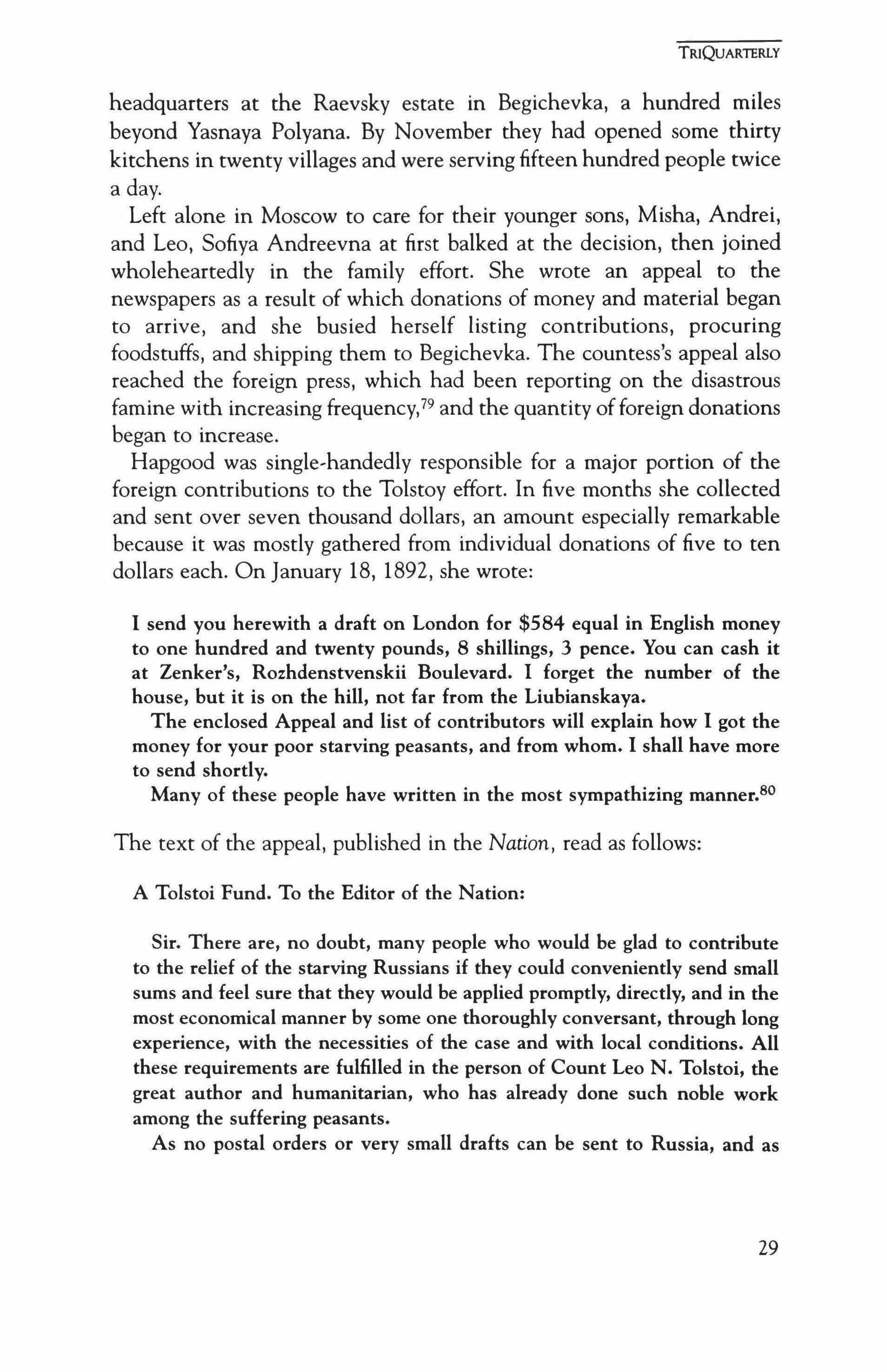 epics (byliny), and the Russian Orthodox liturgy. She also wrote literary criticism, travel commentary, and general features on Russia for newspapers and magazines. Of all Tolstoy's American translators, only Hapgood knew him personally. She became close to the Tolstoy family (120 letters were exchanged between the Tolstoys and Hapgood),I advised Tolstoy's wife and elder daughters on a variety of literary and general subjects, and served as self-designated guardian of the quality of translations and ofTolstoy's public image. Furthermore, Hapgood assisted Tolstoy in alleviating the suffering of Russian peasants during the famine of 1892 by gathering and sending contributions from America. Of all these activities, the most significant remain her translations ofhis fiction and her memoirs of meetings with him and his family in Moscow and at the family estate in Yashaya Polyana.