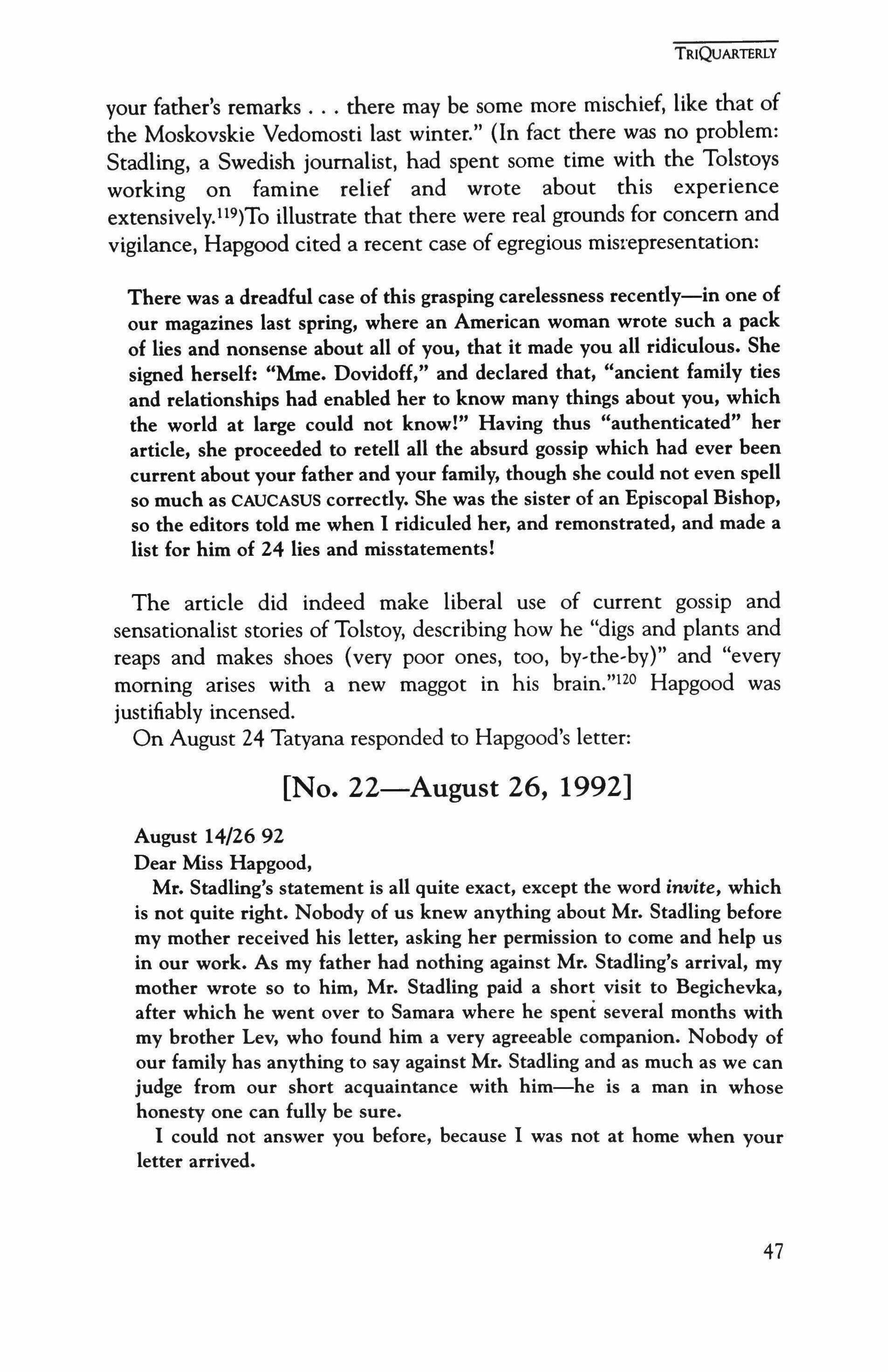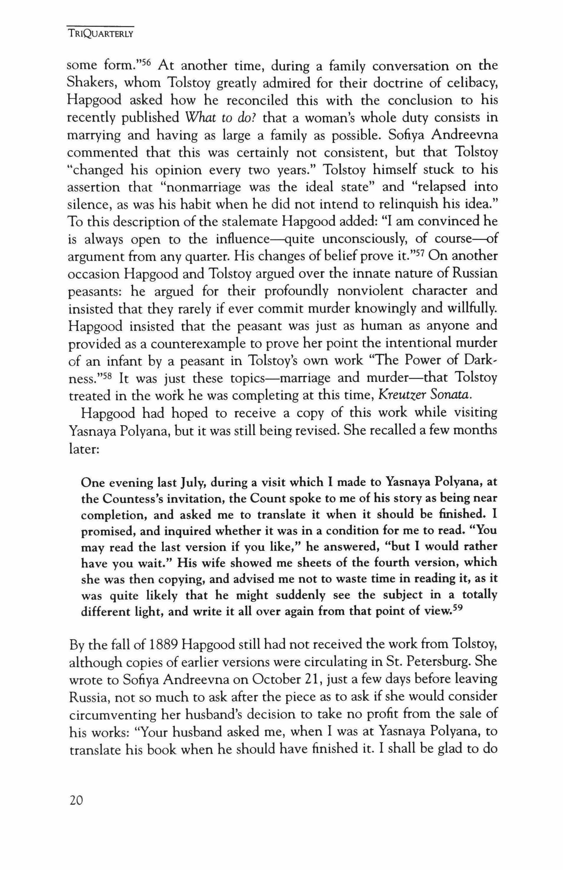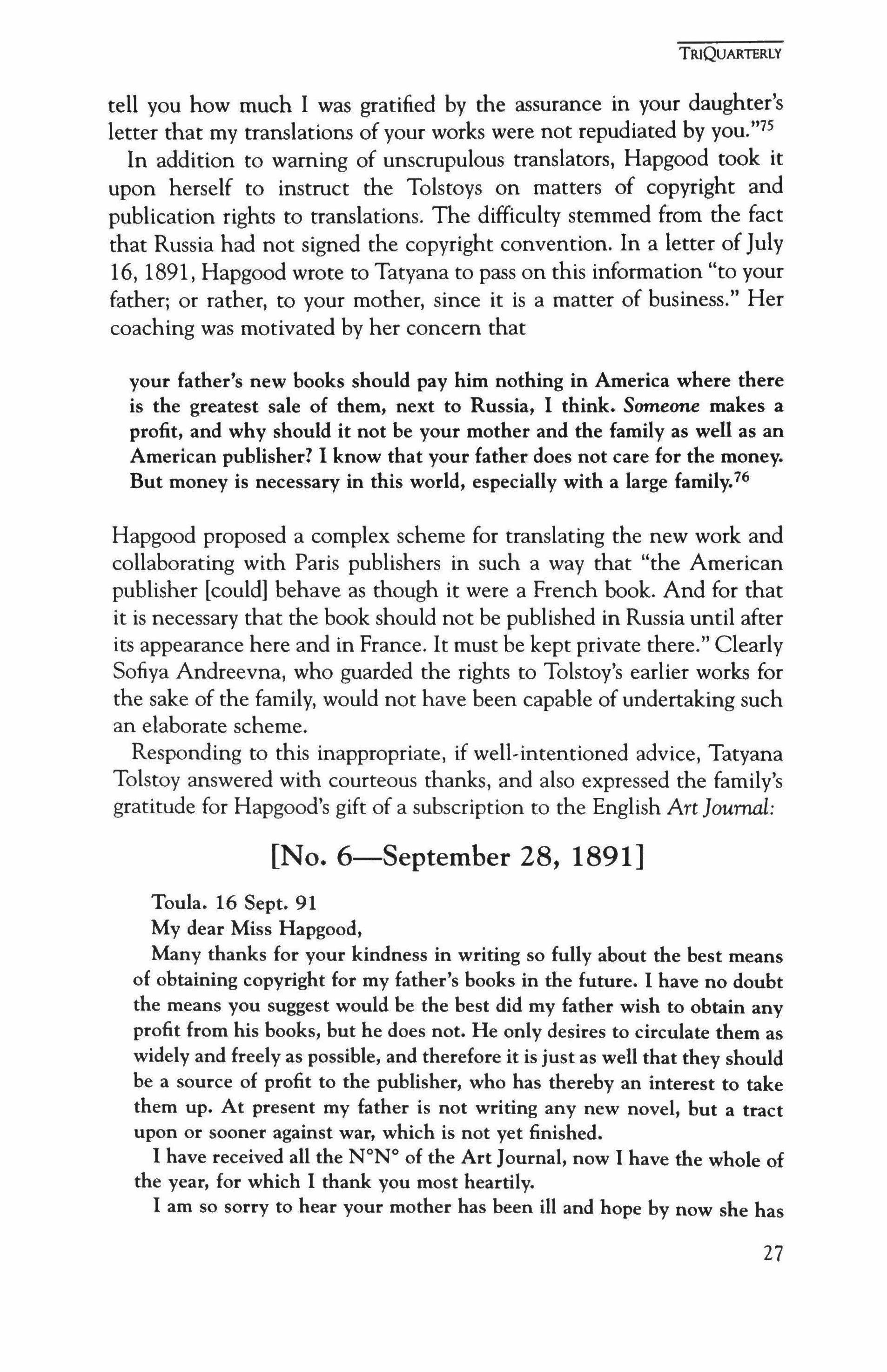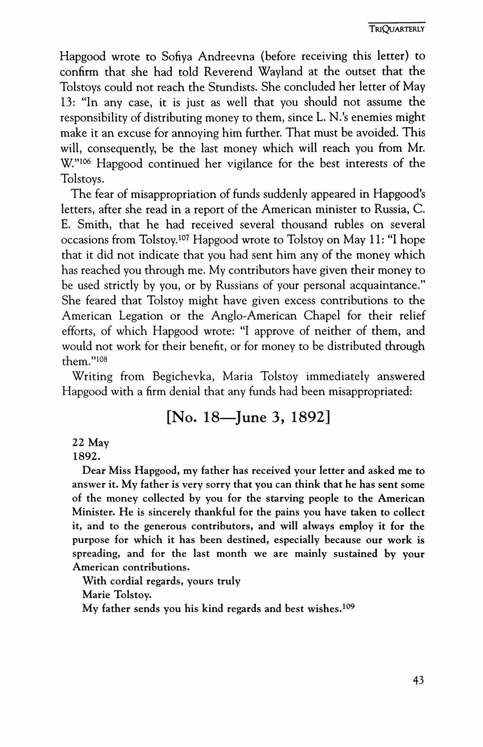 epics (byliny), and the Russian Orthodox liturgy. She also wrote literary criticism, travel commentary, and general features on Russia for newspapers and magazines. Of all Tolstoy's American translators, only Hapgood knew him personally. She became close to the Tolstoy family (120 letters were exchanged between the Tolstoys and Hapgood),I advised Tolstoy's wife and elder daughters on a variety of literary and general subjects, and served as self-designated guardian of the quality of translations and ofTolstoy's public image. Furthermore, Hapgood assisted Tolstoy in alleviating the suffering of Russian peasants during the famine of 1892 by gathering and sending contributions from America. Of all these activities, the most significant remain her translations ofhis fiction and her memoirs of meetings with him and his family in Moscow and at the family estate in Yashaya Polyana.